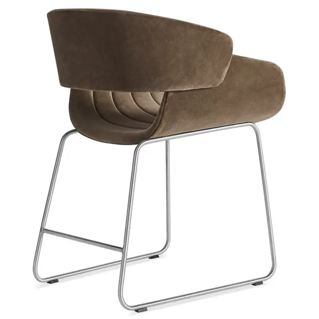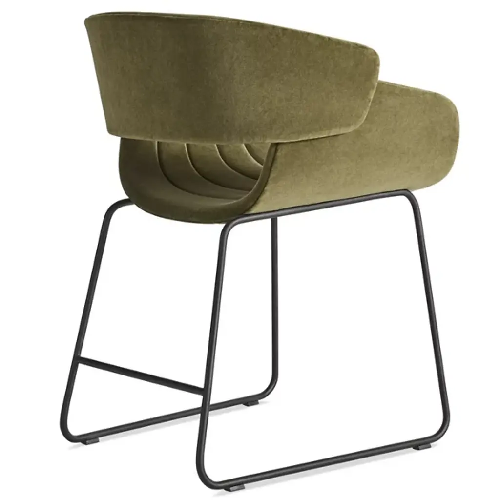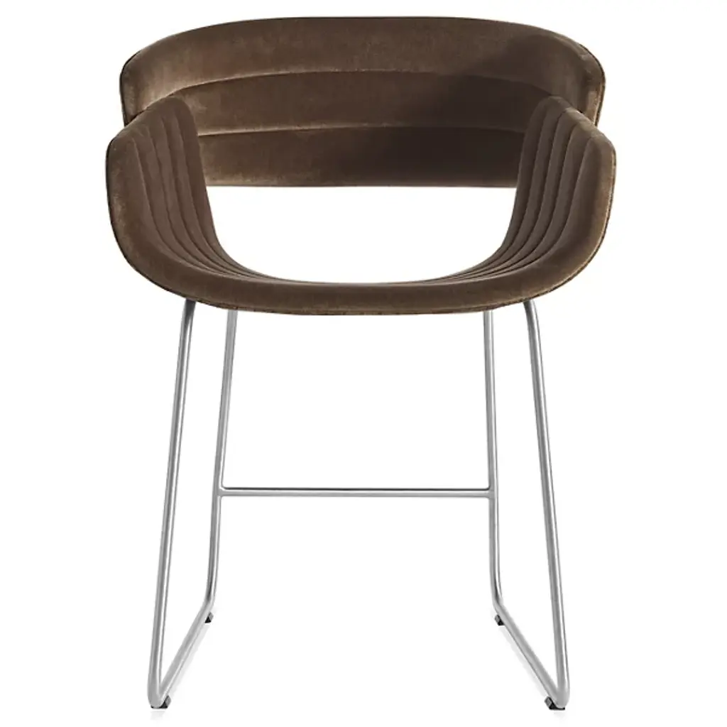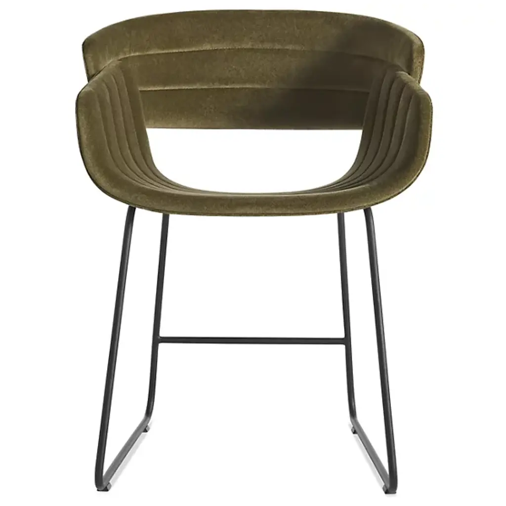 Clean, elegant, playful. The Racer Dining Chair from Blu Dot caresses your body like the bucket seat of an Italian supercar. It instantly catches your eye with a series of curves. Channel-stitched polyester applied to an overlapping back and seat rest flow from side to side with stylish flair. Filled with soft padding, the channel-stitched piece pleases as it wraps around one’s figure for a nestled feel. A minimalist steel base gives the soft polyester seat the appearance as if floating in the air. In a sled design, the base draws an eye-catching pair of graphic shapes.