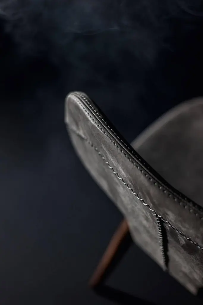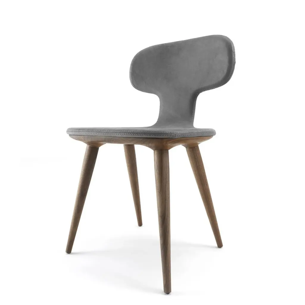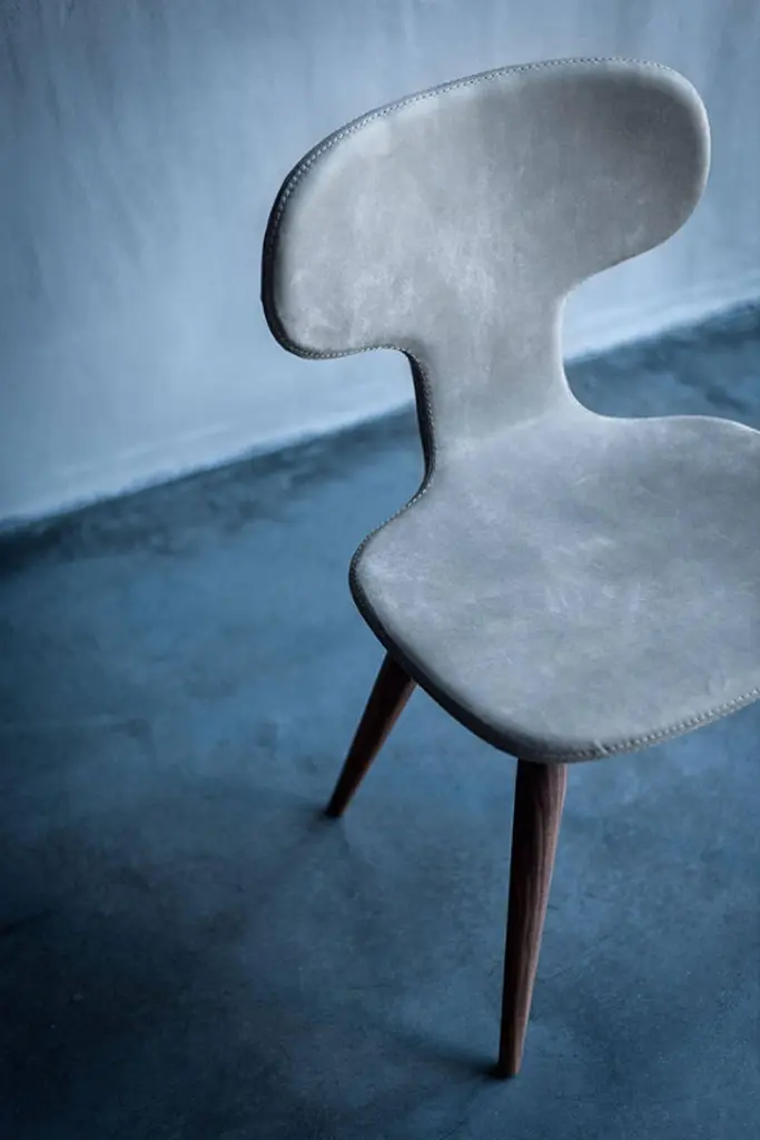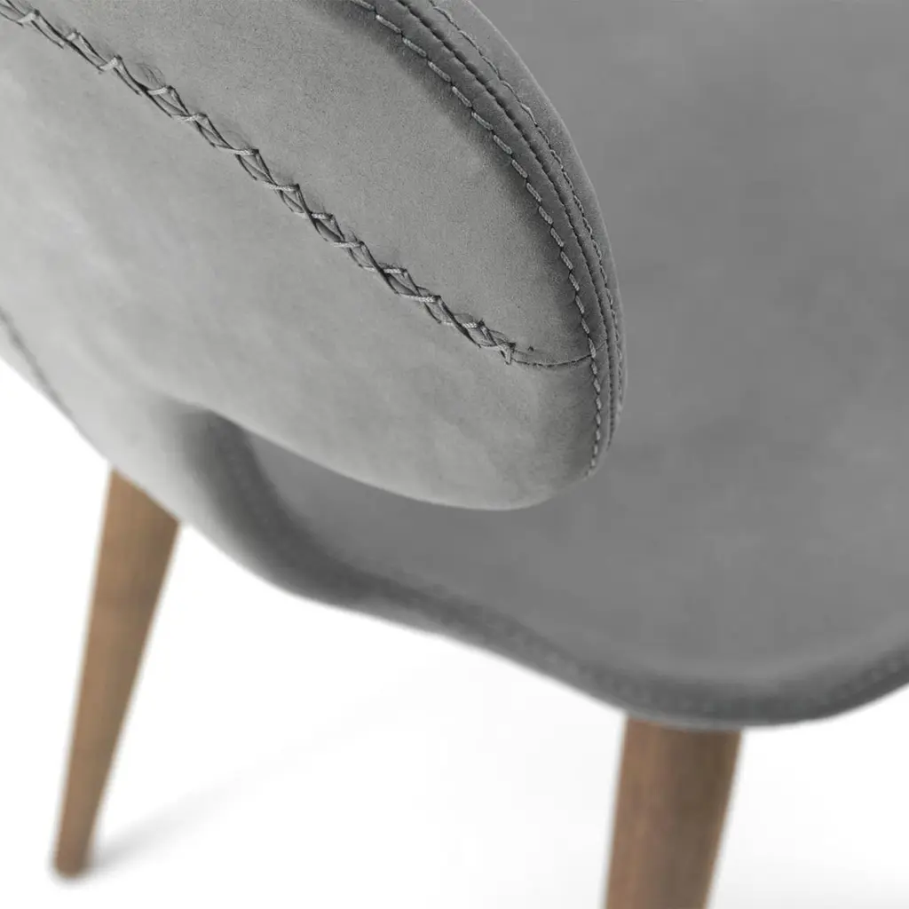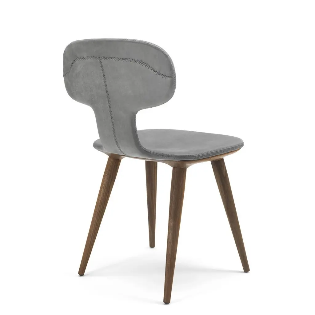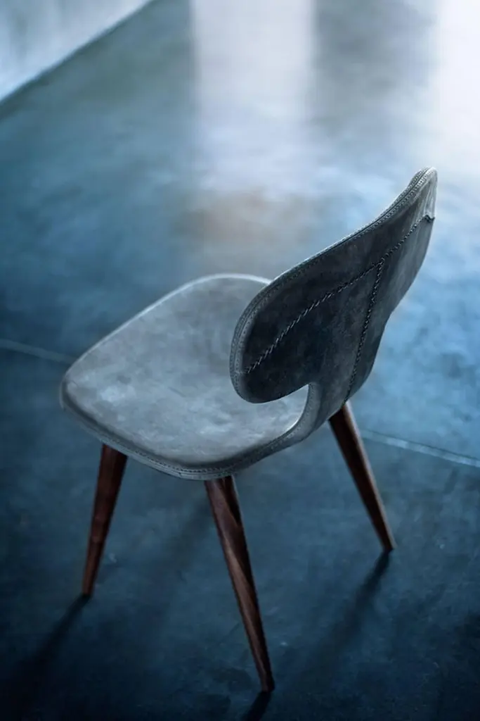 Dining chair racing with grey genuine leather made with sinuous and enveloping forms, visible stitching, with solid walnut wood shaped structure. Wood treated withnatural wax of vegetable origin with pine extracts finish. Also available with brown or black genuine leather.