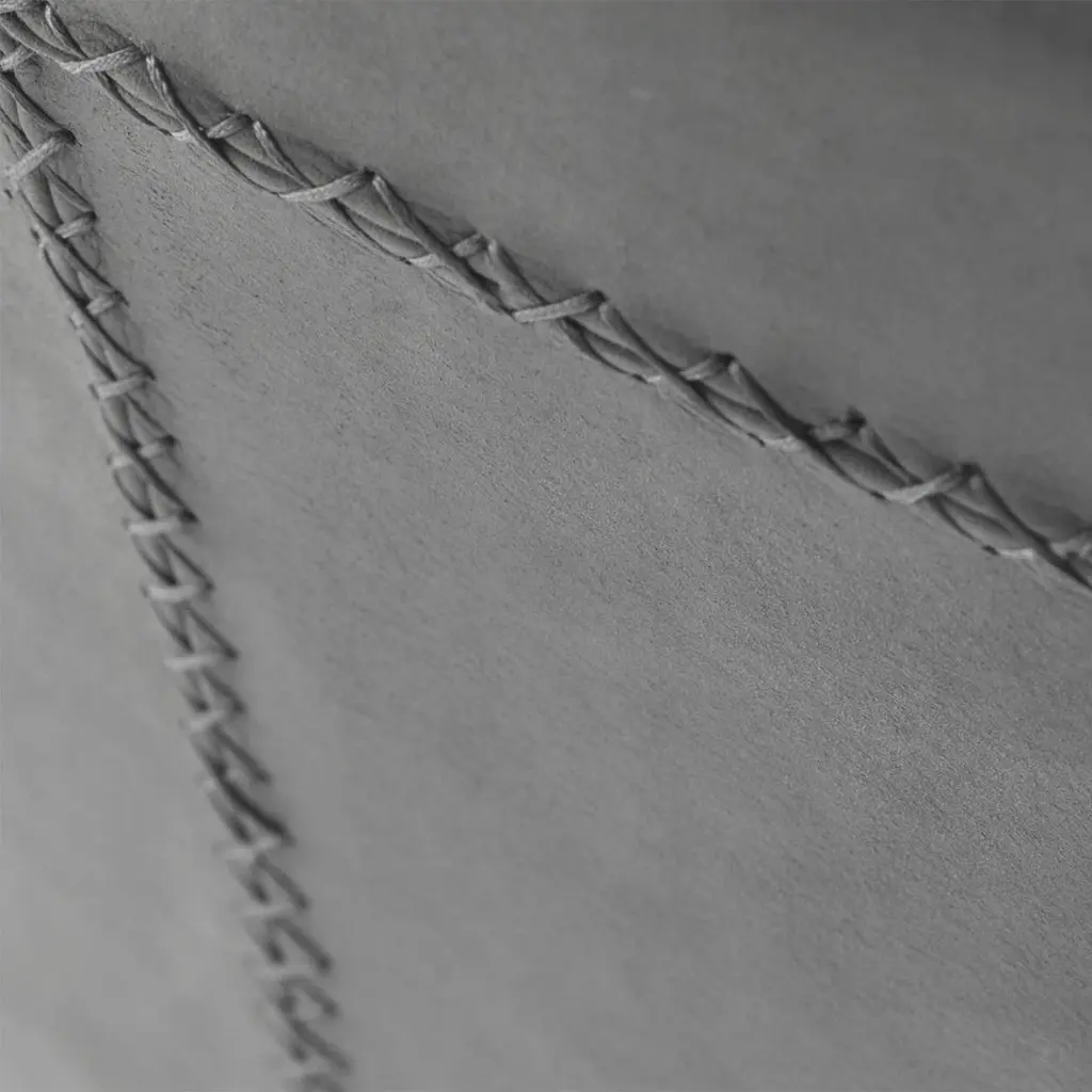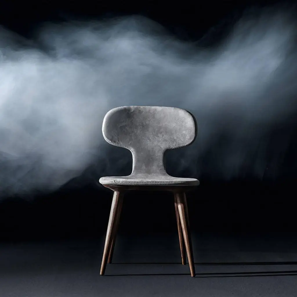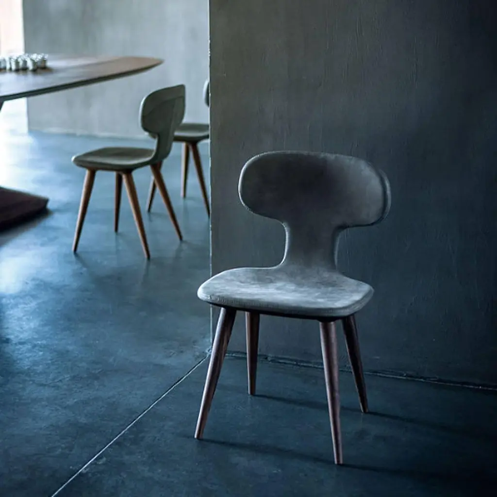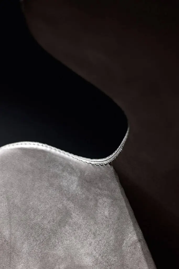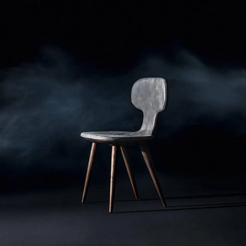 Dining chair racing with grey genuine leather made with sinuous and enveloping forms, visible stitching, with solid walnut wood shaped structure. Wood treated withnatural wax of vegetable origin with pine extracts finish. Also available with brown or black genuine leather.