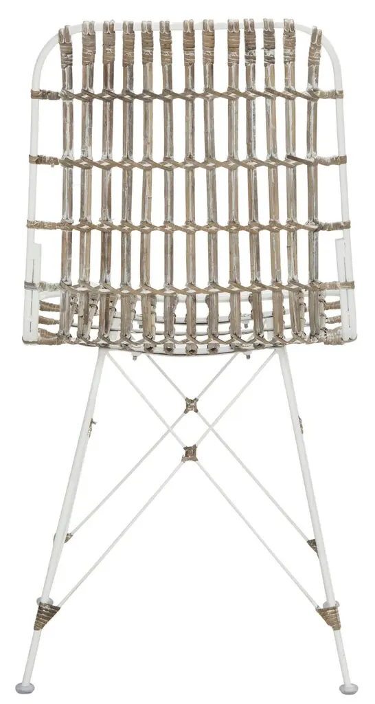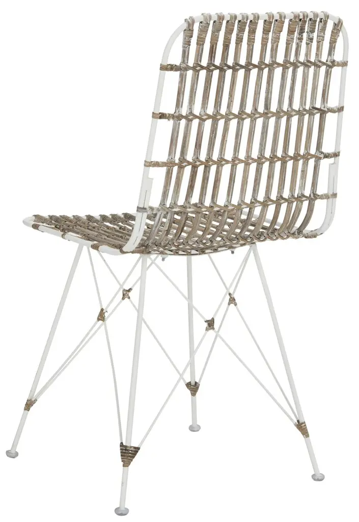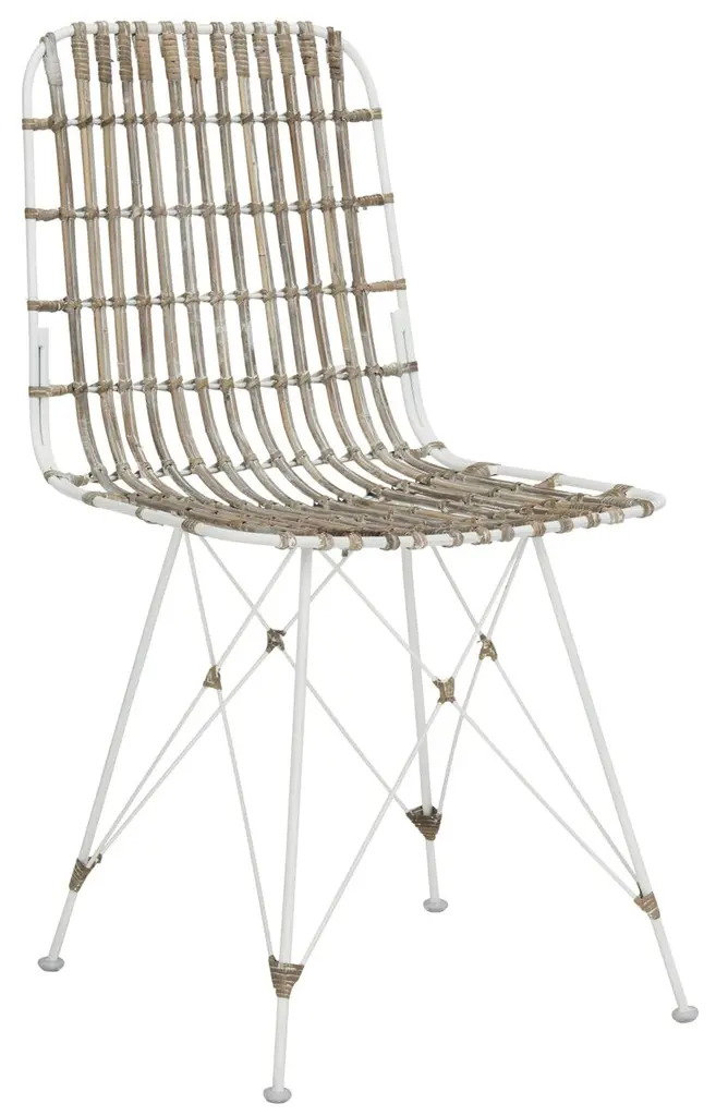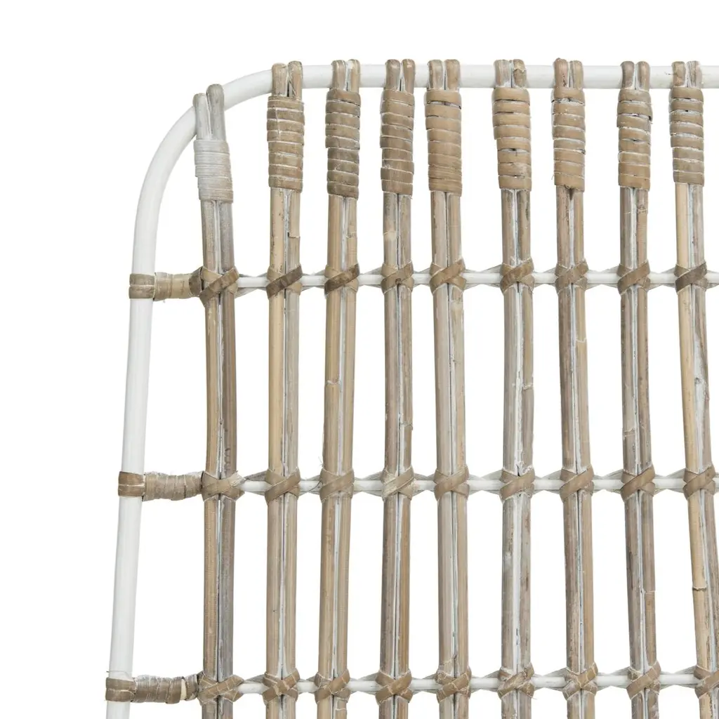 These chairs are crafted of iron with sculpted, architectural legs and seats made of bound Kubu rattan. A whitewash finish completes the look.