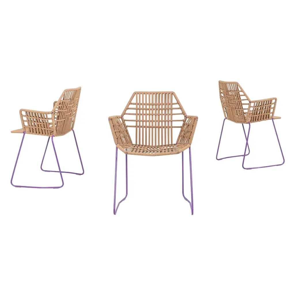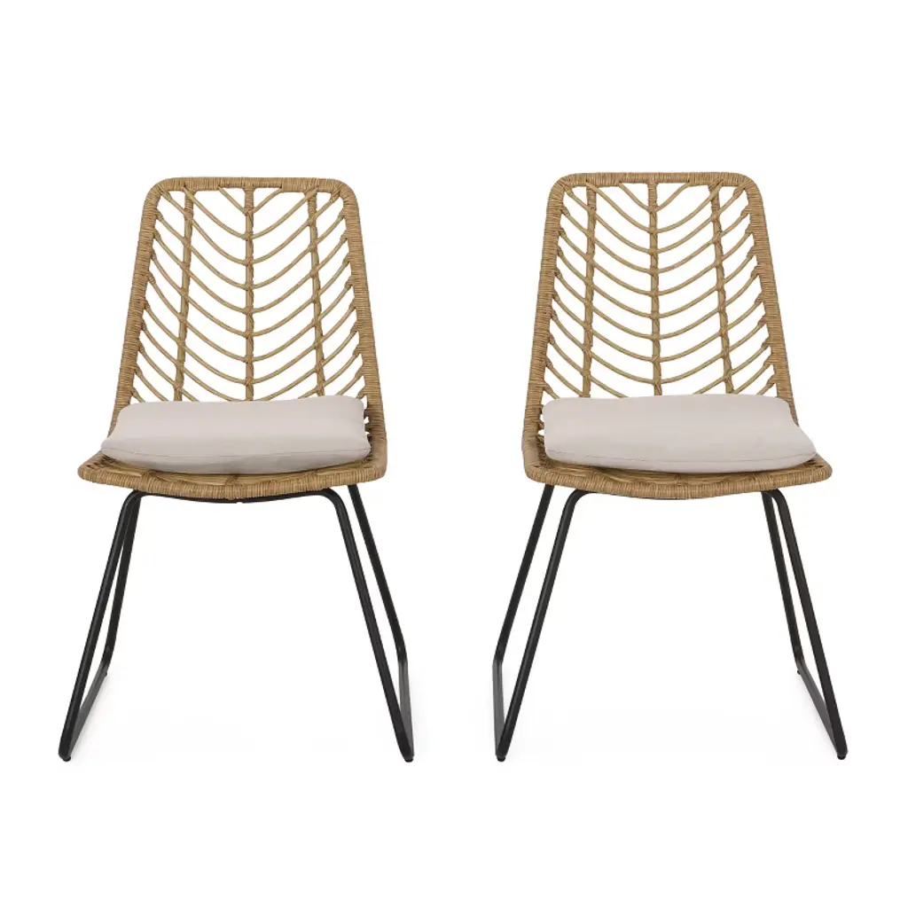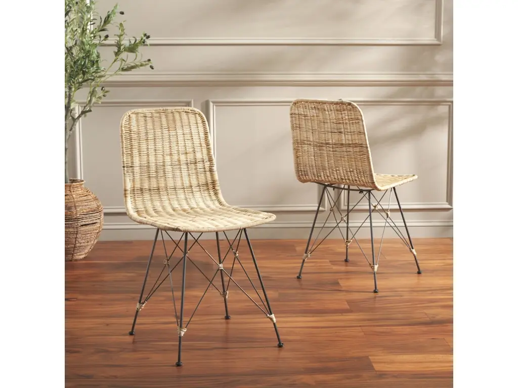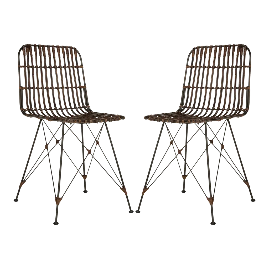 These chairs are crafted of iron with sculpted, architectural legs and seats made of bound Kubu rattan. A whitewash finish completes the look.