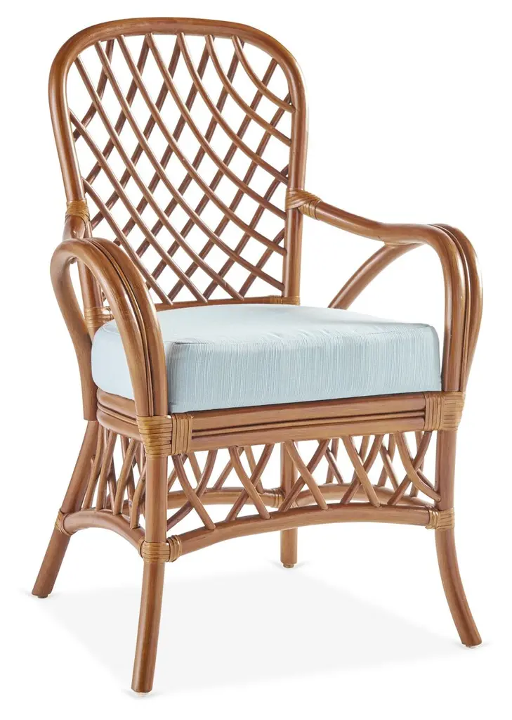 The dining chair is stylish and fun with a unique design that is easily paired with a wood or rattan dining table. Select a fabric and finish to customize for your dining space!