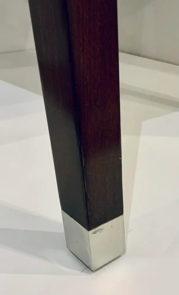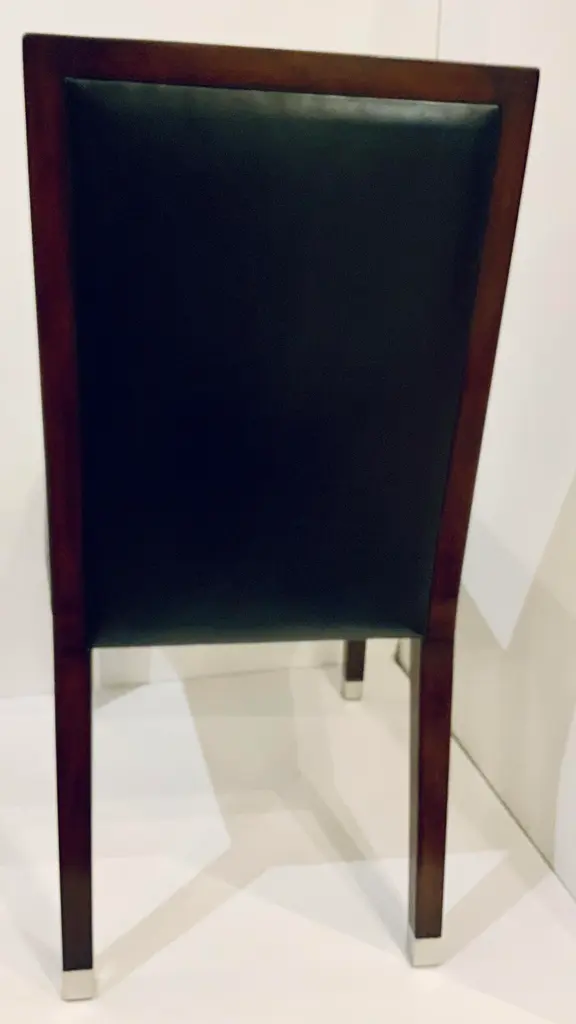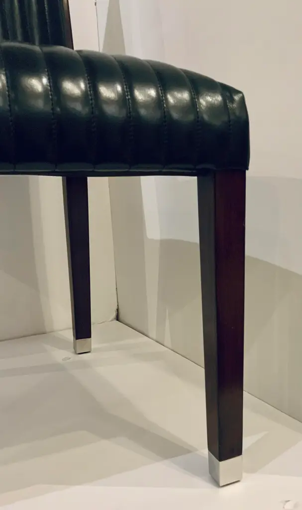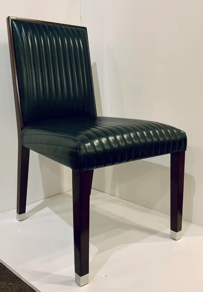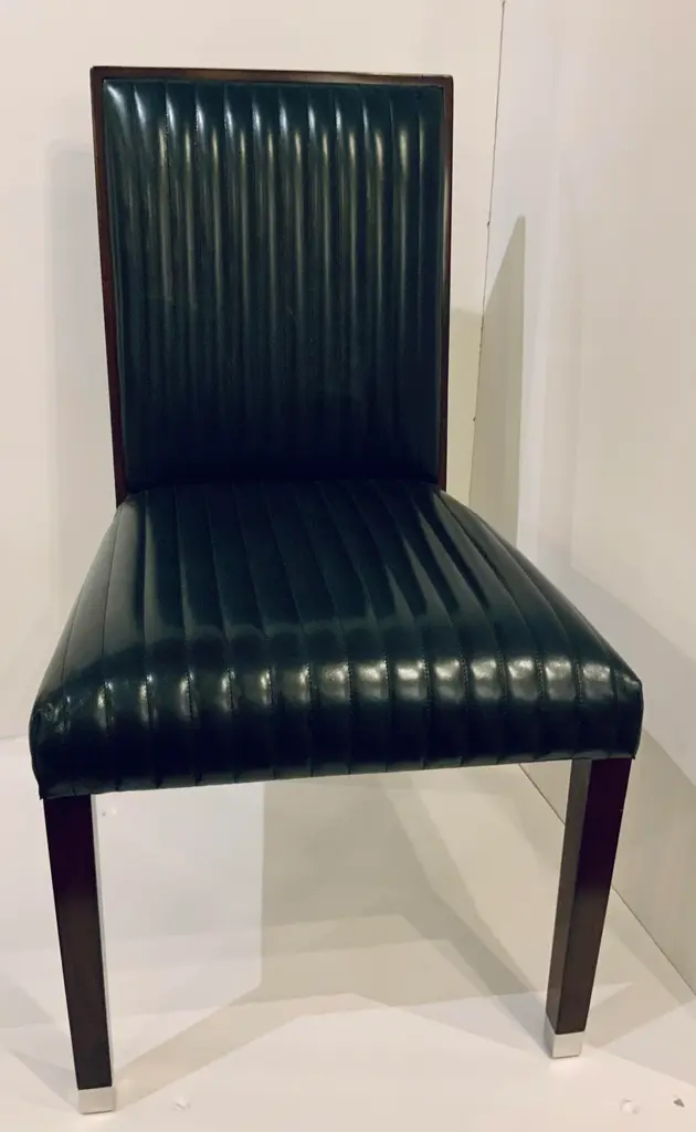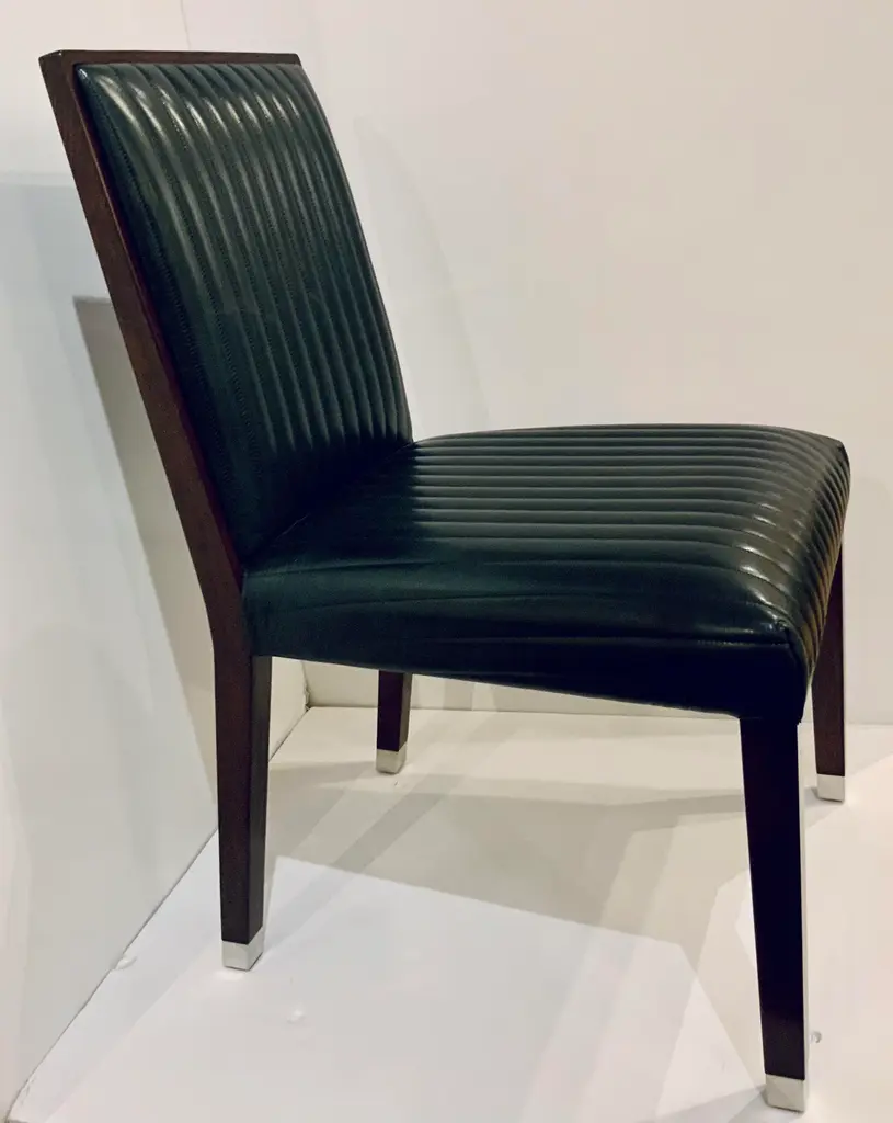 Original Retail $4345, stylish Ralph Lauren Transitional Dark Green Leather Parker Leather Side Chair, dark walnut finished wood frames with chrome finished ferrules, elegant perfectly stitched, showroom floor sample