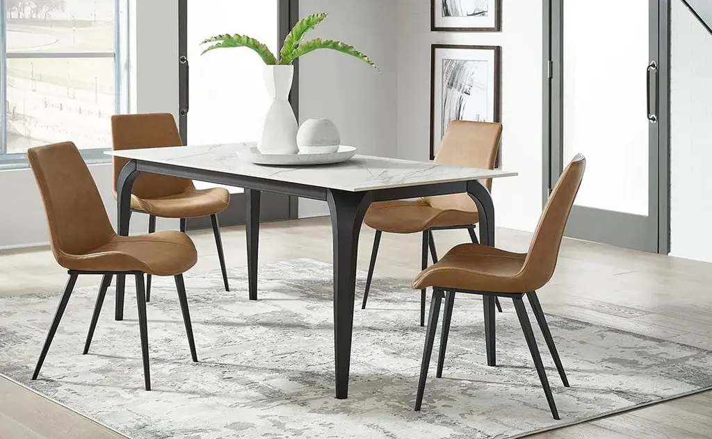 The Ralston Side Chair (sold as a set of 2) pairs sleek steel legs with buttery vegan leather to create an inviting, modern silhouette. Dine in style and comfort with its ergonomically pitched scoop seat with a high-density foam layer to guarantee top-tier sitting support. While originally designed to accompany the Ralston dining tables, this chic chair pairs well with any modern dining table.
