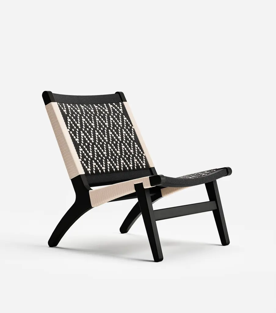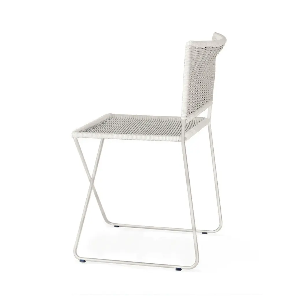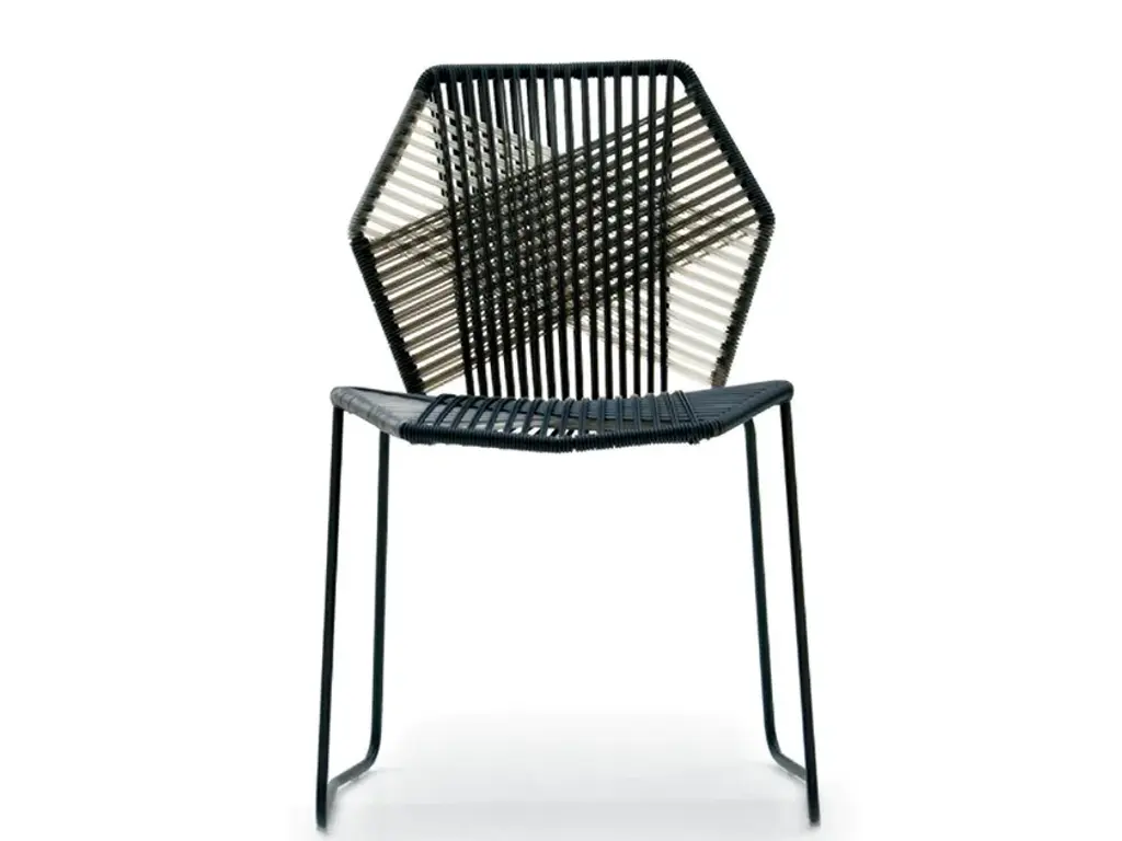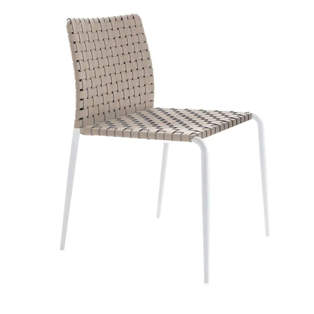 A metal-framed chair with a white or natural wicker seat and backrest which is easily movable and stackable. Its arrangement, which largely involves a continuous rod, means that the only space taken up is the actual chair size, with no other protrusions from its four edges. The backrest, straight at the bottom and curved at the top, supports the back and gives protection to the kidneys, allowing for extensive periods of comfy seating. At the front, under the seat, the metal bar is arranged in the shape of an X, bearing the user’s weight structurally as the frame flexes. Features
