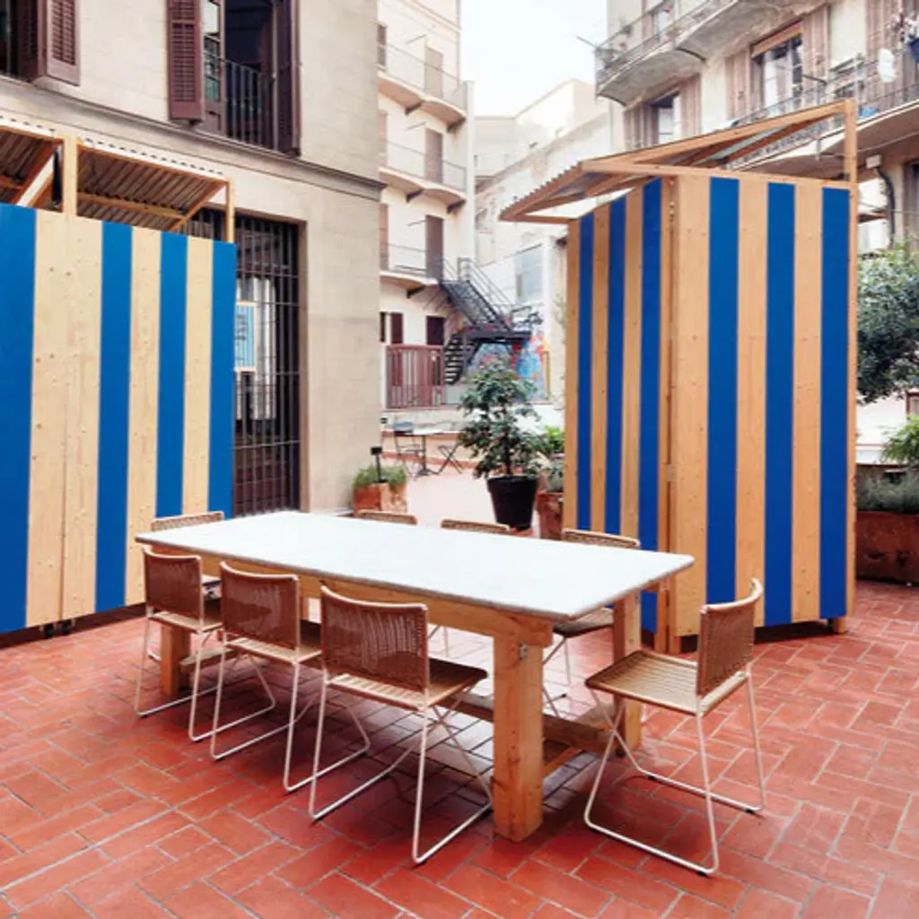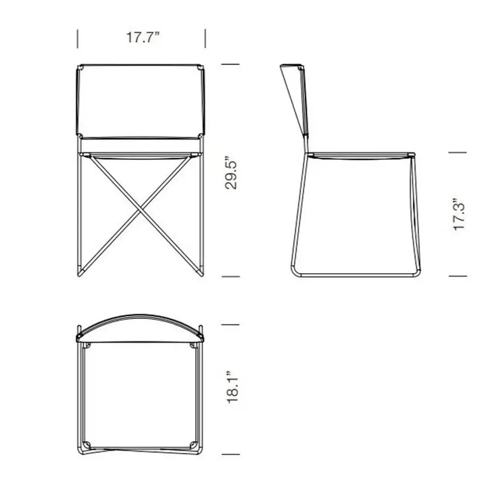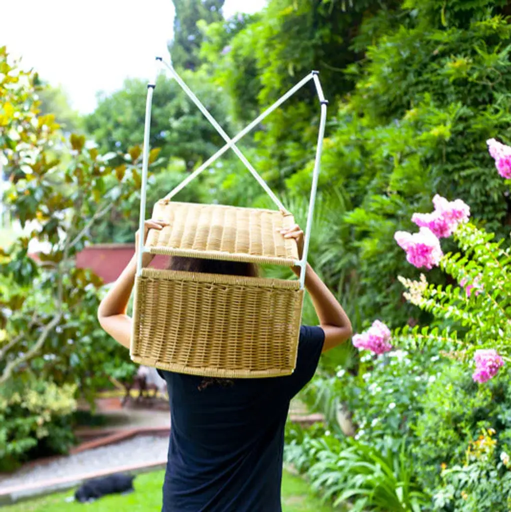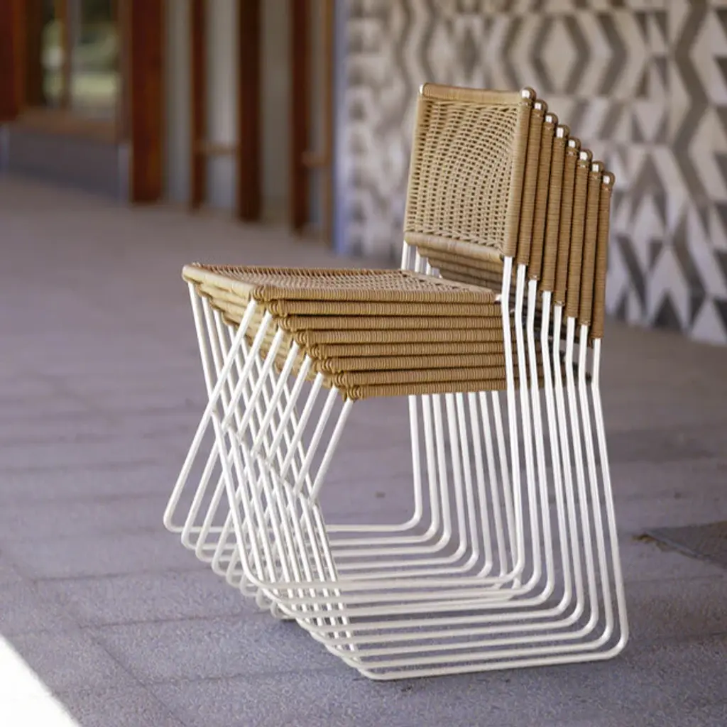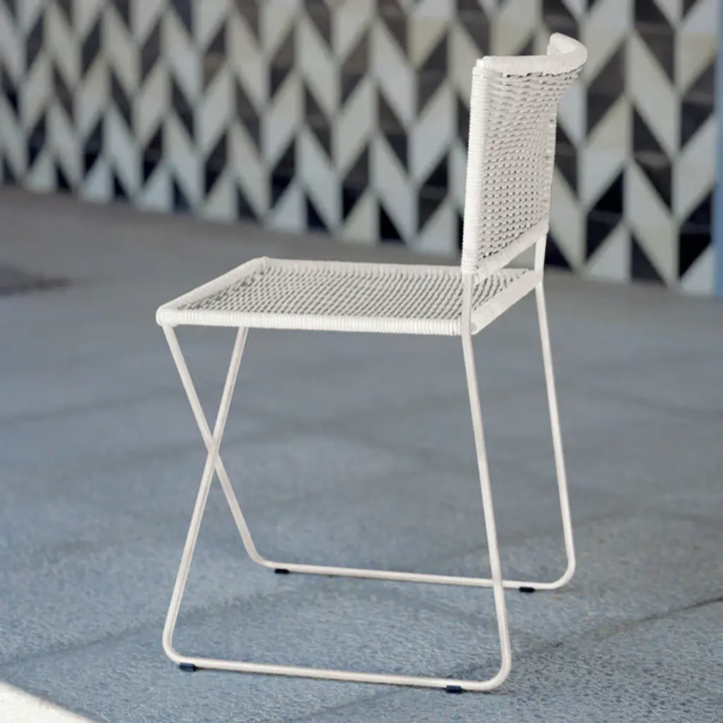 A metal-framed chair with a white or natural wicker seat and backrest which is easily movable and stackable. Its arrangement, which largely involves a continuous rod, means that the only space taken up is the actual chair size, with no other protrusions from its four edges. The backrest, straight at the bottom and curved at the top, supports the back and gives protection to the kidneys, allowing for extensive periods of comfy seating. At the front, under the seat, the metal bar is arranged in the shape of an X, bearing the user’s weight structurally as the frame flexes. Features