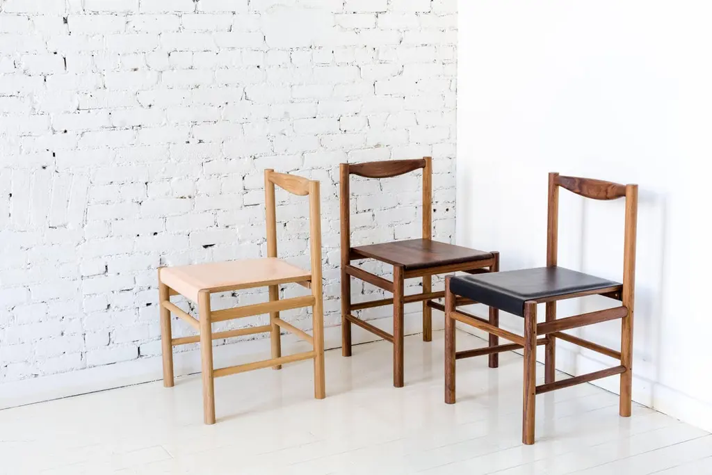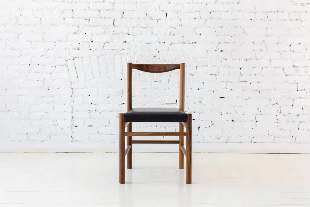 Shaker inspired wood side chair with comfortable contoured back rest. Option for a plain wooden seat pan or a seat pan with a low profile leather or shearling pad. This chair's simplicity makes it versatile to work perfectly in many different environments.Shown here:- Walnut chair and black leather seat- Walnut chair and plain wooden seat pan- White oak chair and vegetable tanned leather seatAvailable in a variety of domestic hardwoods, including: walnut, white oak, hard maple, or ash with light water-based durable finish or hand rubbed oil finish. Pricing based on variations.