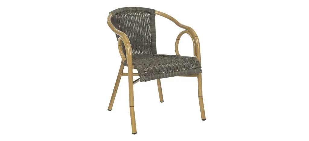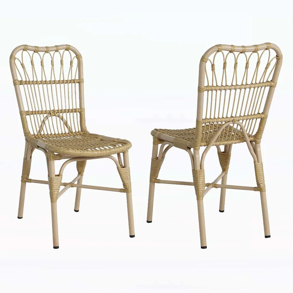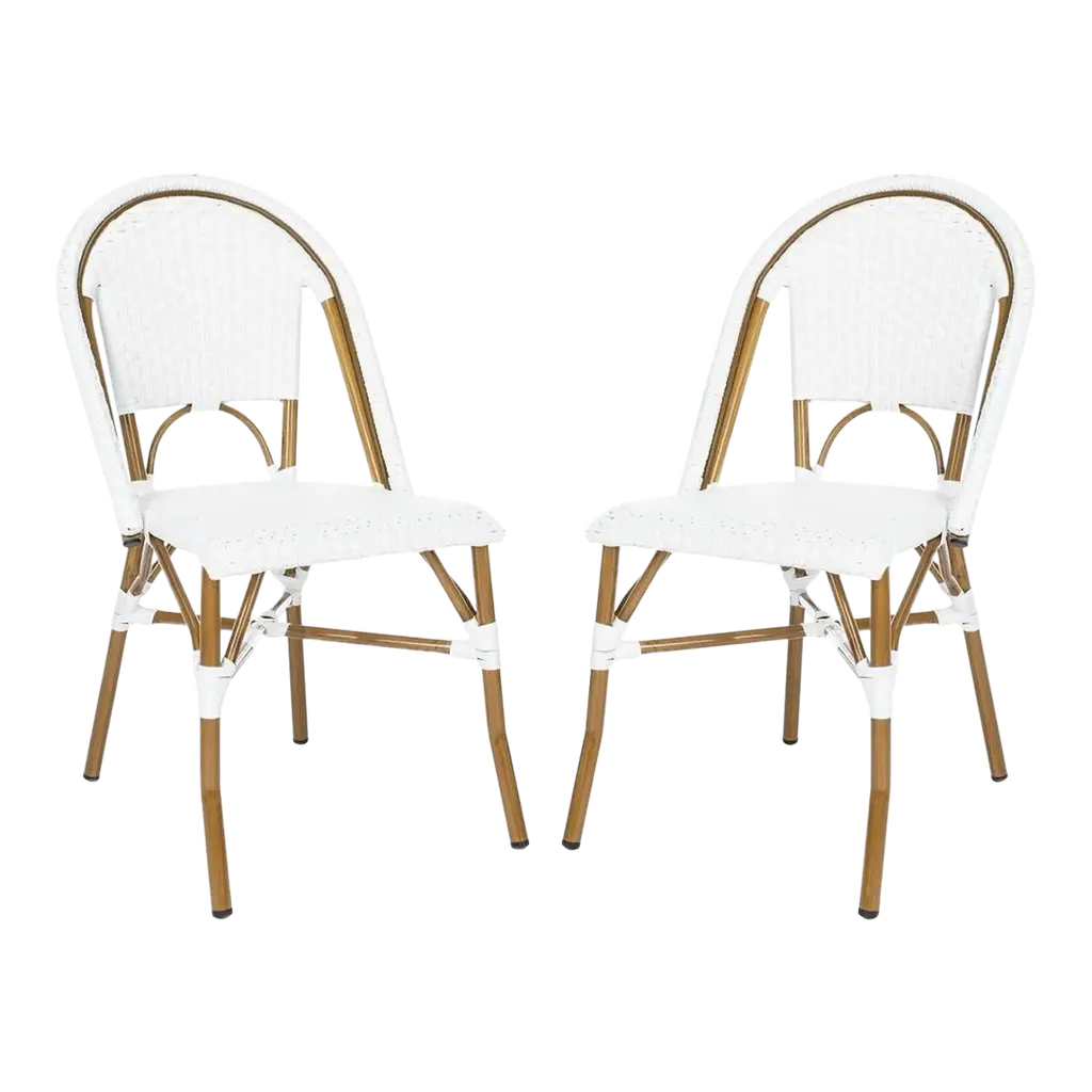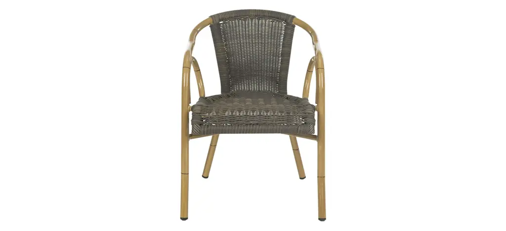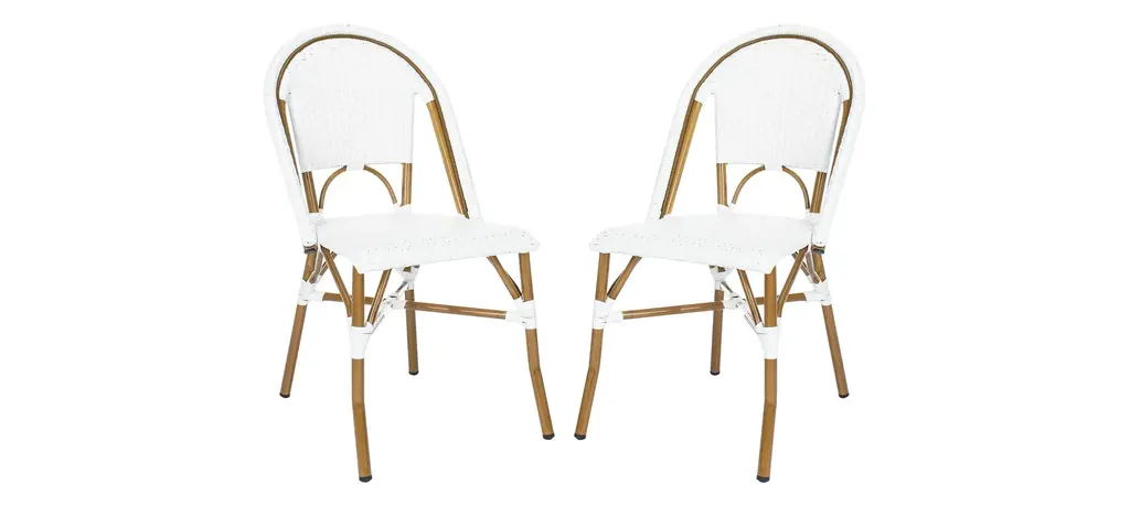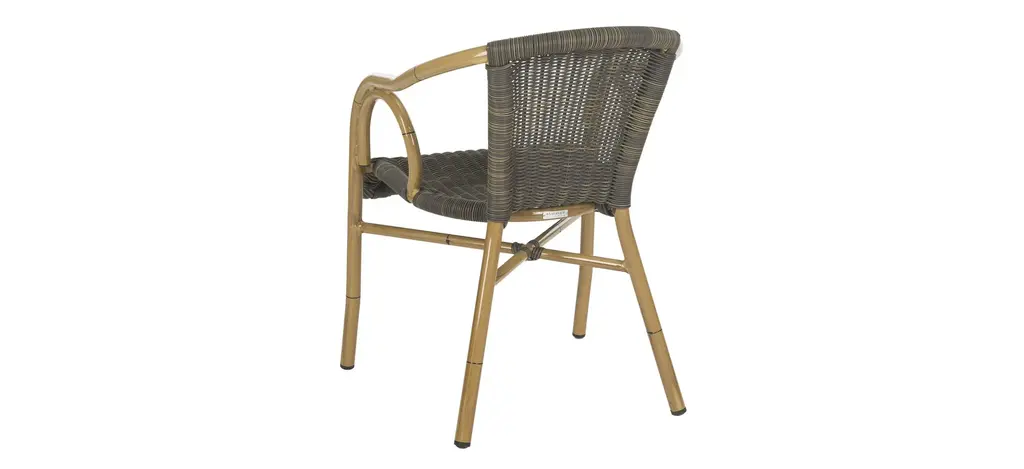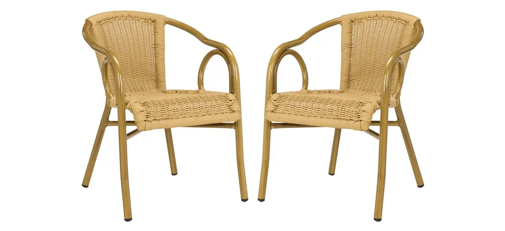 Retro chic style defines the set of two Ransin indoor/outdoor arm chairs by Safavieh. With aluminum frame finished and molded to create the look of bamboo, these pretty and practical chairs feature intricate PE wicker seat and back in chocolate brown.