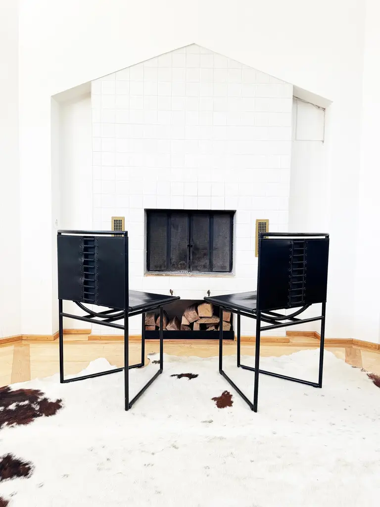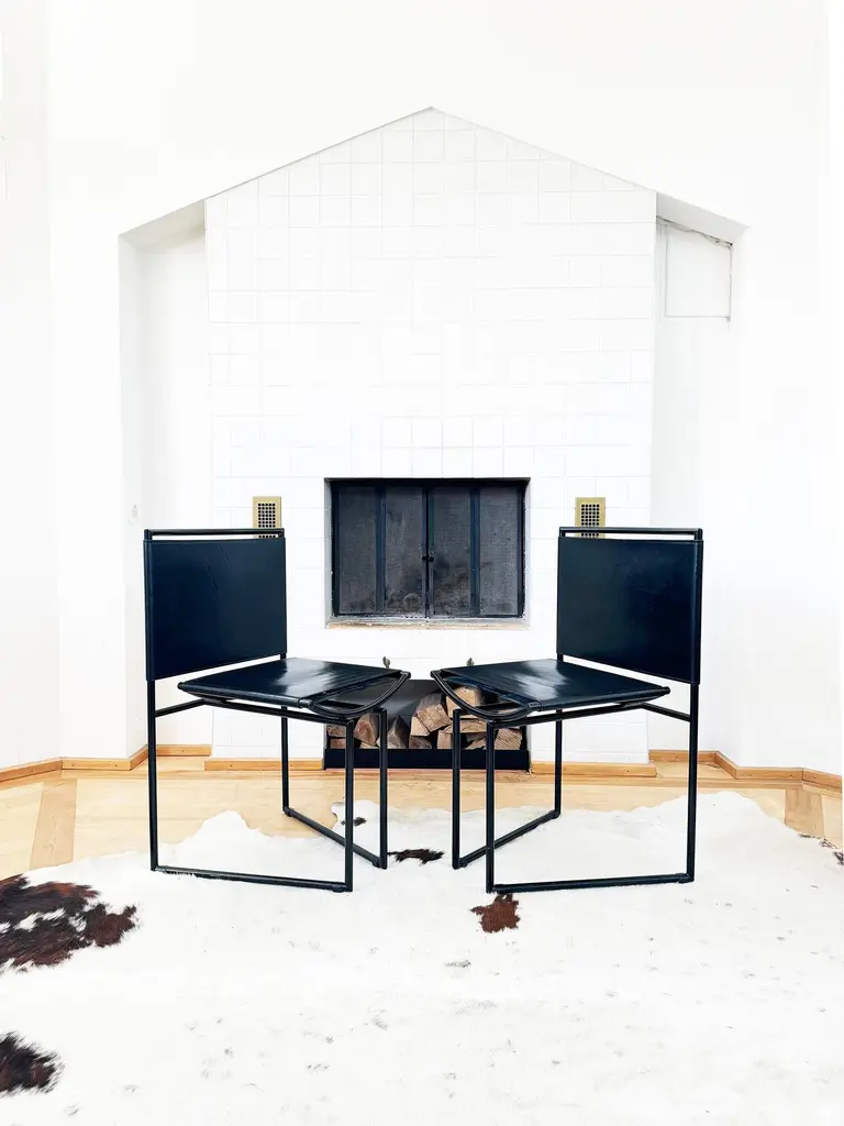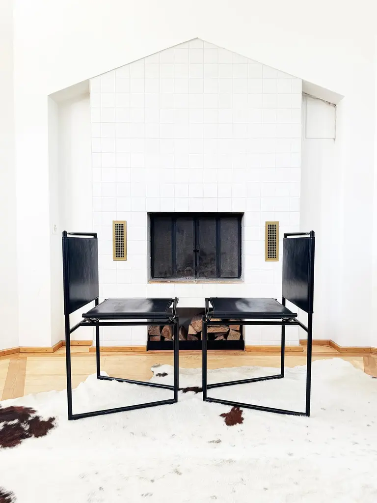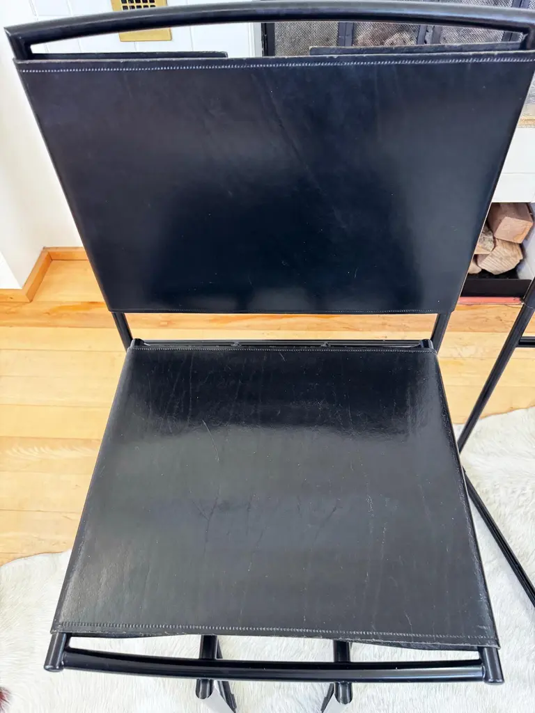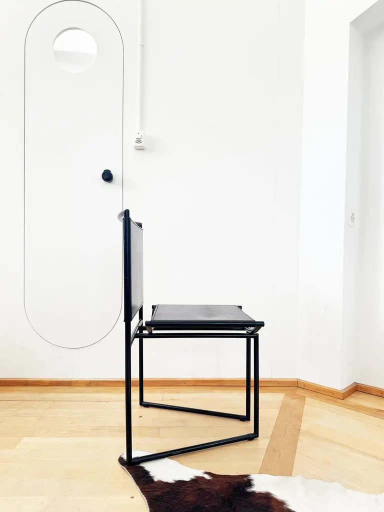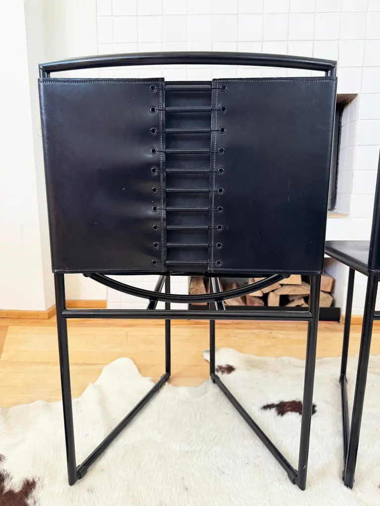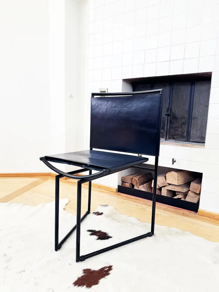 What a beauty! Stunning accent chair for any space!Very fast shipping, insured 7-21 days.RARE Black leather model, with black frame.Chair "Botta '91" 1989Design: 1989Production: since 1990 (now out of production)Manufacturer: Alias SpASold Individually, Two available.Use the drop down menu to indicate one or two. Structure: tubular steel with black or chrome finish. Seat and back in natural leatherConceived during the construction of the tent for the celebration of the 700th anniversary of the swiss Confederation, this chair had to respond to a series of needs: easy to stack and to maintain and, above all, easy to arrange in rows on the occasion of shows and events.Design classic, original Mario Botta for Alias 91 chair. This piece is a very stylisth original model, in beautiful black leather with a black metal frame. Gorgeous combination.A very rare dining conference side chair, designed by Mario Botta for the San Fransisco Museum of Modern Arts. This unique chair is made of high quality black lacquered metal on a thin metal base, seat and back upholstered in black leather and nicely connected in the back. These chairs were used in the special events space of the museum designed by Botta.Born in 1943 in Mendrisio, Switzerland, award-winning architect-designer Mario Botta has built an international reputation for striking postmodern public and private spaces that blend classical forms with a postmodern sensibility.Designer: Mario BottaManufacturer: AliasModel: 91 chairYear: 1990'sMaterial: Steel, leatherDimensions:Height: 84cmWidth: 50cmDepth: 59 cmSeat Height: 46cmSeat Width: 43cmSeath Depth: 35cmNo stickers present any more--I am sure that it is completely authentic and take full responsibility for any authenticityissues arising from misattribution