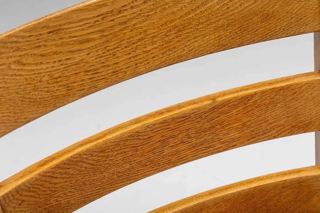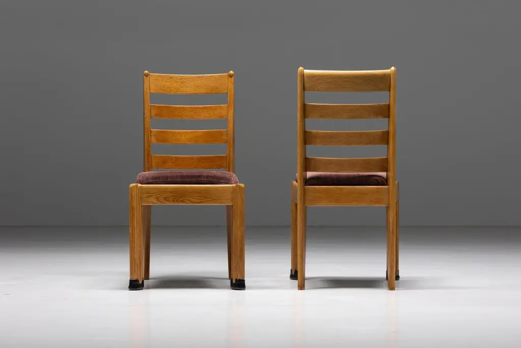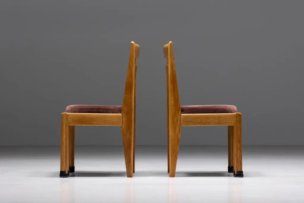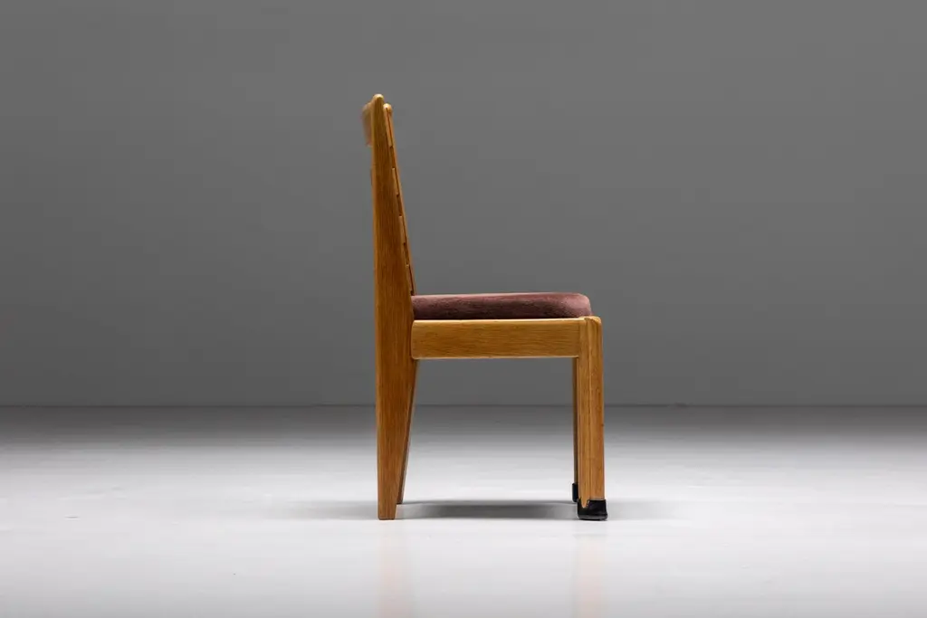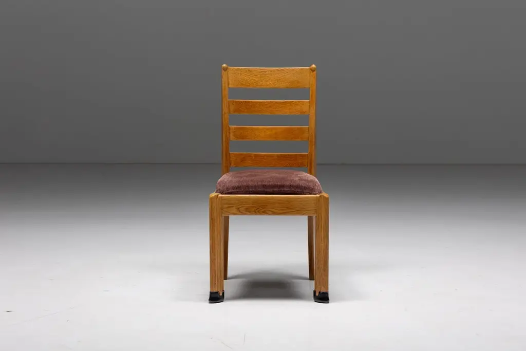 Oak dining chairs, Dutch Art Deco era, Hague school, 1928. Minimalist and modern for its time. Truly an Avant-Garde item. Certainly an inspiration for later Scandinavian Modern designers such as Axel Einar Hjorth. The name Rationalism is retroactively applied to a movement in architecture that came about during the Age of Enlightenment (more specifically, neoclassicism), arguing that architecture's intellectual base is primarily in science as opposed to reverence for and emulation of archaic traditions and beliefs. Rationalist architects, following the philosophy of René Descartes, emphasized geometric forms and ideal proportions.: 81-84.Priced per piece. The matching armchairs and dining table are available in other listings.