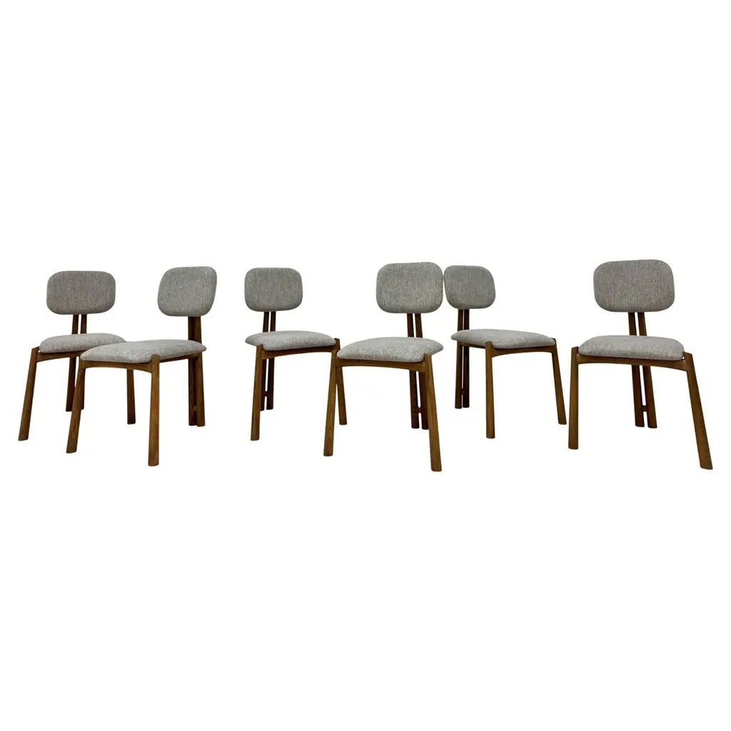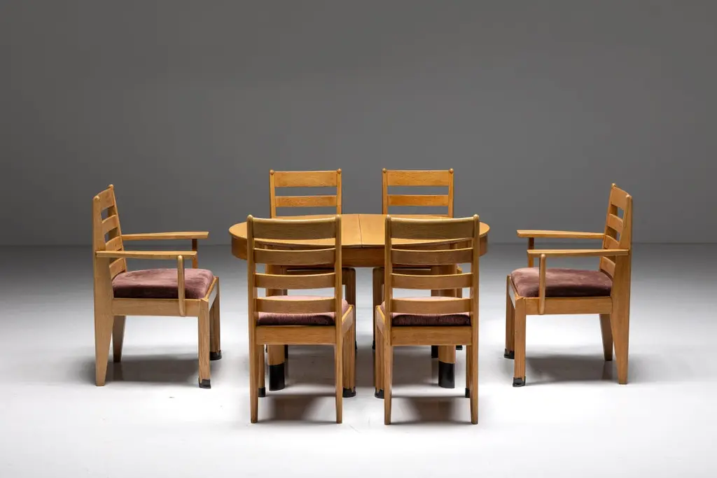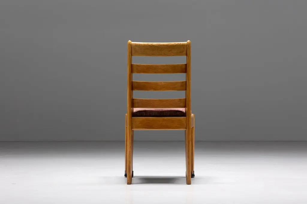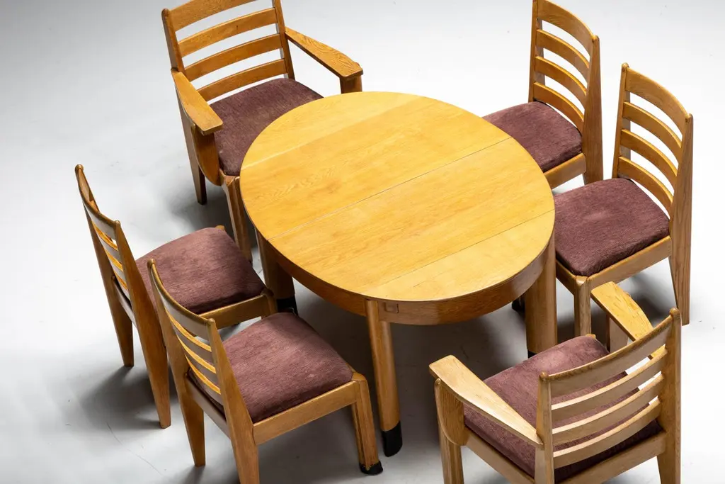 Oak dining chairs, Dutch Art Deco era, Hague school, 1928. Minimalist and modern for its time. Truly an Avant-Garde item. Certainly an inspiration for later Scandinavian Modern designers such as Axel Einar Hjorth. The name Rationalism is retroactively applied to a movement in architecture that came about during the Age of Enlightenment (more specifically, neoclassicism), arguing that architecture's intellectual base is primarily in science as opposed to reverence for and emulation of archaic traditions and beliefs. Rationalist architects, following the philosophy of René Descartes, emphasized geometric forms and ideal proportions.: 81-84.Priced per piece. The matching armchairs and dining table are available in other listings.