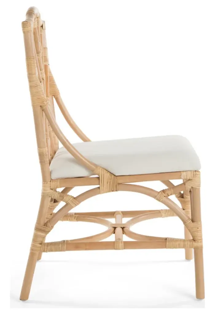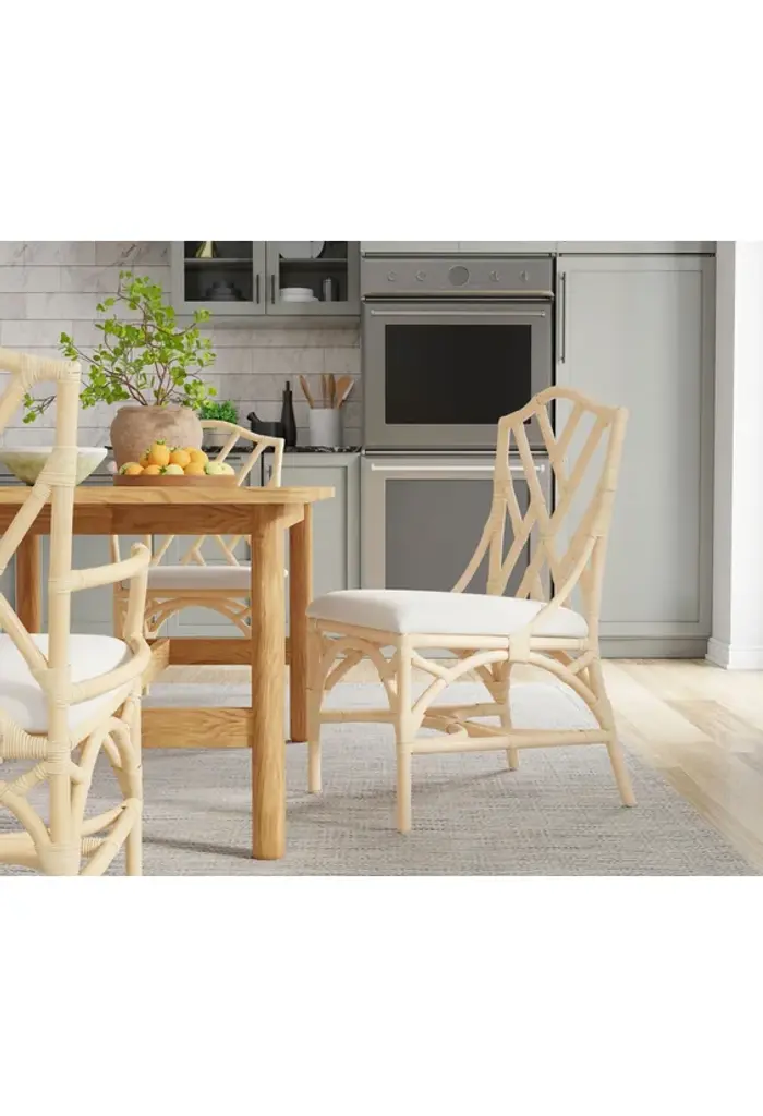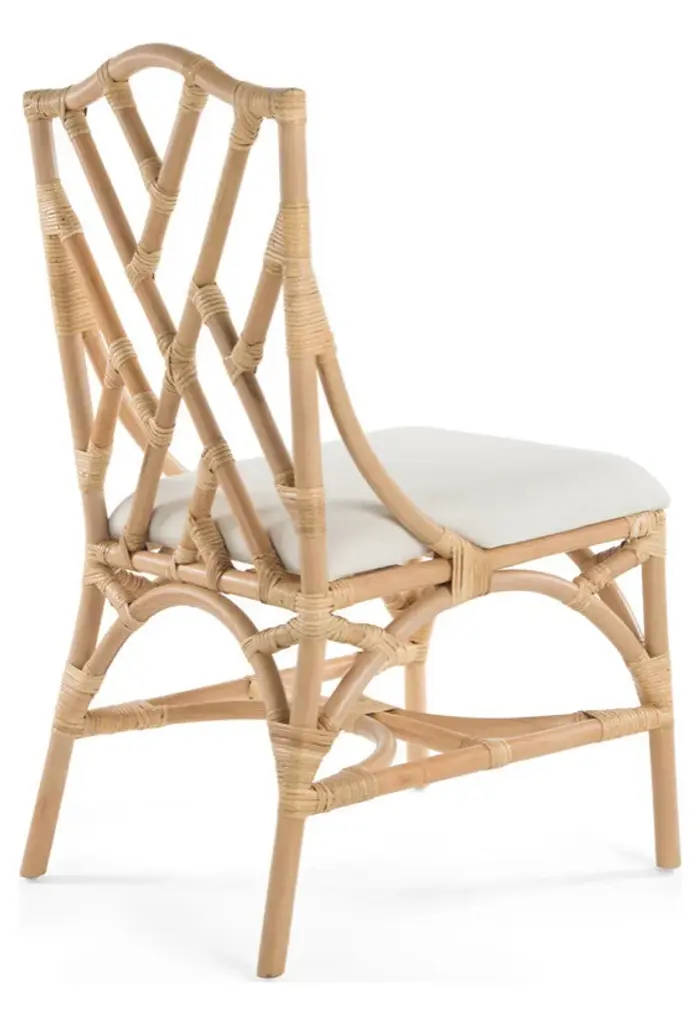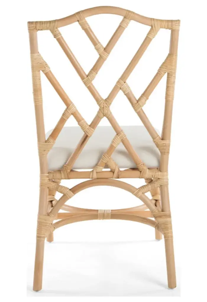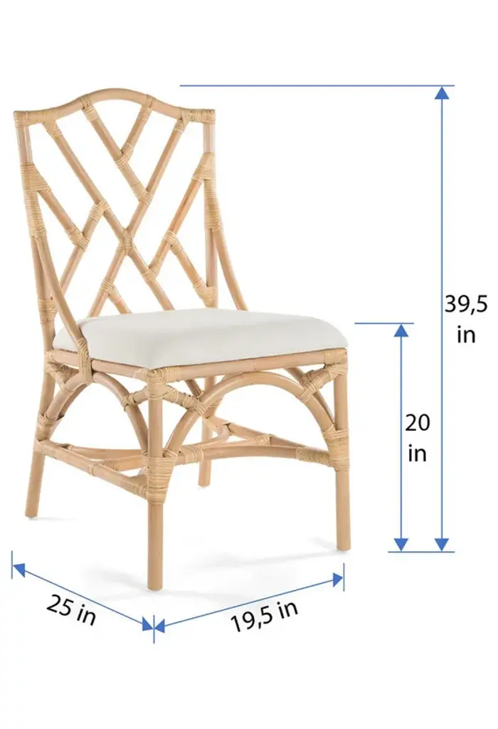 19.5 inches wide x 25 inches deep x 39.5 inches tall. Seat height 20 inches. Sitting surface 19.5 inches x 20.5 inches.Hand crafted from naturally grown Rattan.Not intended for outdoor use. Cannot be left exposed to the elements.Seat cushion upholstered. Spot clean spill right away.Clean rattan with damp cloth.Offered as a set of 2 chairs without armThe Rattan Chippendale Upholstered Dining chair in natural makes an ideal addition to any coastal style home. The tropical style of the rattan frame lends itself to a dining room, living room or other living space in your home.