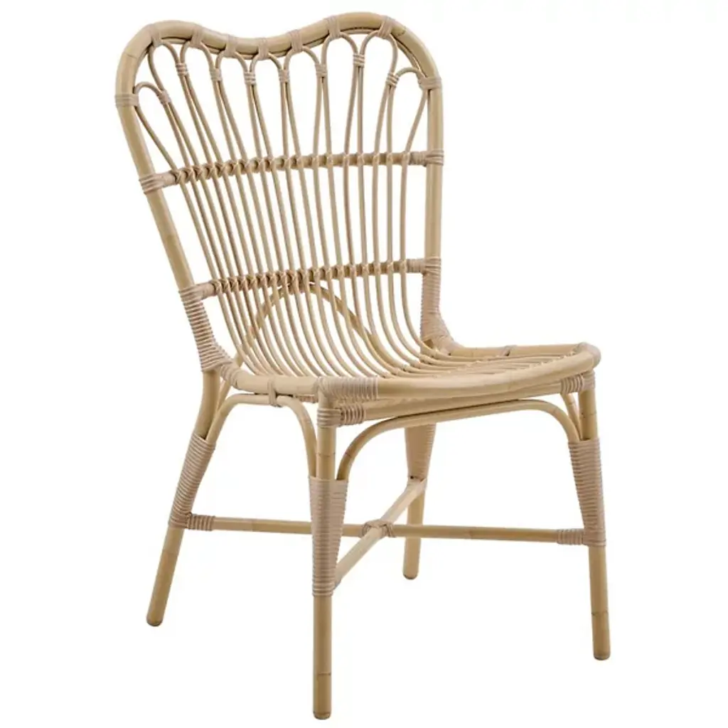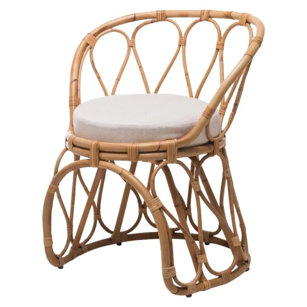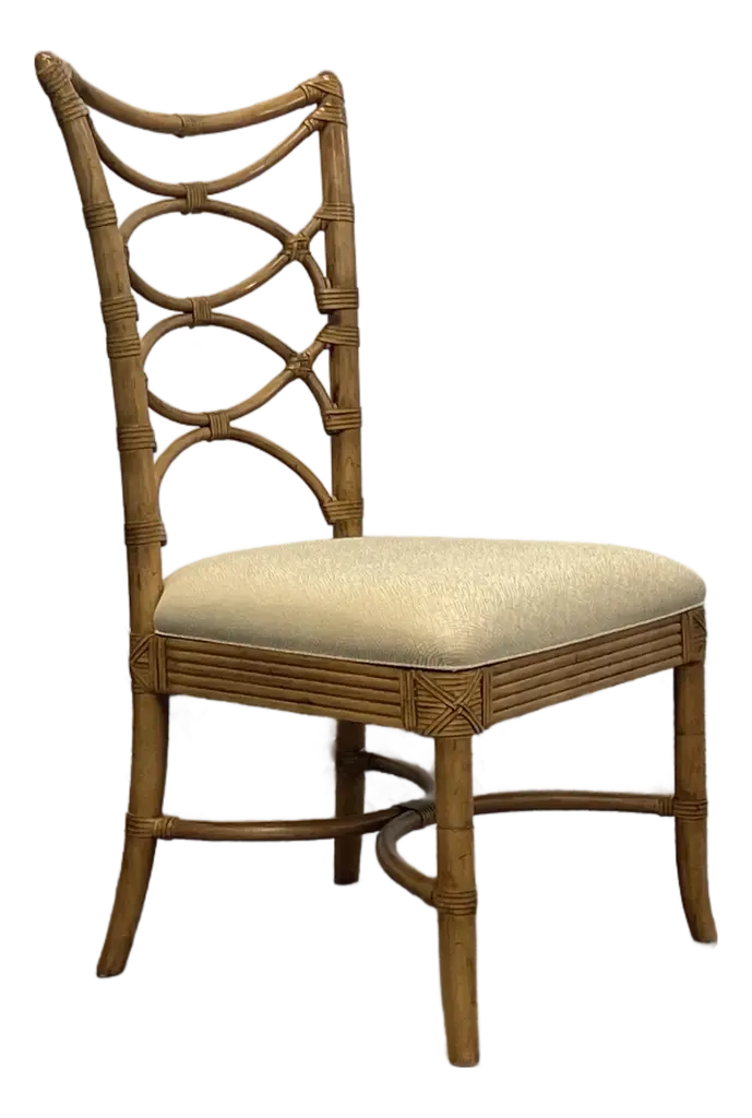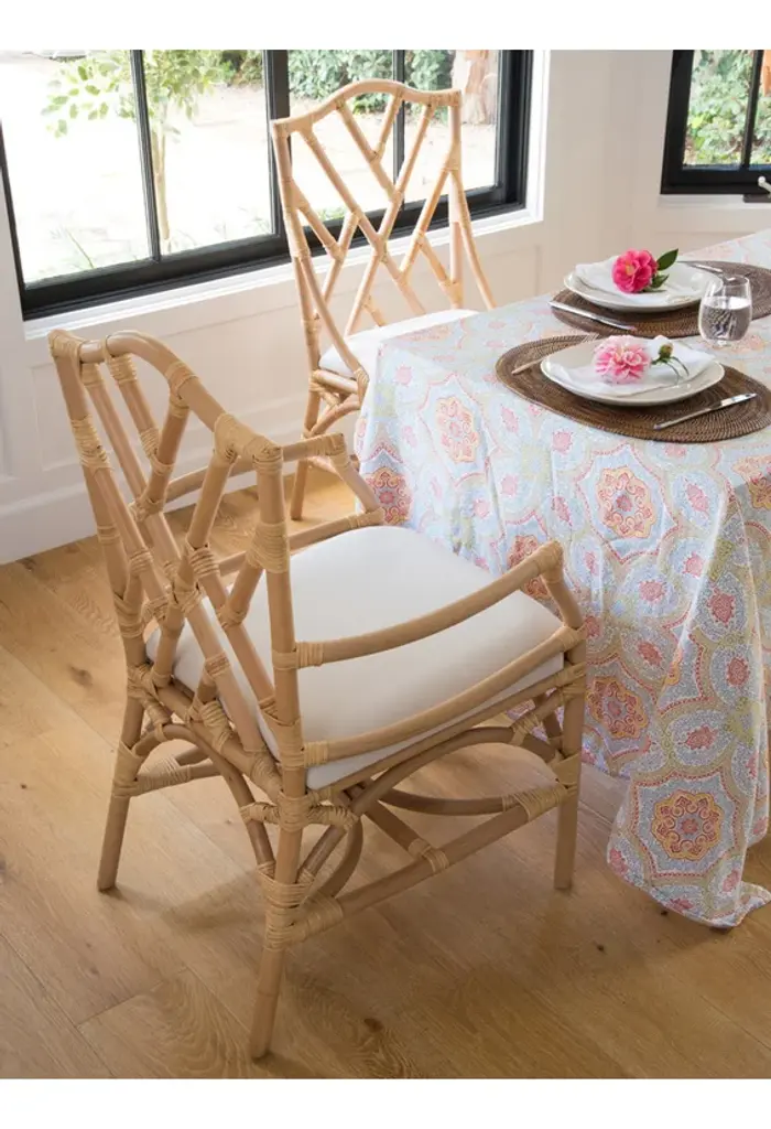 19.5 inches wide x 25 inches deep x 39.5 inches tall. Seat height 20 inches. Sitting surface 19.5 inches x 20.5 inches.Hand crafted from naturally grown Rattan.Not intended for outdoor use. Cannot be left exposed to the elements.Seat cushion upholstered. Spot clean spill right away.Clean rattan with damp cloth.Offered as a set of 2 chairs without armThe Rattan Chippendale Upholstered Dining chair in natural makes an ideal addition to any coastal style home. The tropical style of the rattan frame lends itself to a dining room, living room or other living space in your home.
