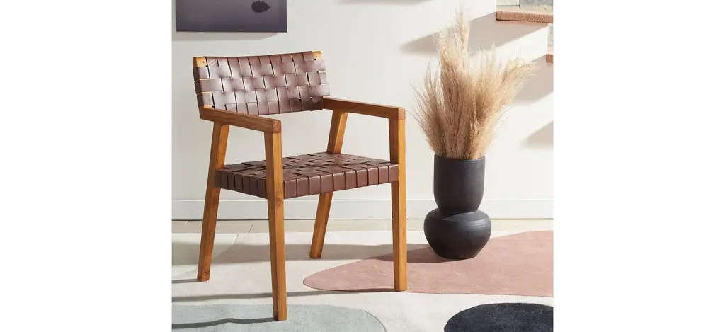 This utterly stylish Ravenel Dining Chair redefines modern minimalism for today's eclectic interiors. Its starkly angled natural mindi frame is given additional decorative depth in its cognac woven leather seat and back, making it a contemporary design icon.