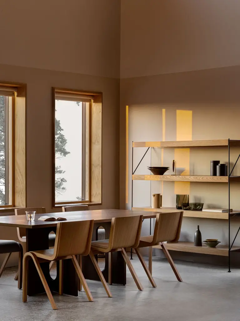 The result of a study of the possibilities of form-pressing techniques, Ready Chair, created for Audo by Matias Møllenbach and Nick Rasmussen, takes its cues from classic free-swing chair designs, its cantilevered seat and backrest appearing as if suspended on air. Available in FSC™-certified oak veneer, it comes with a natural or red stained oak finish and with the option of an upholstered seat and back. Perfectly sized for use as a dining chair, its stackable design and row-connecting feature make it equally suited to a multitude of other uses. The Ready Dining Chair can be stacked 4 chairs on the ground and up to 15 chairs on a trolley. Stacking works with or without the row connection.