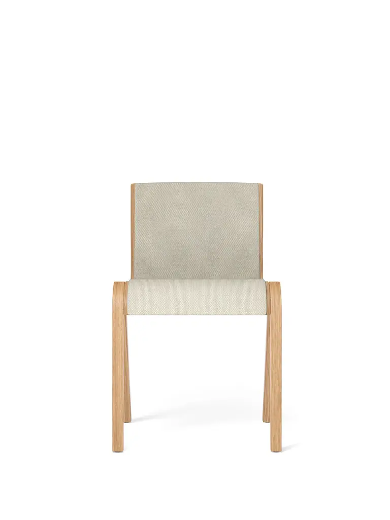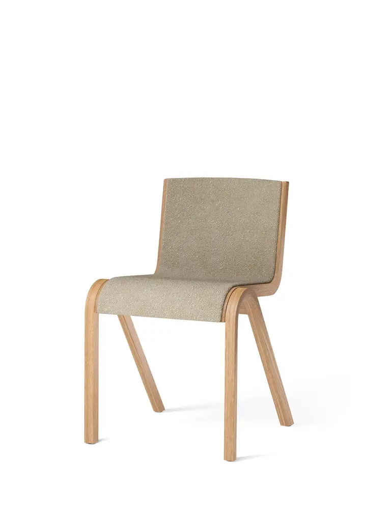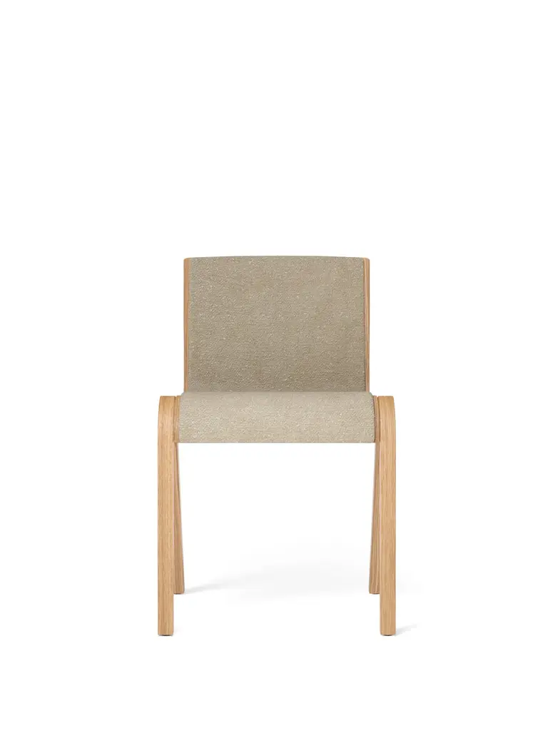 The result of a study of the possibilities of form-pressing techniques, Ready Chair, created for Audo by Matias Møllenbach and Nick Rasmussen, takes its cues from classic free-swing chair designs, its cantilevered seat and backrest appearing as if suspended on air. Available in FSC™-certified oak veneer, it comes with a natural or red stained oak finish and with the option of an upholstered seat and back. Perfectly sized for use as a dining chair, its stackable design and row-connecting feature make it equally suited to a multitude of other uses. The Ready Dining Chair can be stacked 4 chairs on the ground and up to 15 chairs on a trolley. Stacking works with or without the row connection.