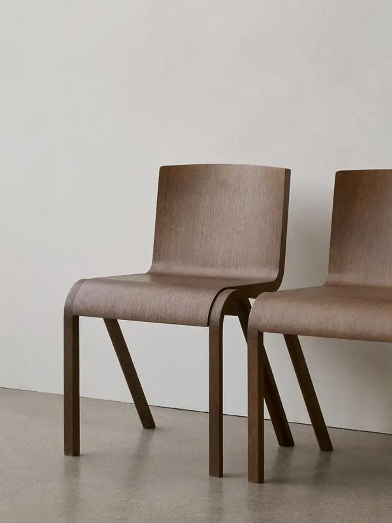 The result of a study of the possibilities of form-pressing techniques, Ready Chair, created for Audo by Matias Møllenbach and Nick Rasmussen, takes its cues from classic free-swing chair designs, its cantilevered seat and backrest appearing as if suspended on air. Available in FSC™-certified oak veneer, it comes with a natural or red stained oak finish and with the option of an upholstered seat and back. Perfectly sized for use as a dining chair, its stackable design and row-connecting feature make it equally suited to a multitude of other uses. The Ready Dining Chair can be stacked 4 chairs on the ground and up to 15 chairs on a trolley. Stacking works with or without the row connection.