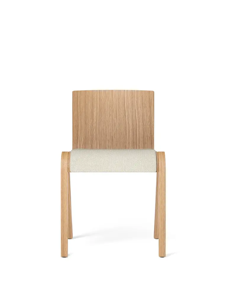 The result of a study of the possibilities of form-pressing techniques, Ready Chair, created for Audo by Matias Møllenbach and Nick Rasmussen, takes its cues from classic free-swing chair designs, its cantilevered seat and backrest appearing as if suspended on air. Available in FSC™-certified oak veneer, it comes with a natural or red stained oak finish and with the option of an upholstered seat and back. Perfectly sized for use as a dining chair, its stackable design and row-connecting feature make it equally suited to a multitude of other uses. The Ready Dining Chair can be stacked 4 chairs on the ground and up to 15 chairs on a trolley. Stacking works with or without the row connection.