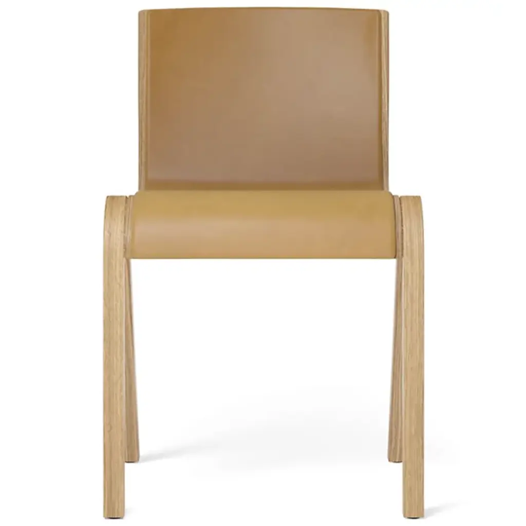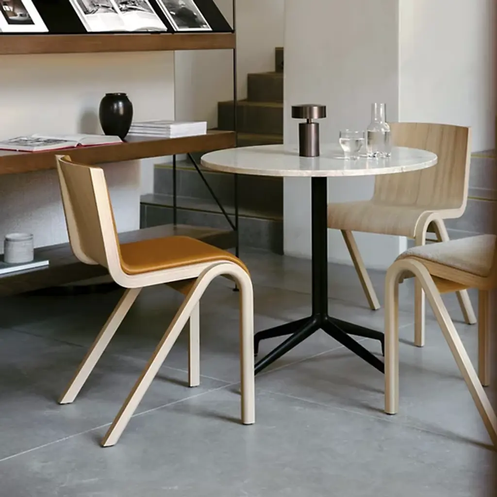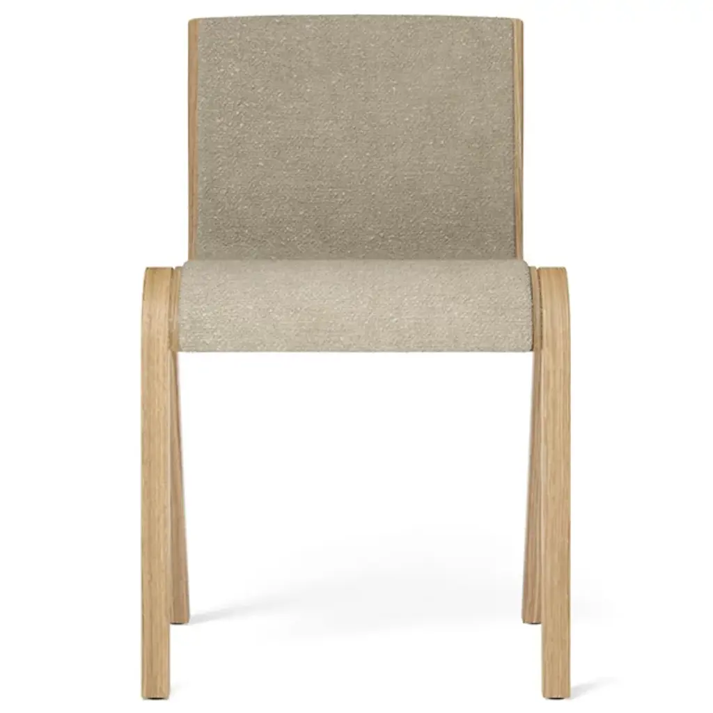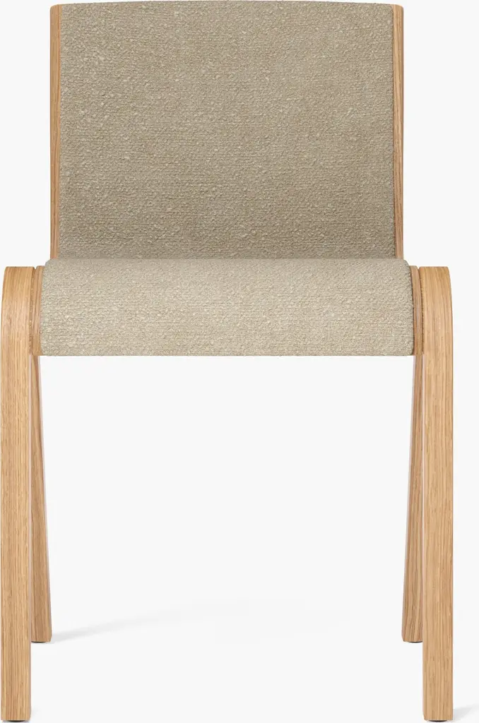Fluid comfort at a moment’s notice. Entertain and tidy up after with ease with the sculptural and stackable Ready Fully Upholstered Dining Chair from Audo Copenhagen, formerly known as Menu. Design duo Matias Møllenbach and Nick Rasmussen work together to create timeless objects with distinct forms. Here, Møllenbach and Rasmussen draw inspiration from the floating silhouette of the classic cantilevered chair. This Scandinavian-style dining chair’s gestural wood framework seduces with an elegant grain texture. The framework’s refined curves make stacking easy, while a connecting mechanism on the side lets them be fixed in a row. Resting on top, a seamless form-pressed shell feels tailored to the body from the back to the knees. High resiliency foam adds comfort while powder-coated steel offers support. PA plastic glides allow for easy movement.