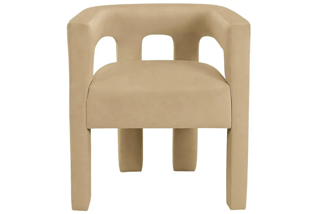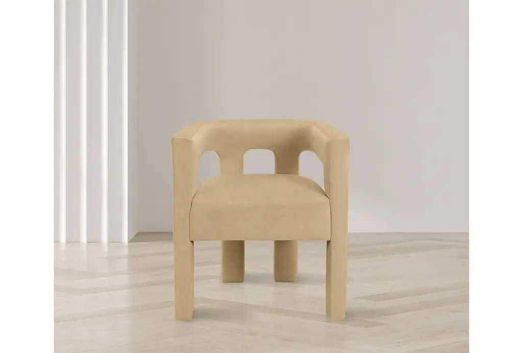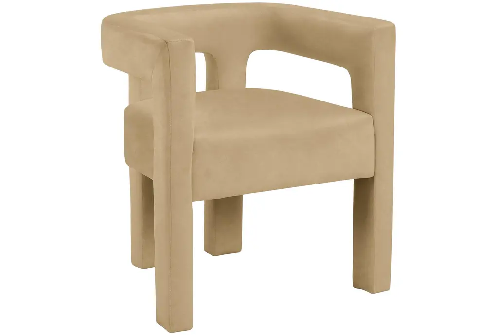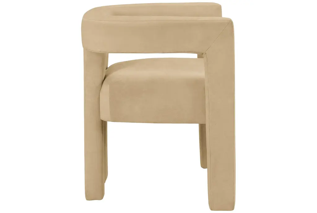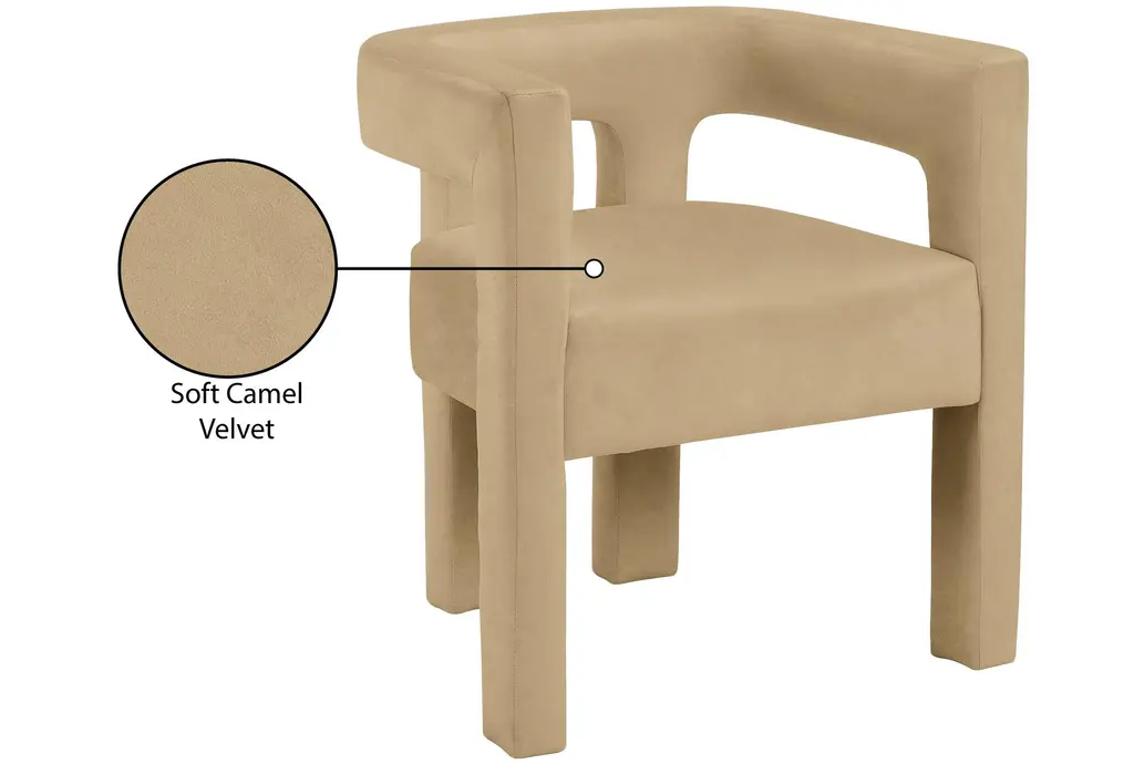 Introducing the Reena Camel Velvet Dining Chair, a modern addition to your dining room or kitchen. This chair features a low back design and recessed armrests, providing both style and comfort. The camel velvet upholstery adds a touch of sophistication to any space.