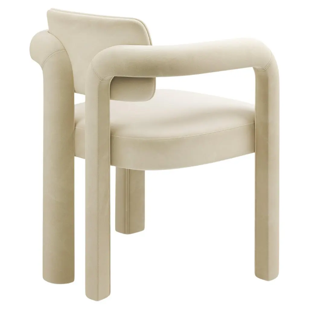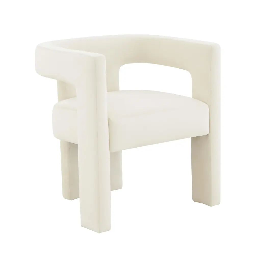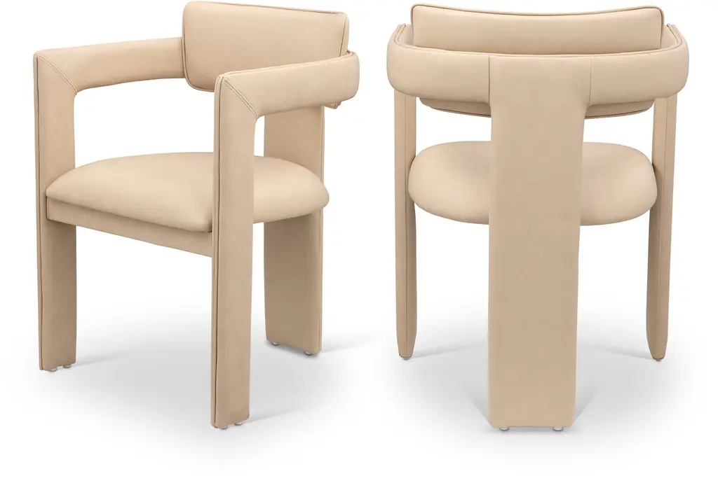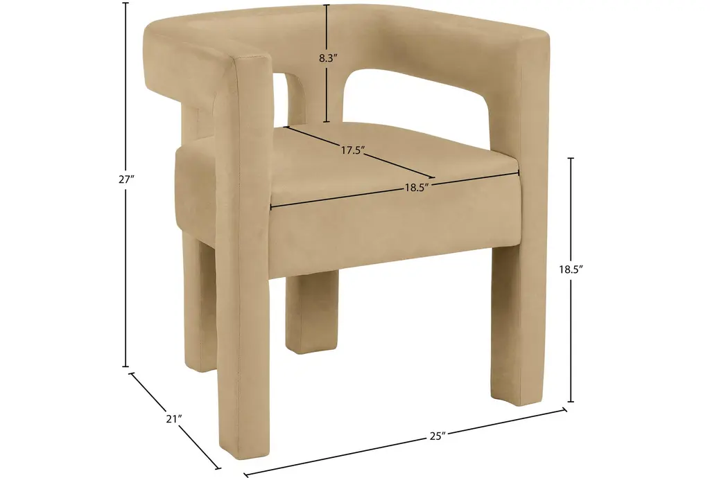 Introducing the Reena Camel Velvet Dining Chair, a modern addition to your dining room or kitchen. This chair features a low back design and recessed armrests, providing both style and comfort. The camel velvet upholstery adds a touch of sophistication to any space.