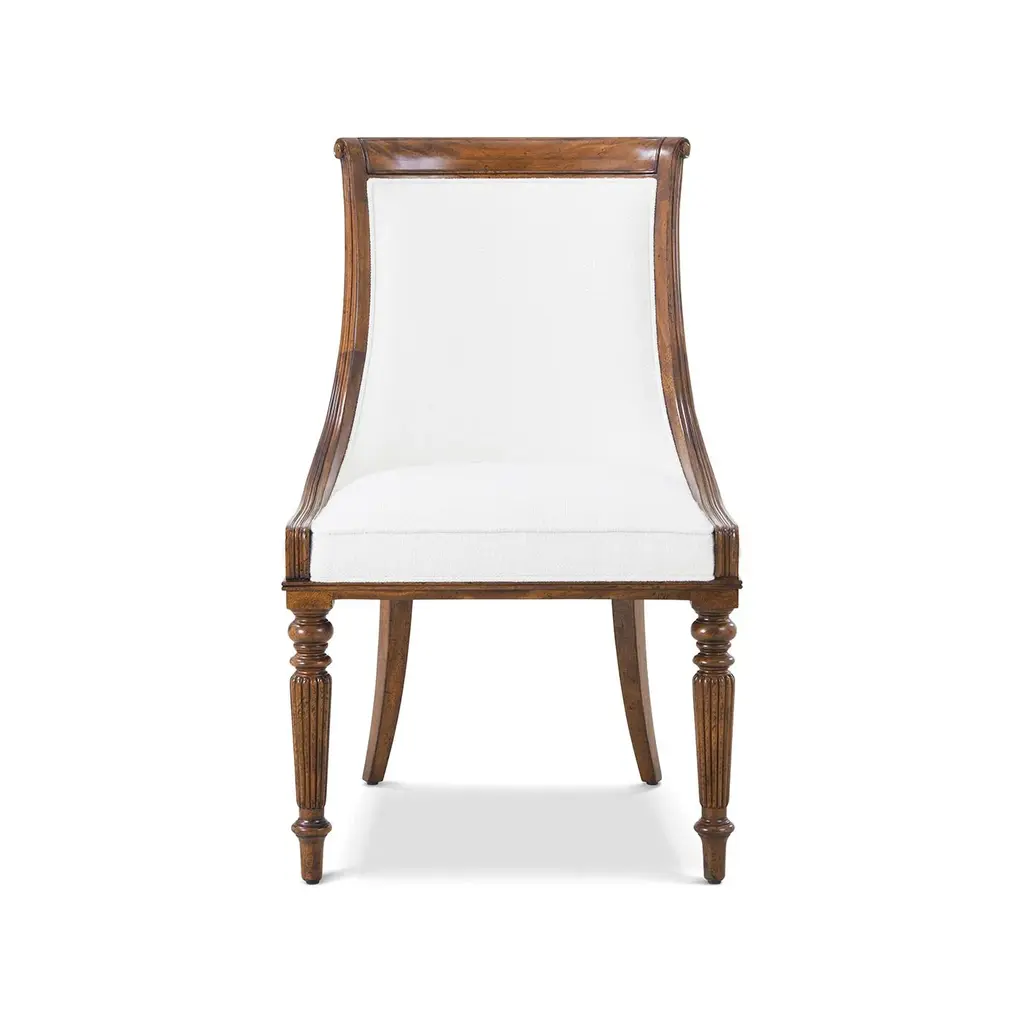 Blending 19th-century neoclassical elegance with artisan craftsmanship. This hand-carved mahogany scoop-back chair features a paneled and upholstered back above a plush seat, both finished with tailored welting trim. With turned and reeded legs that ground the design with classical poise. Perfect for elevating formal dining rooms or refined living areas, this chair offers more than seating—it’s a showcase of heritage and craftsmanship. Whether placed at the head of a table or styled as an accent piece, it brings enduring charm and tailored luxury to any space. Dimensions: 22.5" W x 25.5" D x 36.5" H Seat height - 19"