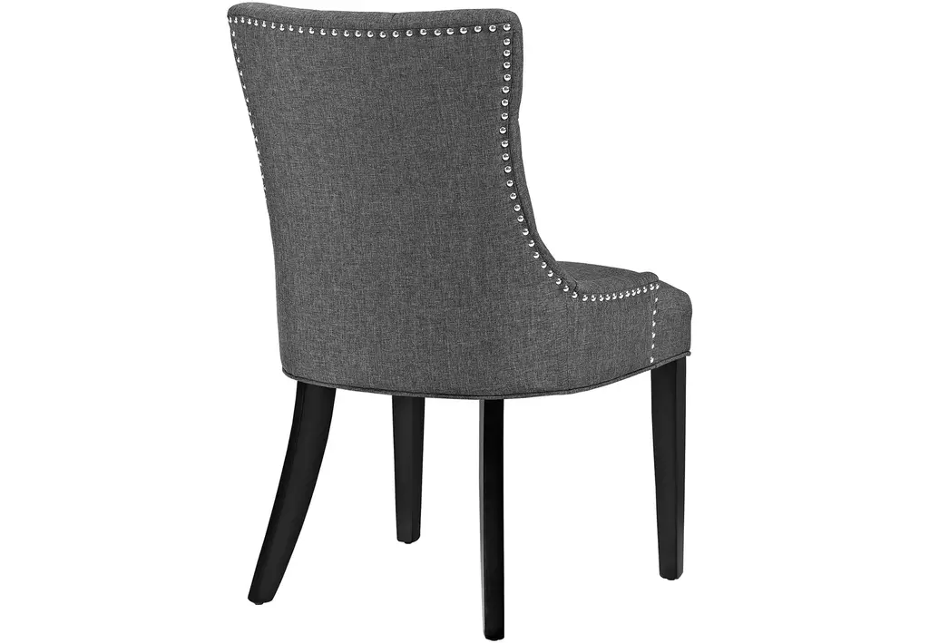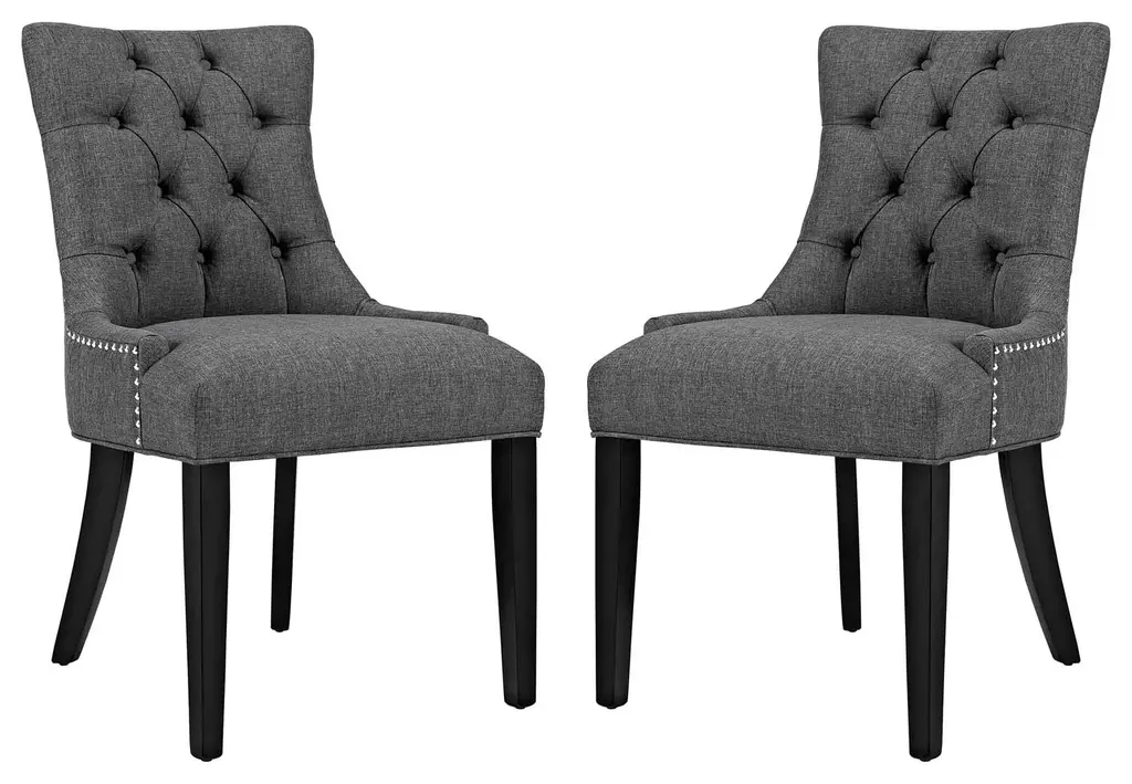 Transport your decor to a simpler time with the Regent Dining Side Chair. Fashioned with a chic and elegant look, Regent features finely tufted buttons, studded nailhead trim, and a regal seat generously padded in foam and upholstered in polyester fabric. Regent comes with non-marking foot caps, tapered wood legs, and works well in both modern and traditional dining rooms.Bullet Features:Solid Wood FrameBlack Rubberwood LegsDense Foam Padding for ComfortStudded Nailhead TrimElegant Tapered LegsNon-Marking Foot CapsAssembly RequiredSet Includes:Two - Regent Dining ChairProduct Dimensions:Overall Dining Chair Dimensions: 25"L x 22"W x 36"HSeat Dimensions: 18.5"L x 21"W x 20.5"HOverall Product Dimensions: 25"L x 44"W x 36"H