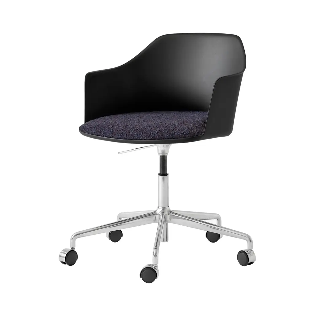 &Tradition pulls out all the stops with this upholstered-seat Rely model equipped with convenient automatic gas lift as well as a 5-star rolling base with castors in gleaming aluminum. Designer Hee Welling's sustainable take on iconic Danish molded seating is made from 100% recycled polypropylene, curving around the body and extending out along the sides for comfortable back support. A wealth of fine fabric and leather options for the HR foam-fill seat complements the silvery polished base finish.