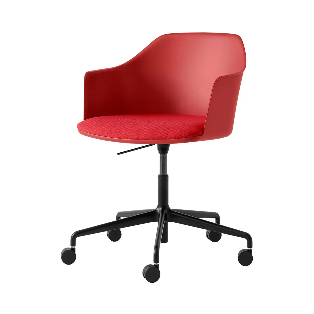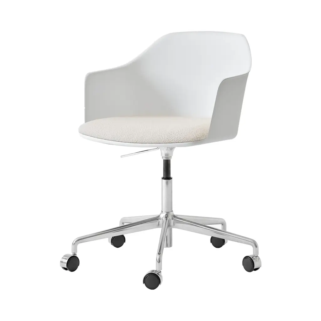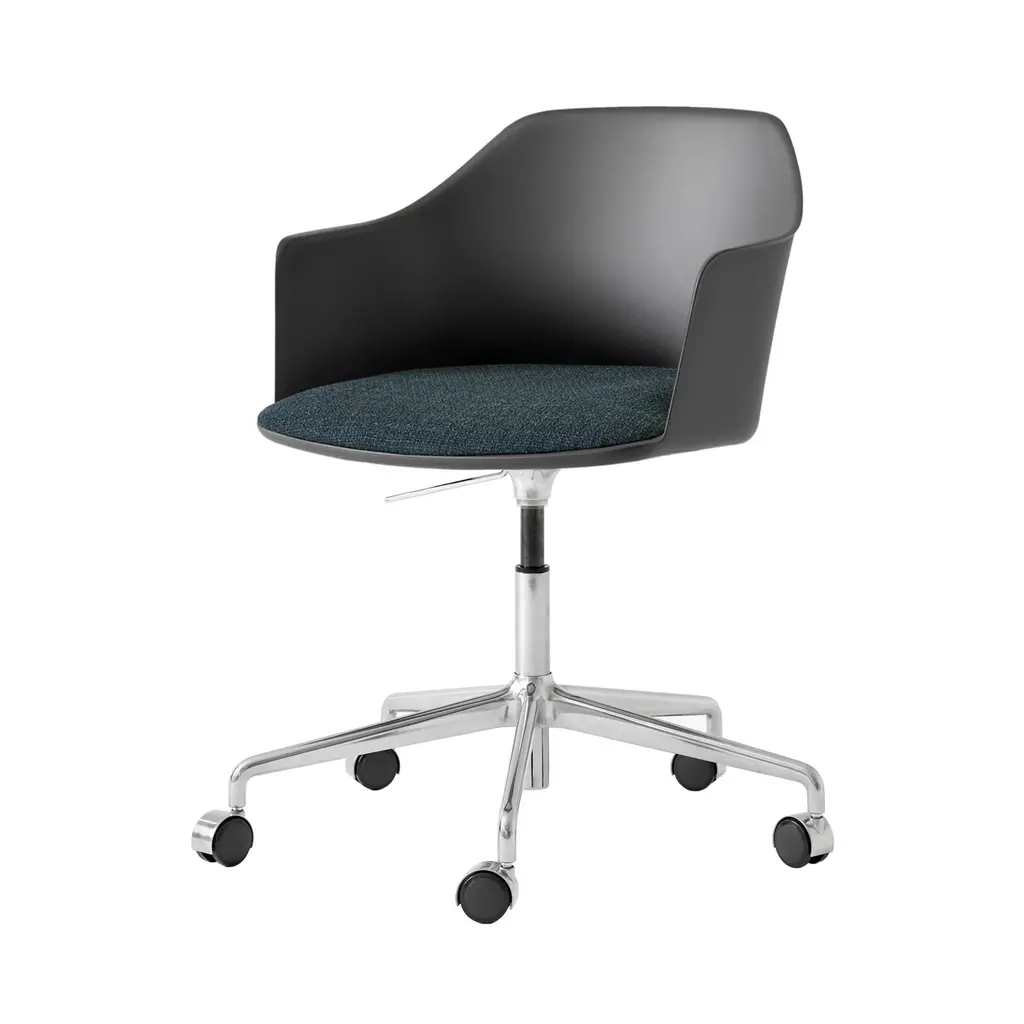 &Tradition pulls out all the stops with this upholstered-seat Rely model equipped with convenient automatic gas lift as well as a 5-star rolling base with castors in gleaming aluminum. Designer Hee Welling's sustainable take on iconic Danish molded seating is made from 100% recycled polypropylene, curving around the body and extending out along the sides for comfortable back support. A wealth of fine fabric and leather options for the HR foam-fill seat complements the silvery polished base finish.