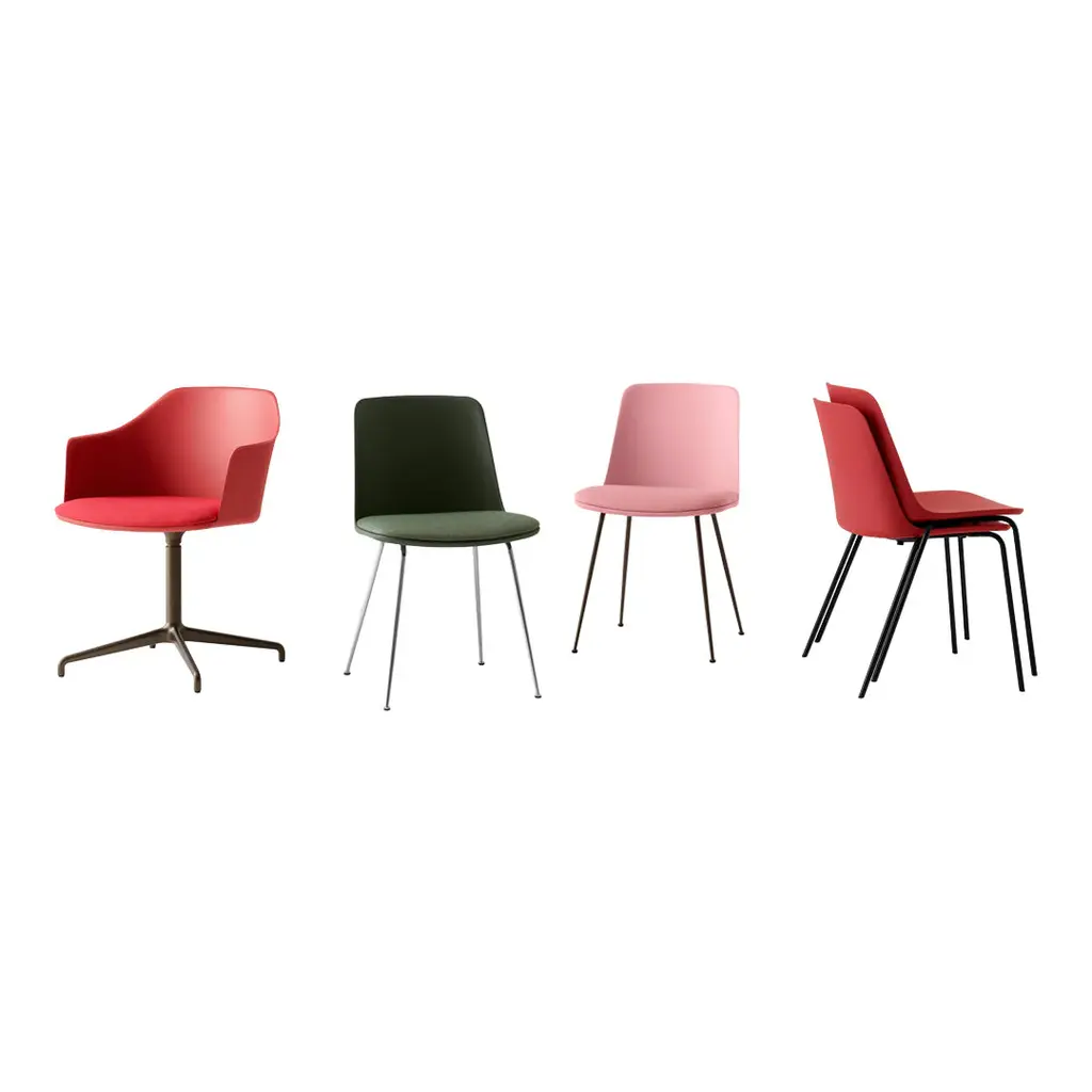 After the success of Hee Welling's Rely chair, this popular line has been expanded with a new arrival. A compact and comfortable piece that supports those spending long hours at work, its 100% recycled plastic shell curves around the body and extends out along the side to provide optimal back support. Can stack up to 12 chairs.