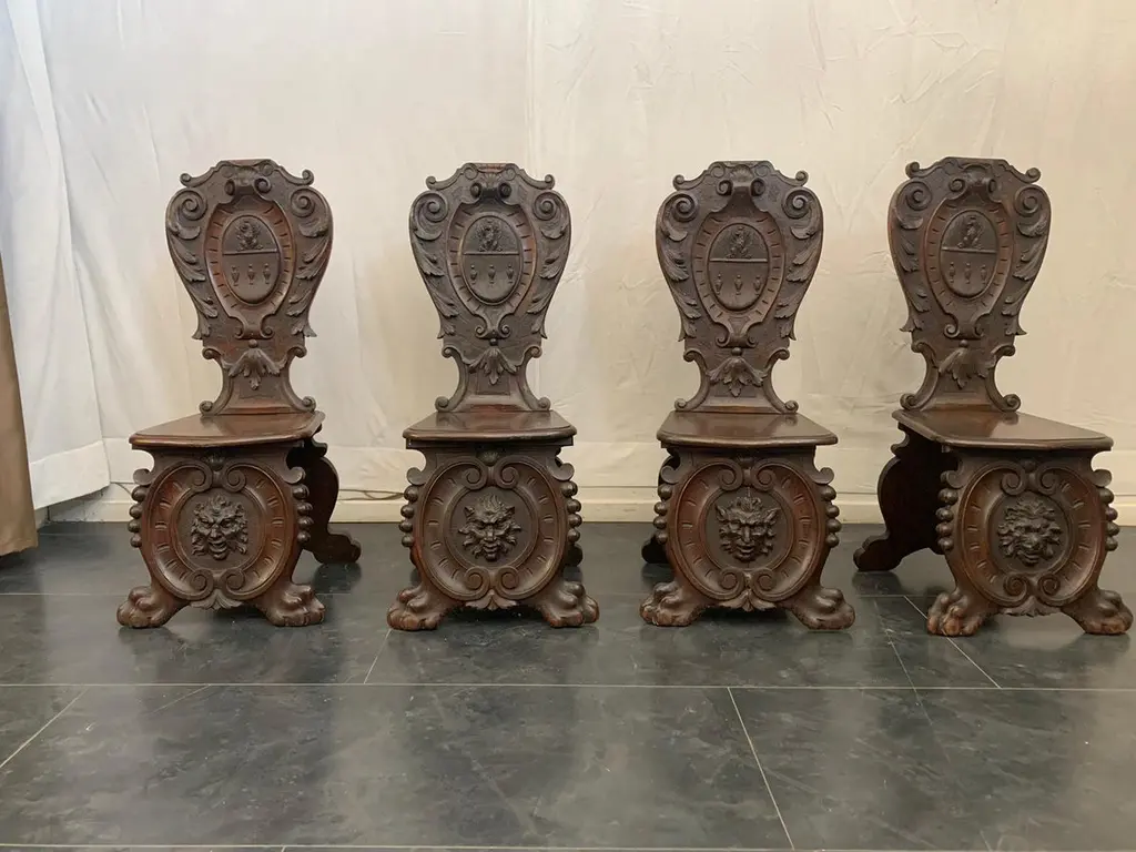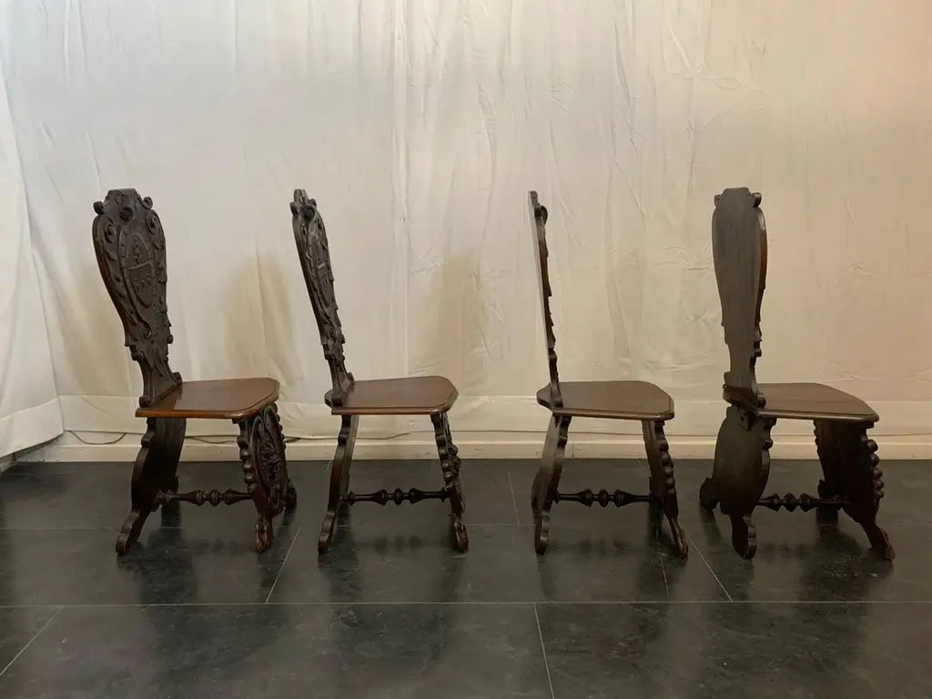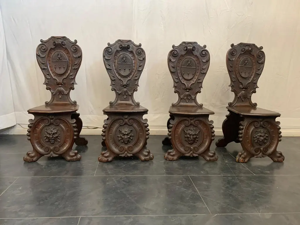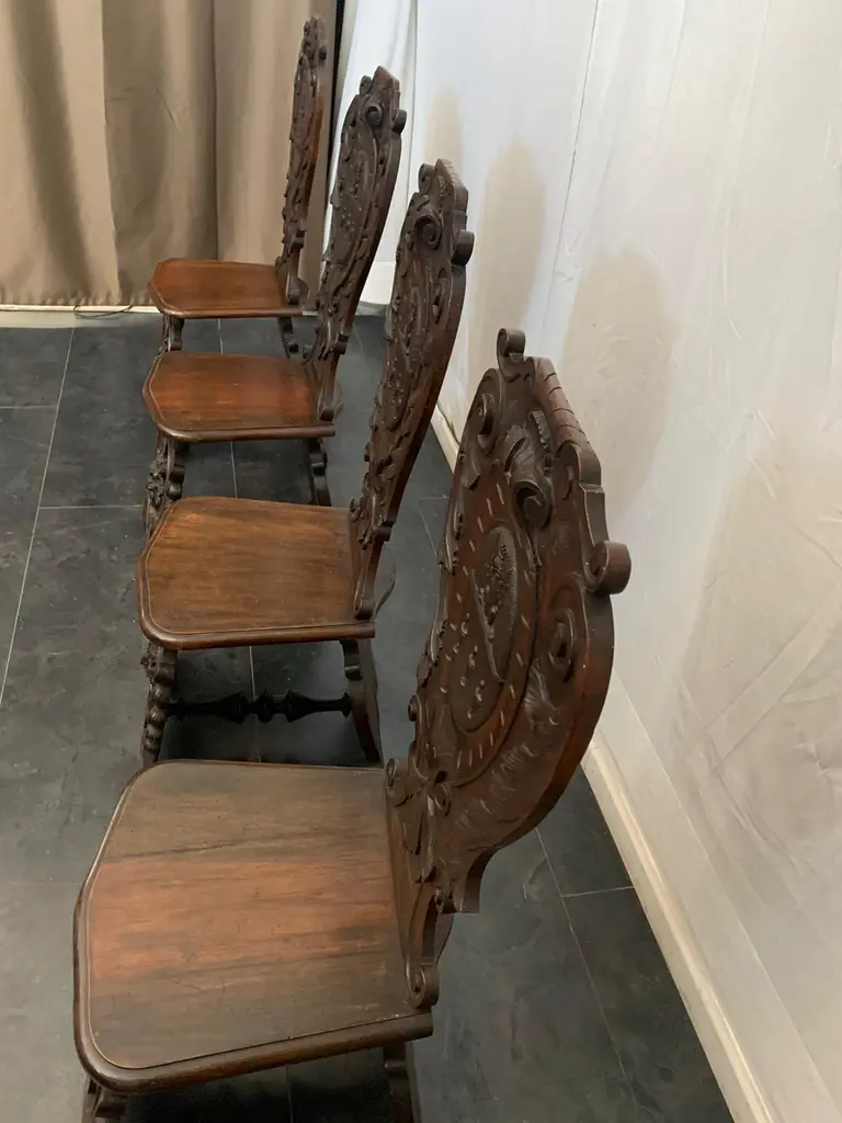 Chairs (Scranni) made of finely carved walnut to recreate volutes and decorations typical of the Renaissance style in vogue in the eclectic period of the late '800. Price for each one.