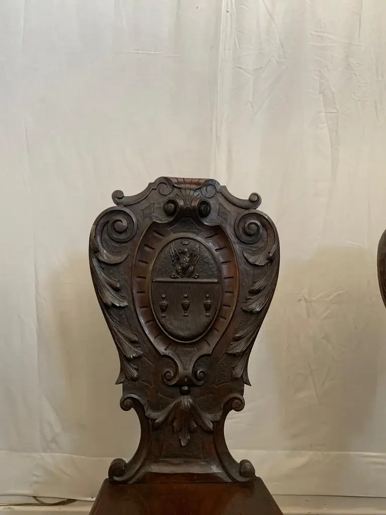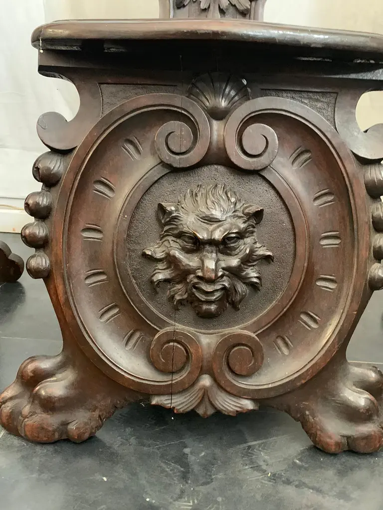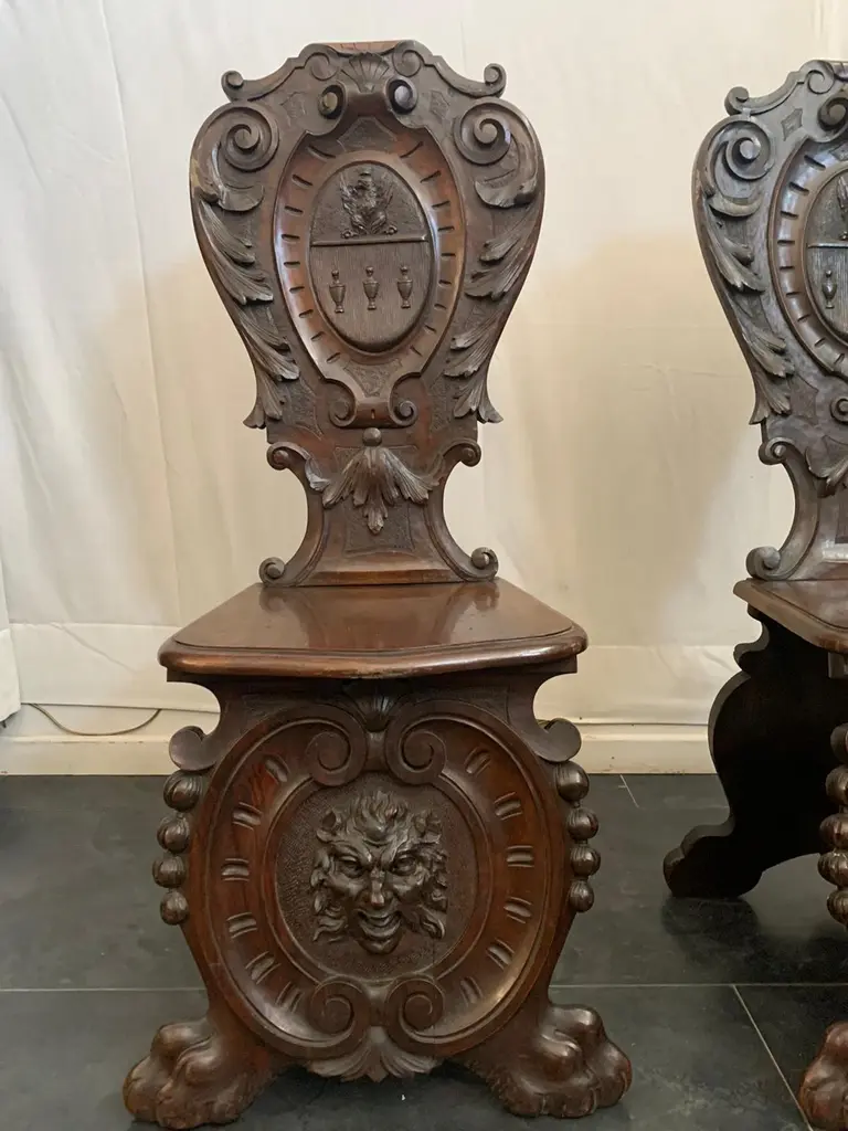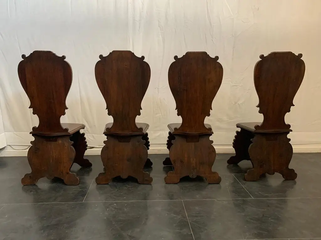 Chairs (Scranni) made of finely carved walnut to recreate volutes and decorations typical of the Renaissance style in vogue in the eclectic period of the late '800. Price for each one.
