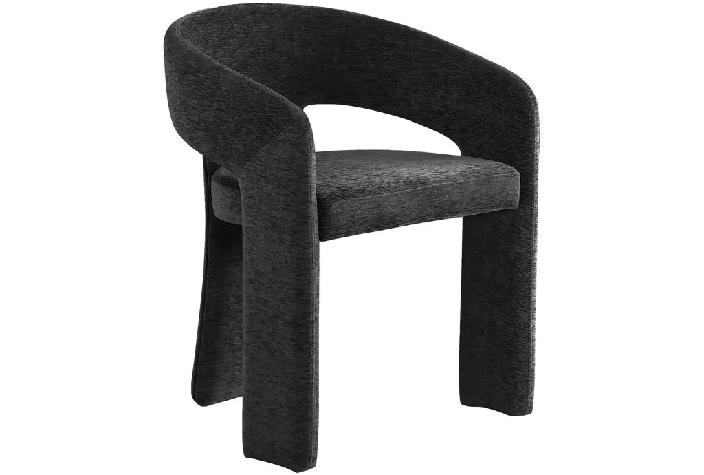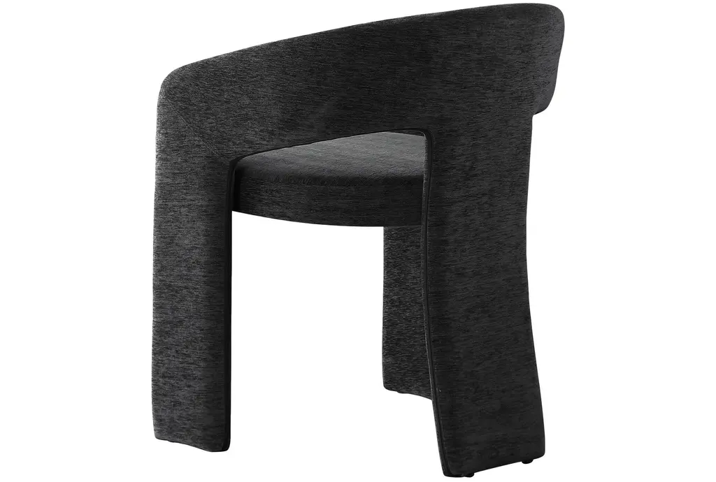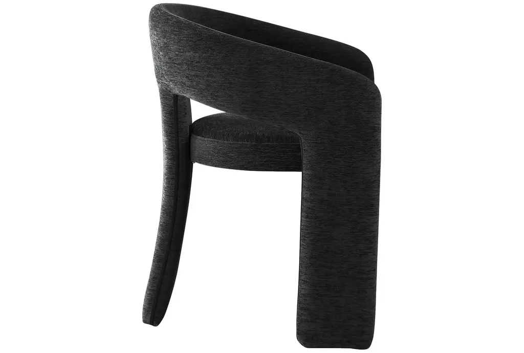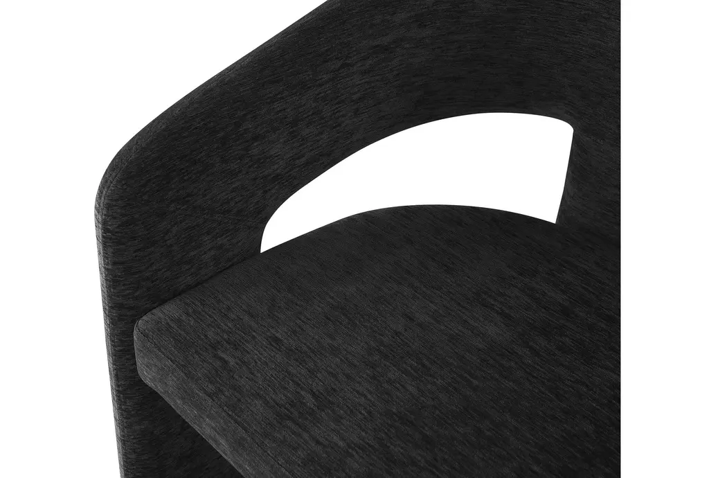 The Rendition Black Plush Fabric Dining Vanity Chair pairs modern silhouette with comfort, offering a curved barrel profile that works equally well at a dining table or a vanity. Upholstered in plush black fabric over an iron frame and engineered wood base, it features a foam seat cushion for cloud-like comfort and dependable support. A subtle cutout at the back and recessed arm create approachable form and ease of movement, while the iron frame's polished finish adds refined durability for everyday use.