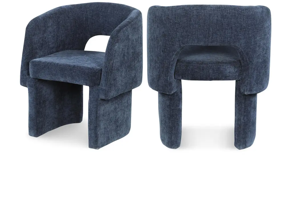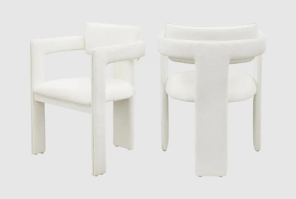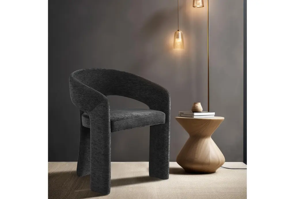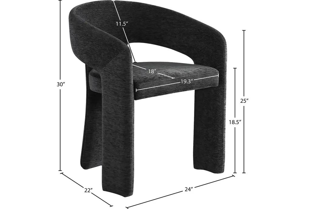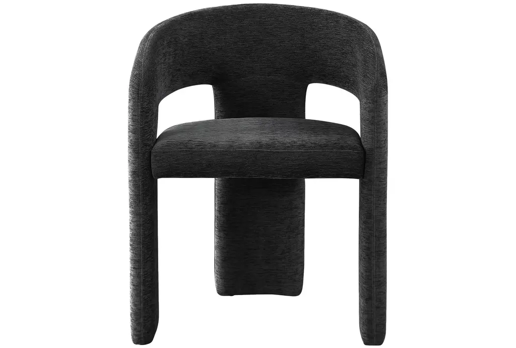 The Rendition Black Plush Fabric Dining Vanity Chair pairs modern silhouette with comfort, offering a curved barrel profile that works equally well at a dining table or a vanity. Upholstered in plush black fabric over an iron frame and engineered wood base, it features a foam seat cushion for cloud-like comfort and dependable support. A subtle cutout at the back and recessed arm create approachable form and ease of movement, while the iron frame's polished finish adds refined durability for everyday use.