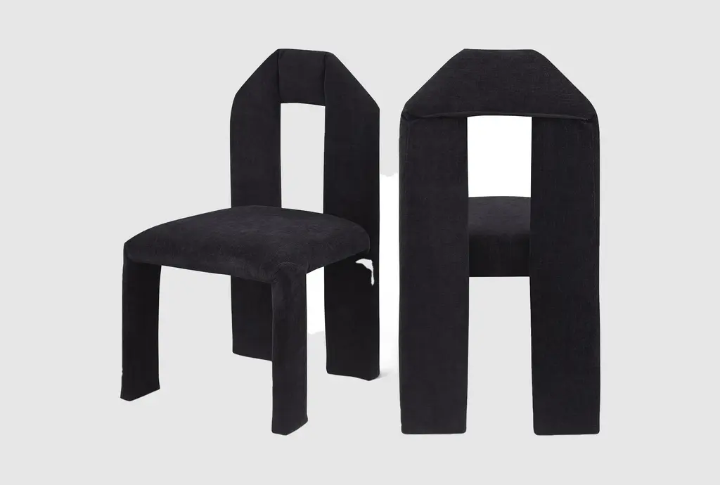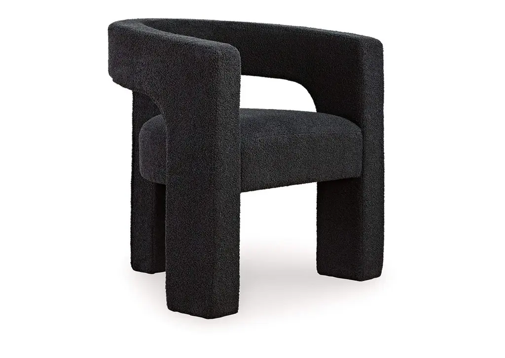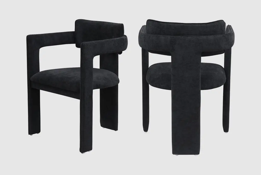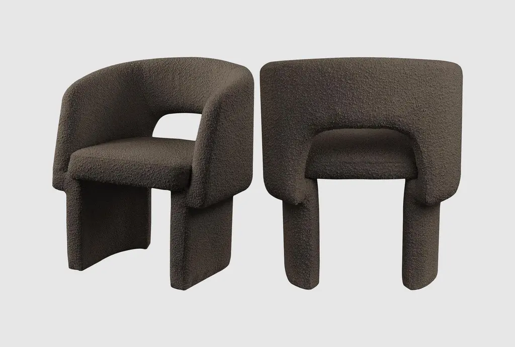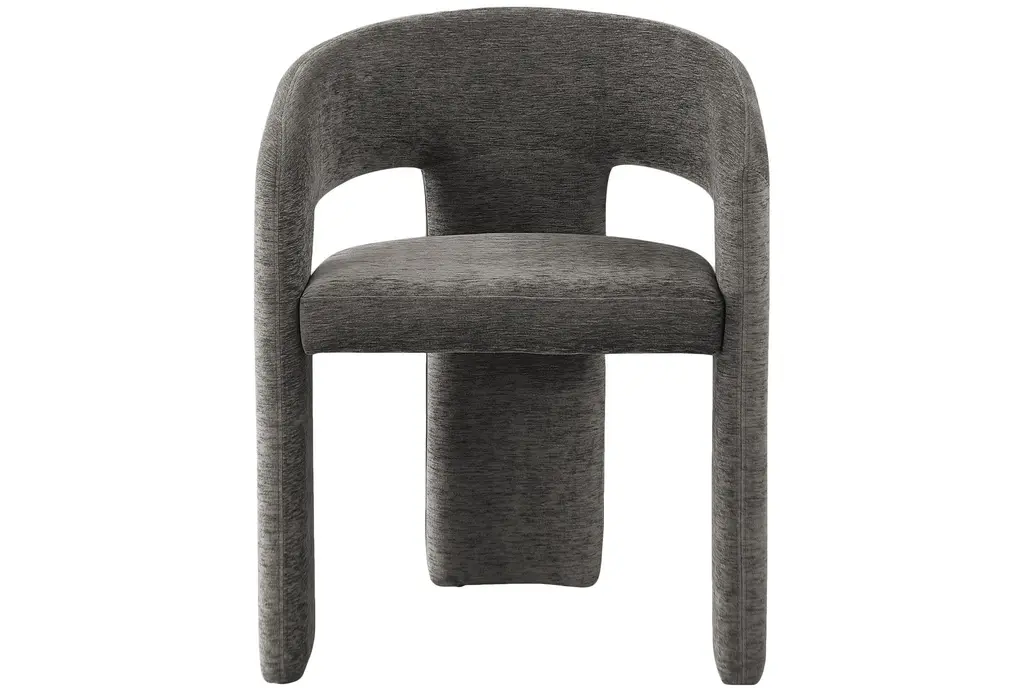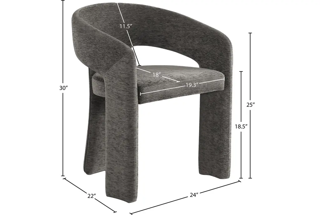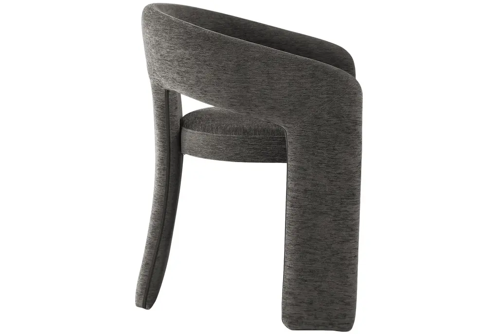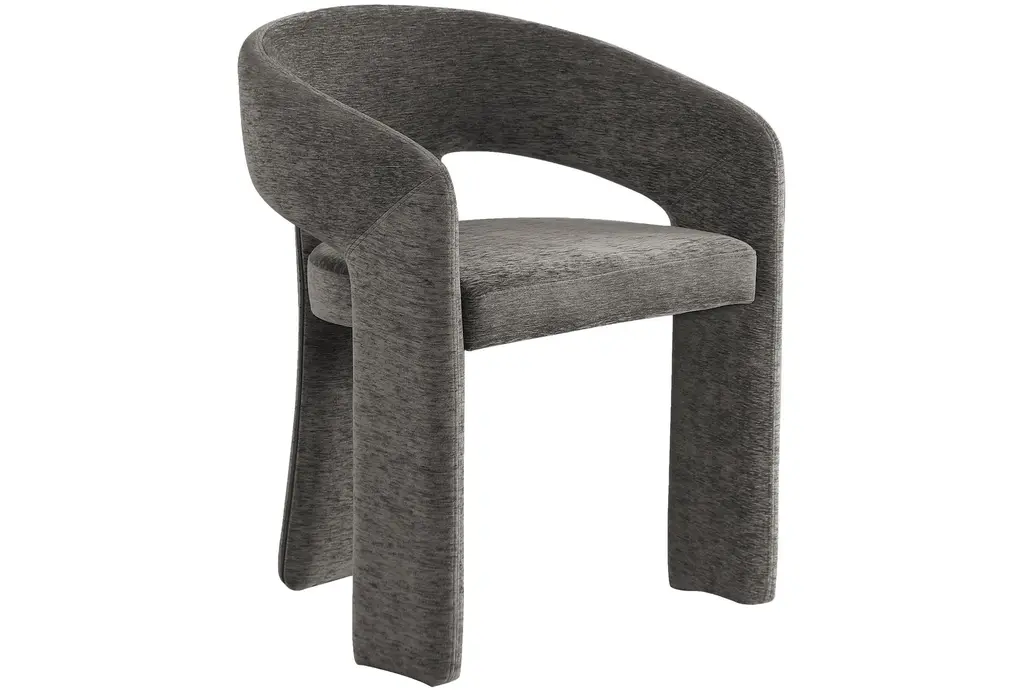 Rendition Grey Plush Fabric Dining Vanity Chair offers modern, comfort-forward seating for dining and vanity spaces with a curved barrel profile and a subtle cutout back. Upholstered in plush grey fabric over a foam seat cushion, it delivers cloud-like support for meals or grooming. The chair rests on an iron frame with engineered wood reinforcement for steady support, while a recessed arm provides gentle lateral support without adding bulk. Its compact footprint and comfortable profile make it a versatile choice for dining rooms, kitchens, or dressing areas.