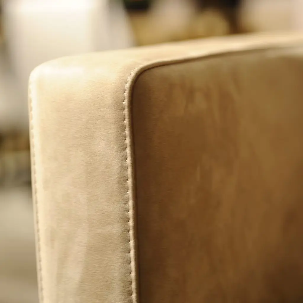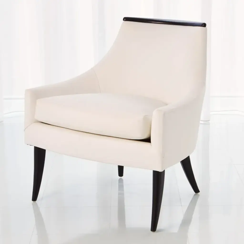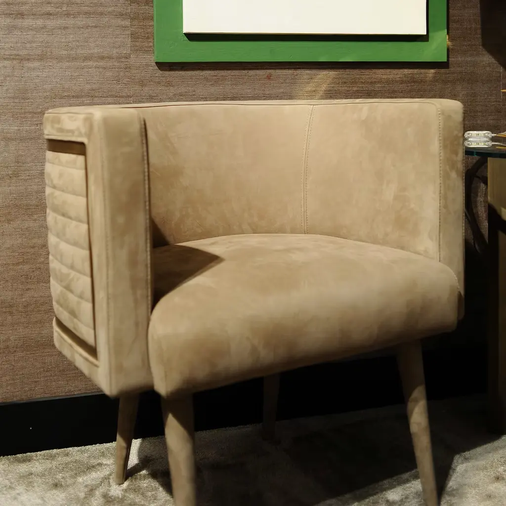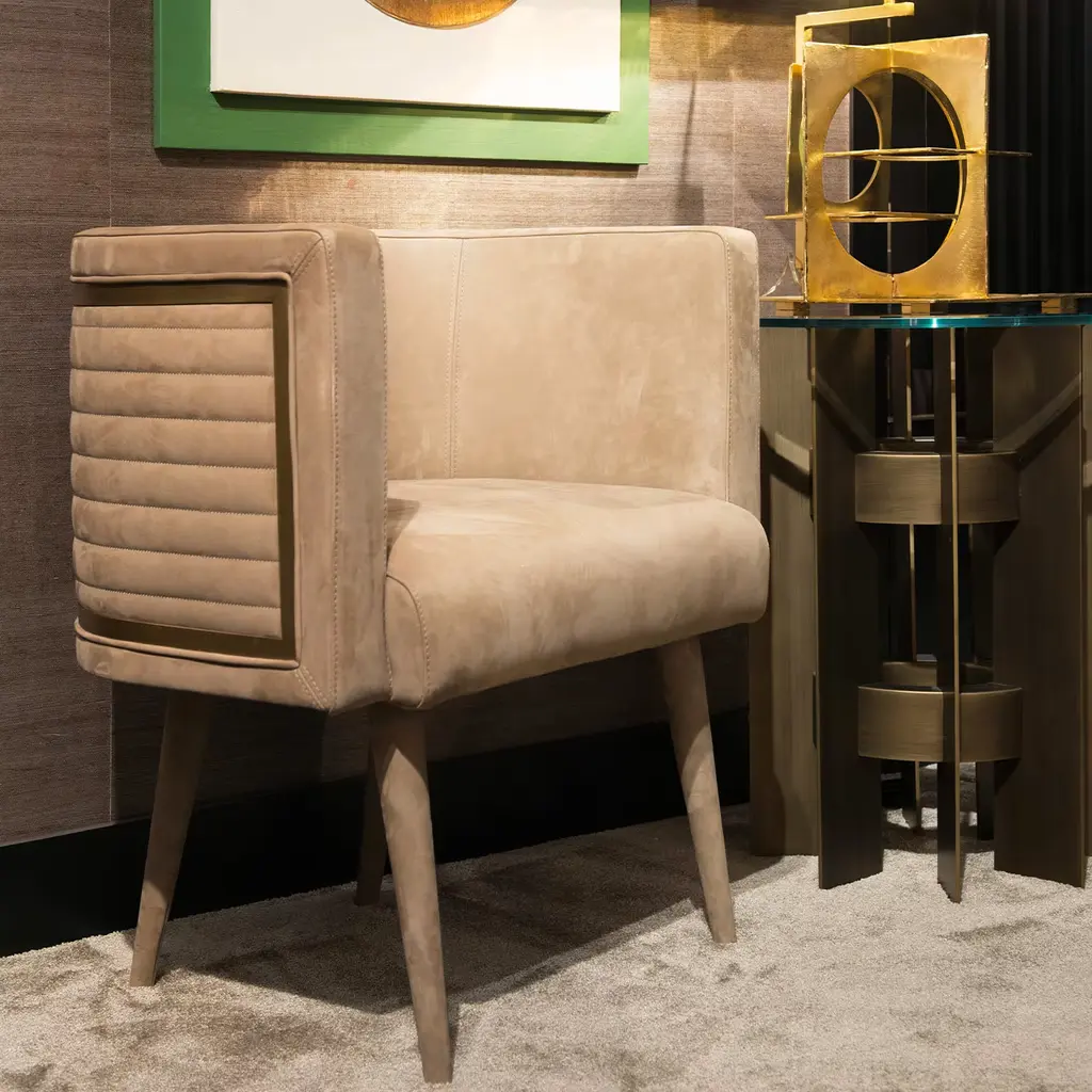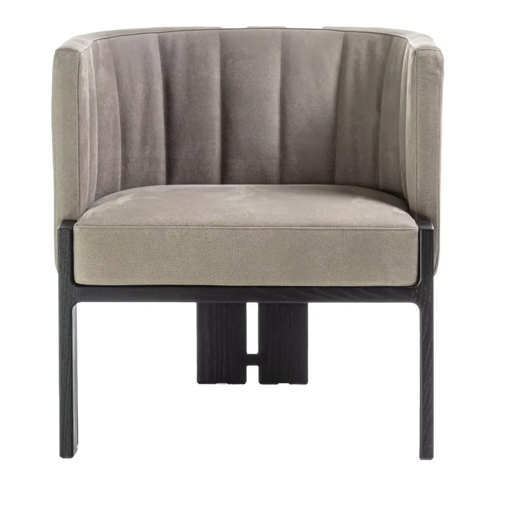 Masterfully crafted of solid wood, this elegant chair displays a versatile and cozy design. The combination of the semicircular backrest and seat (height 47 cm) provides extraordinary comfort, thanks to the polyurethane foam padding and upholstery in soft, light gray leather. Sitting atop four dainty legs, this piece is enriched by a grooving decoration with brass-finished metal inserts gracing the exterior of the backrest. This elegant chair is available in other finishes and colors upon request, as well as in leather upholstery.