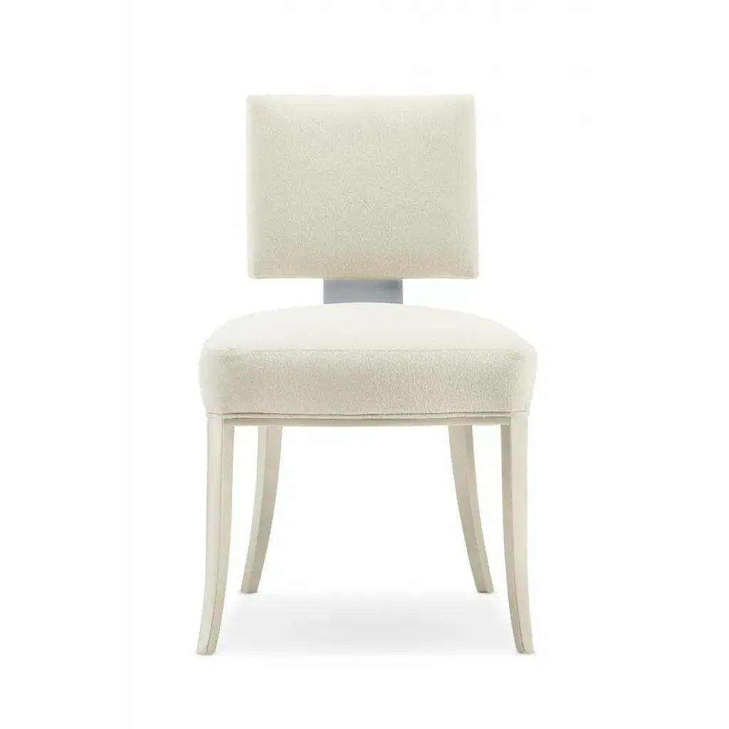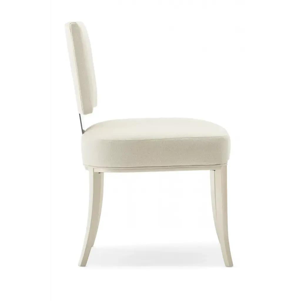 For a fresh interpretation on a low, modern klismos chair, this silhouette takes on dramatic style when you view the wide panel that sets off its back. A neutral sateen fabric with a subtle moire pattern fully surrounds the square upper back and seat cushion that rest on an exposed wood frame and sabre legs finished in Soft Silver Paint. This is a chair with truly polished appeal.