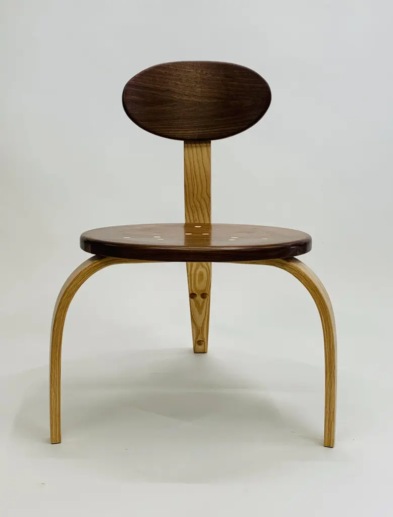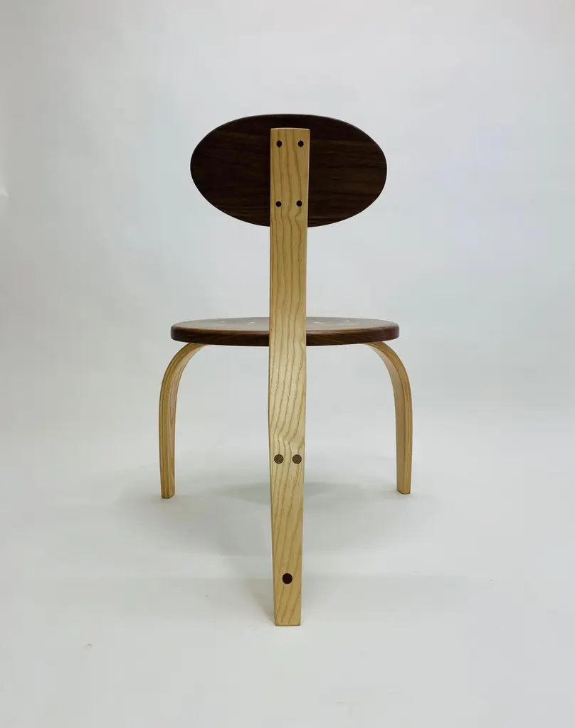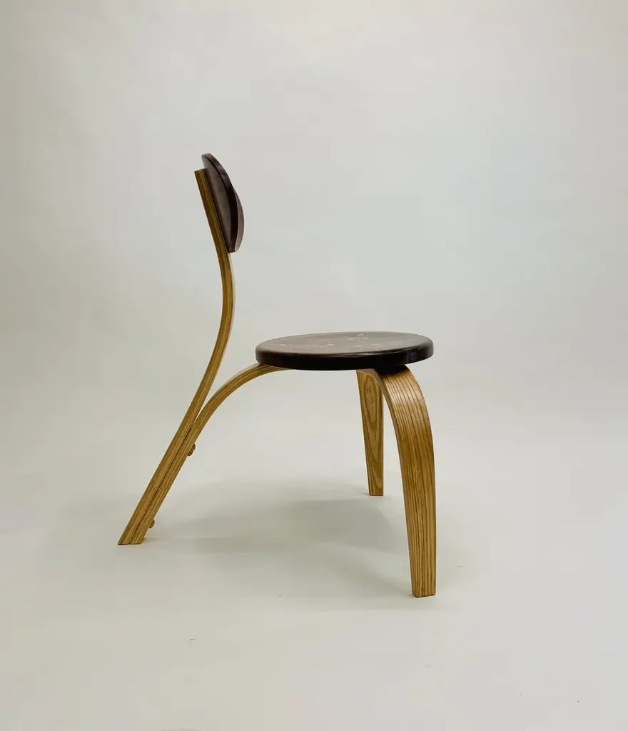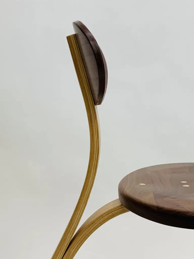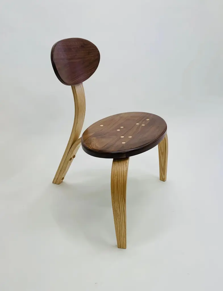 The Jetsons Dining Chair faces the future with optimism and fun. Walnut and ash wood provide the two-tone look. A matching dining table from Jambosco is coming very soon.The Jetsons Dining Chair comes with white glove delivery to ensure a ding-free ownership experience. 25" W x 33" H x 27" DAll sales are final - no refundsThe Story behind the Jetsons Dining Chair:The Jetsons Dining Chair is my ode to the futurism of the 1960s, as seen in the Jetsons cartoon strip of that era. So, a bit of Mid-Century Modernism plus swooping curves. For me, typical dining chairs often struggle to find elegant ways to provide support for the seat and the back rest. It usually seems like there's too much stuff back there. With this chair, the long back leg that rises plant-like, together with the sturdy member that supports the back rest, is my answer here. A real bonus with the Jetsons dining chair is the small flex you get from leaning against the back rest. To avoid any instability associated with a three-legged chair, I made the front legs project out to the side. The result is a seat platform stable enough to tap dance on, although I haven't tried that yet.The seat front is 17.5 inches high. The two woods used are walnut and ash. The curved pieces are real wood, the result of an industrial process that involves laminations and glue. The main joinery is literally nuts and bolts, with bolt heads recessed and concealed under wooden plugs which I've chosen to accentuate with contrasting wood.