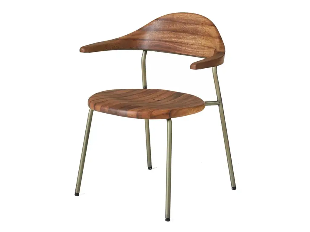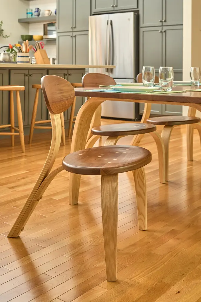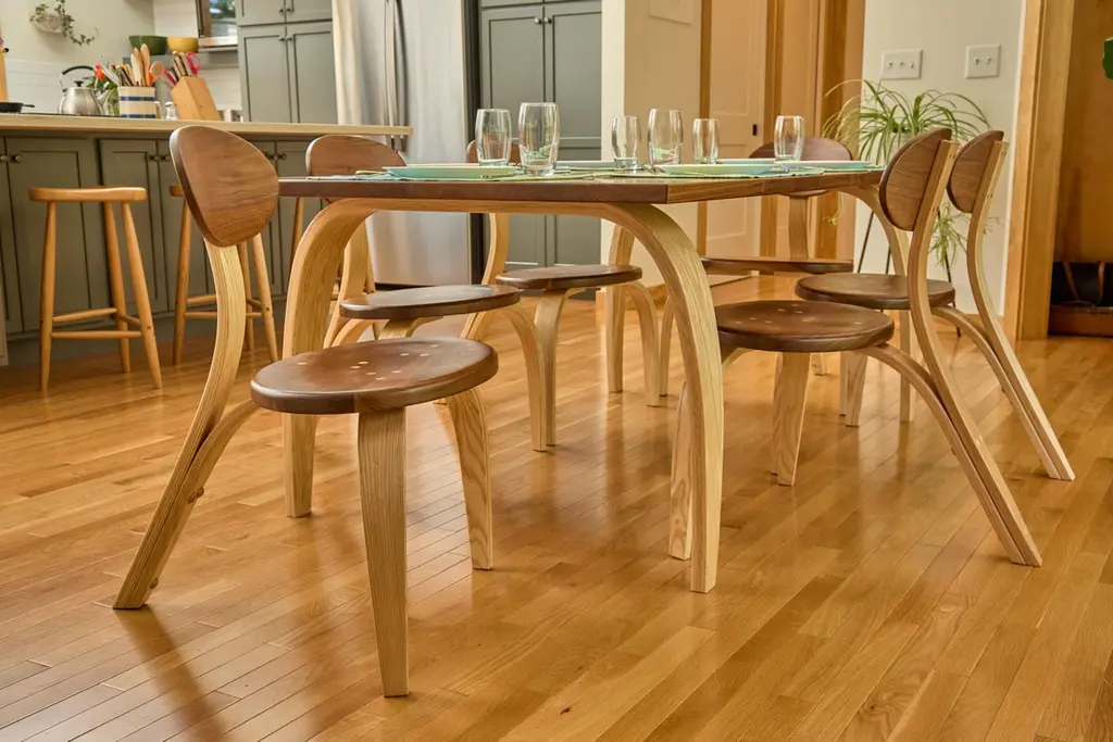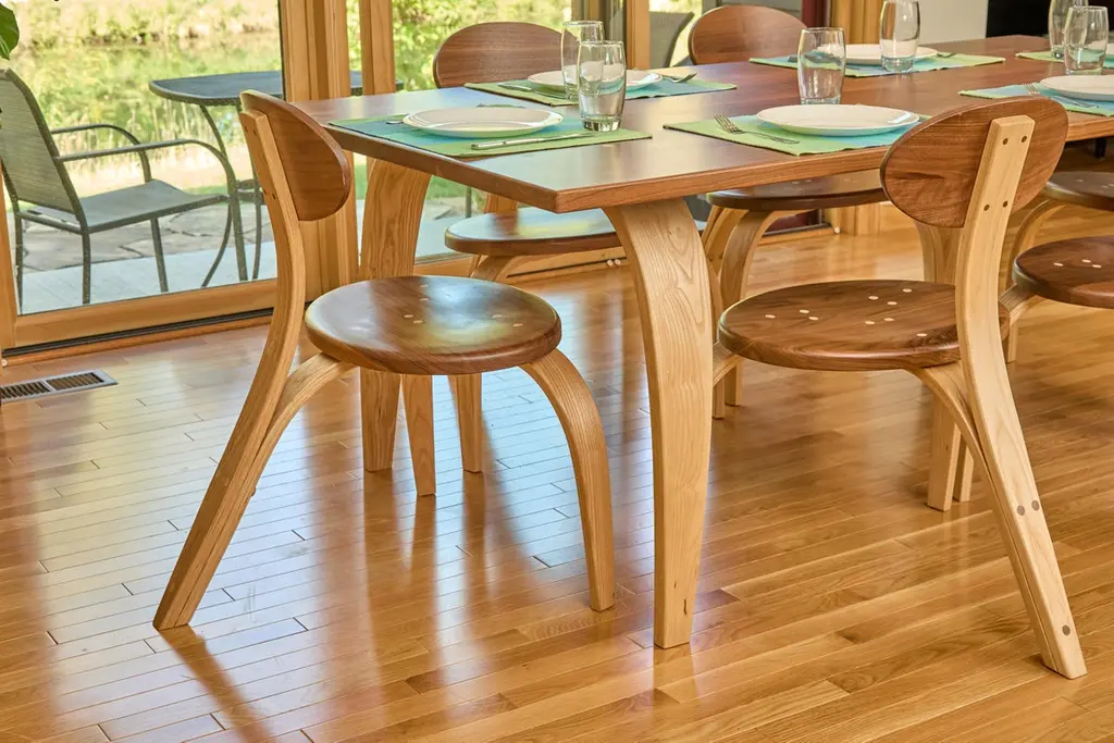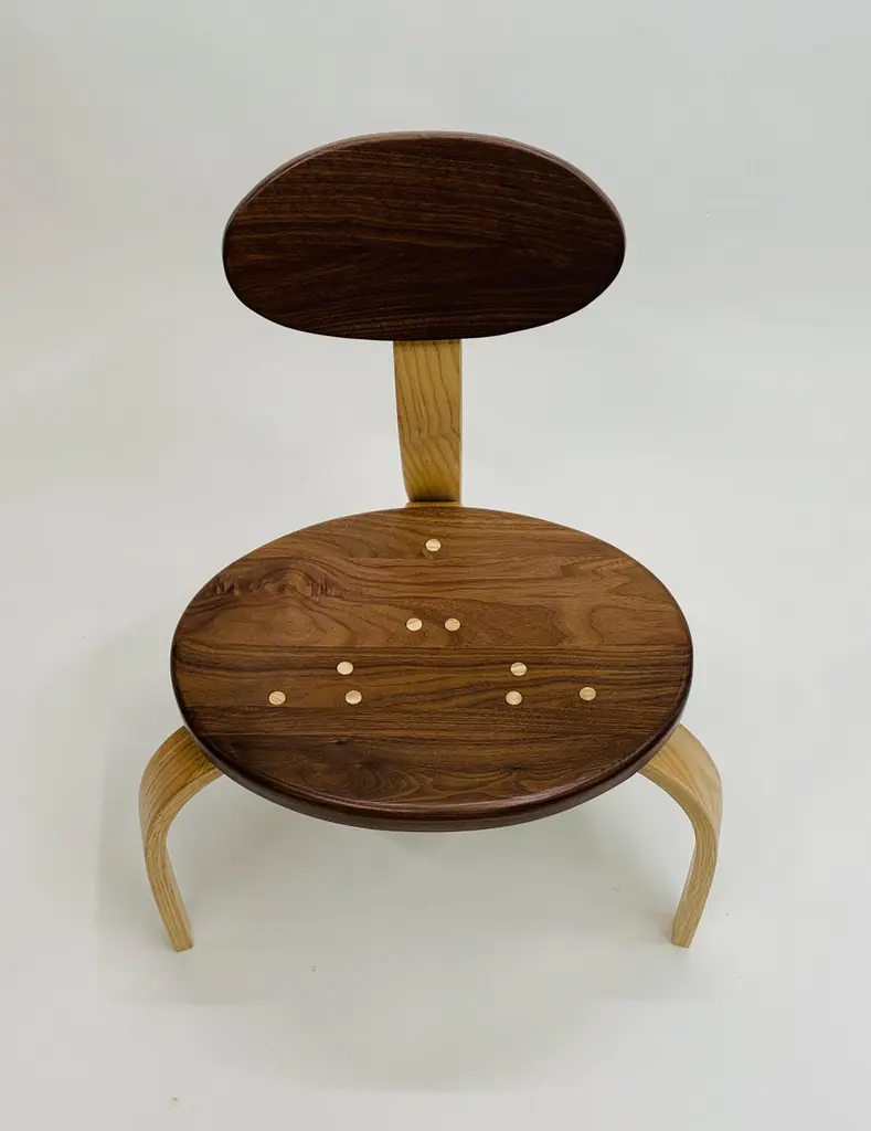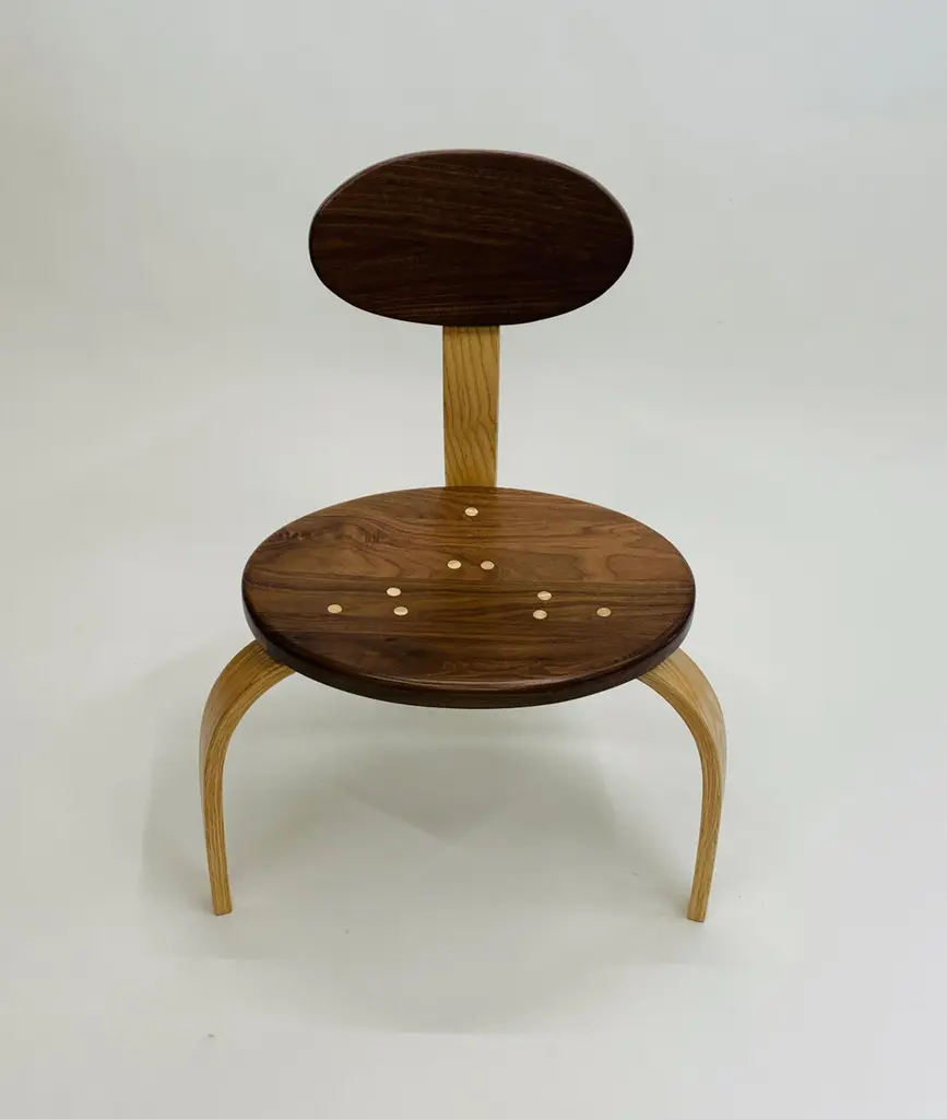 The Jetsons Dining Chair faces the future with optimism and fun. Walnut and ash wood provide the two-tone look. A matching dining table from Jambosco is coming very soon.The Jetsons Dining Chair comes with white glove delivery to ensure a ding-free ownership experience. 25" W x 33" H x 27" DAll sales are final - no refundsThe Story behind the Jetsons Dining Chair:The Jetsons Dining Chair is my ode to the futurism of the 1960s, as seen in the Jetsons cartoon strip of that era. So, a bit of Mid-Century Modernism plus swooping curves. For me, typical dining chairs often struggle to find elegant ways to provide support for the seat and the back rest. It usually seems like there's too much stuff back there. With this chair, the long back leg that rises plant-like, together with the sturdy member that supports the back rest, is my answer here. A real bonus with the Jetsons dining chair is the small flex you get from leaning against the back rest. To avoid any instability associated with a three-legged chair, I made the front legs project out to the side. The result is a seat platform stable enough to tap dance on, although I haven't tried that yet.The seat front is 17.5 inches high. The two woods used are walnut and ash. The curved pieces are real wood, the result of an industrial process that involves laminations and glue. The main joinery is literally nuts and bolts, with bolt heads recessed and concealed under wooden plugs which I've chosen to accentuate with contrasting wood.