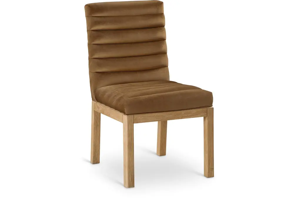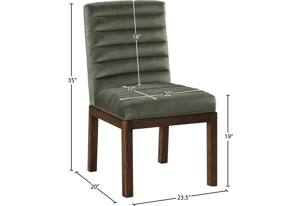 The Revelyn Green Velvet Dining Chair with Brown Leg Finish is a stunning addition to any dining room or kitchen. Upholstered in luxurious velvet, this armless chair combines comfort and style. Its rubberwood legs provide sturdy support and a natural touch.