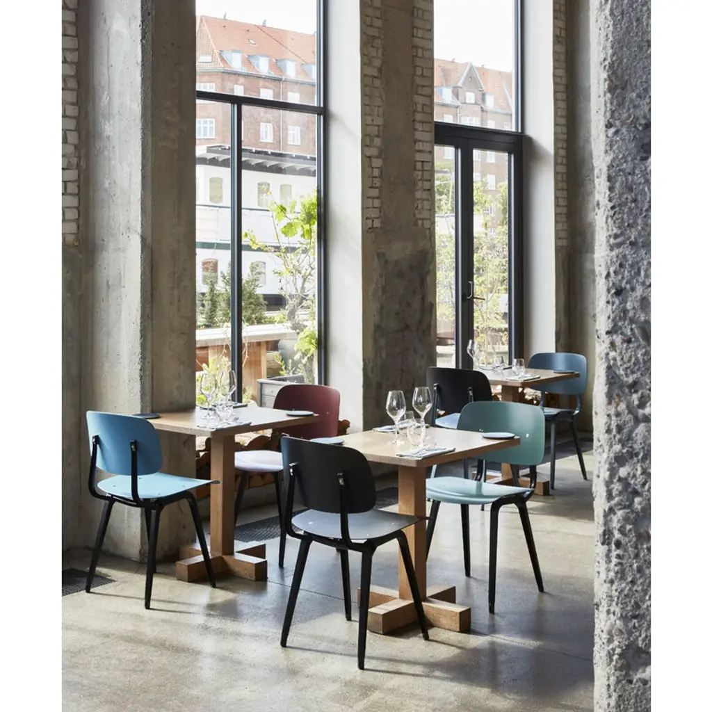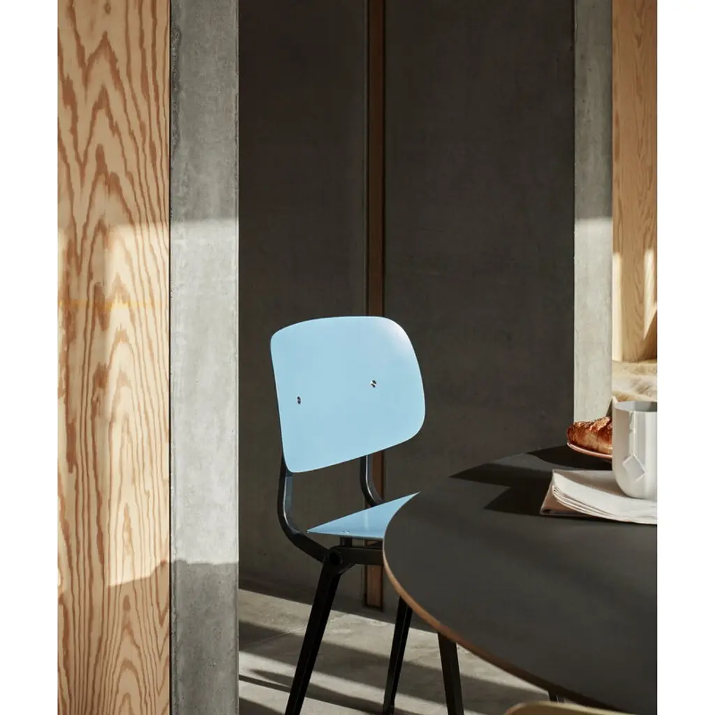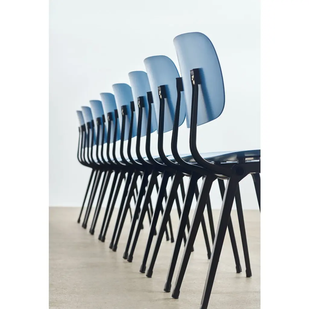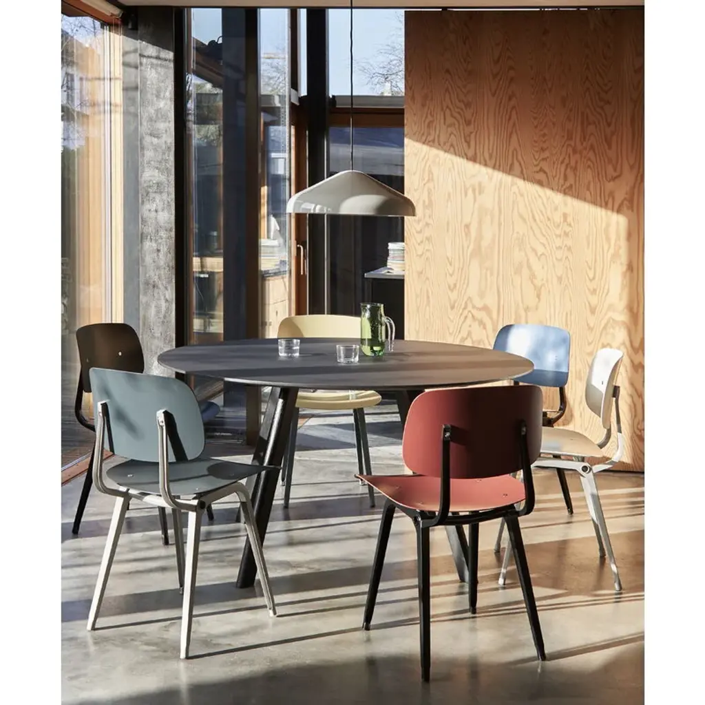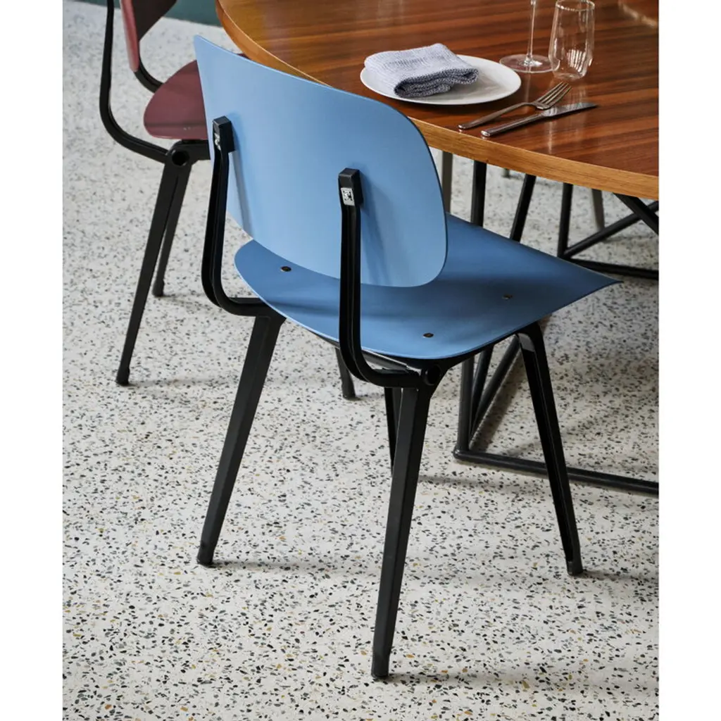 HAY's Revolt chair is a re-release of a seat designed by Friso Kramer for Ahrend in the 1950s. Over the years, the Revolt chair has become one of Kramer's best-known works, and it is an excellent example of the designer's minimalist style. The gist of the Revolt chair lies in its metal frame, which, a bit unusually, is not made of a metal tube but of a thin, angled steel plate. The unique construction of the frame guarantees not only a distinctive appearance but also an ergonomic and comfortable sitting position – the backrest tilts slightly when you sit on the chair. In HAY's re-launched version, the seat and backrest are made from 100% recycled plastic. Due to its simple and versatile design, the Revolt chair is just as at home around a dining table as it is in an office or meeting room.