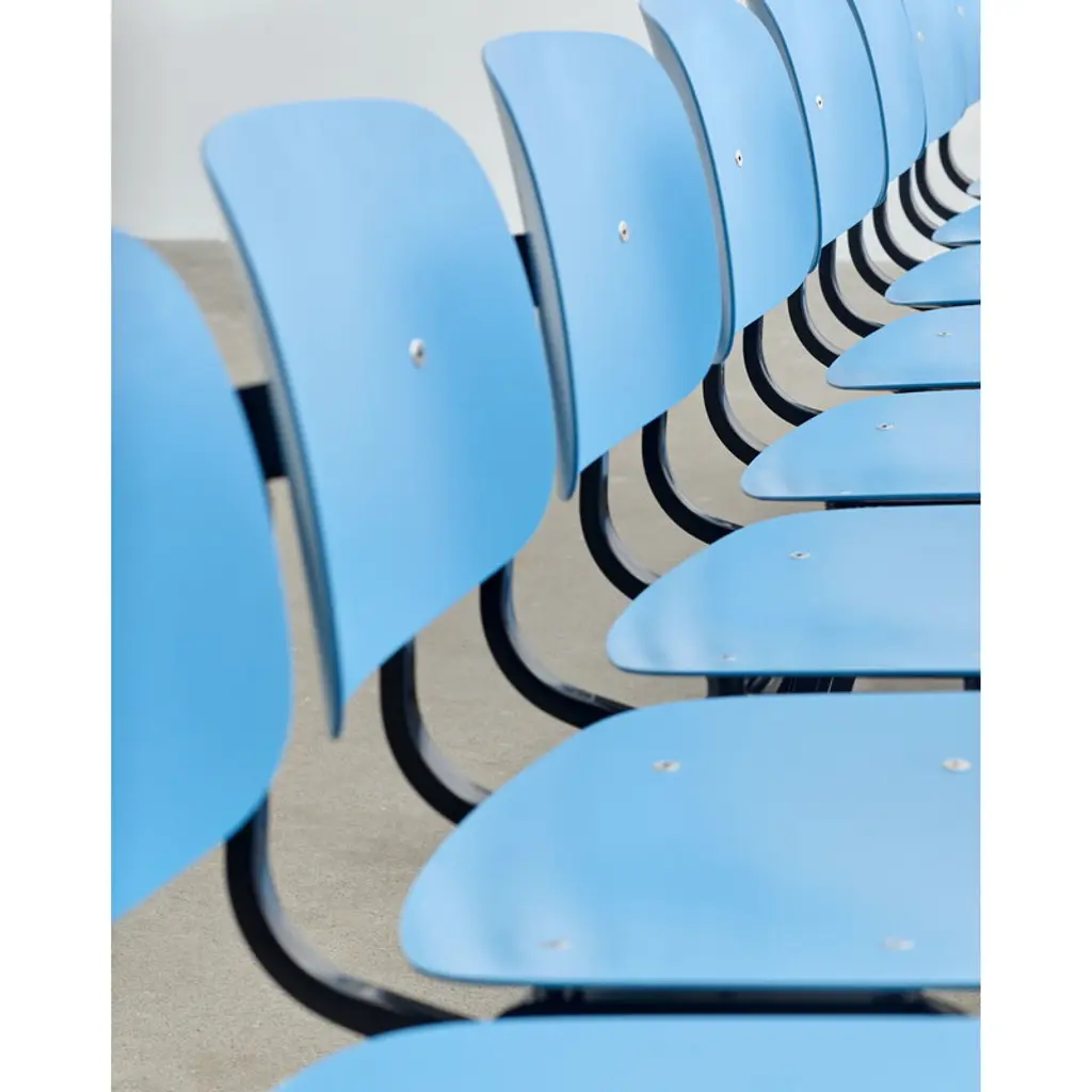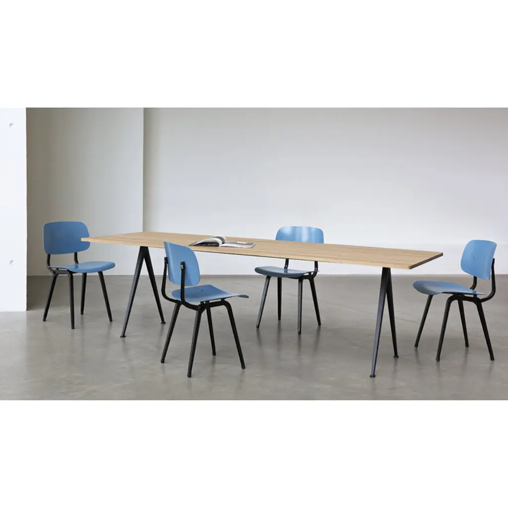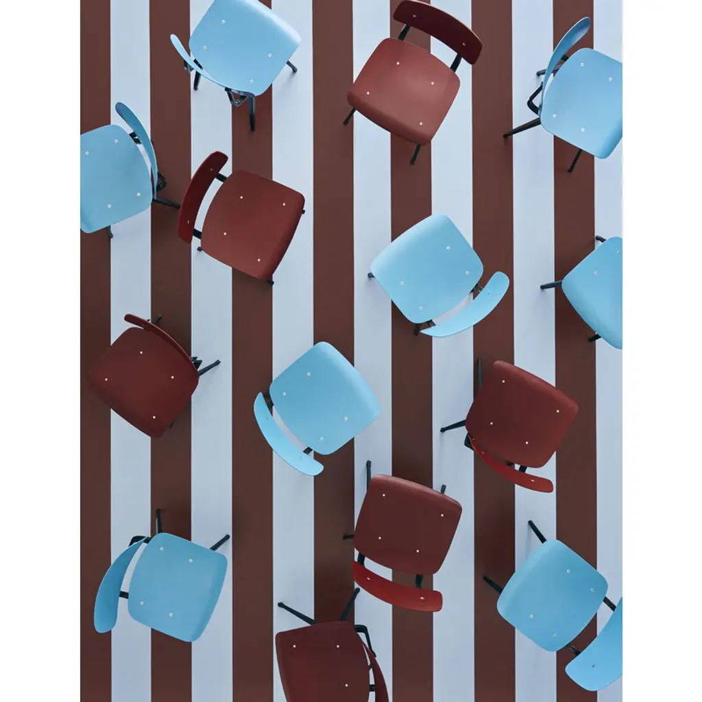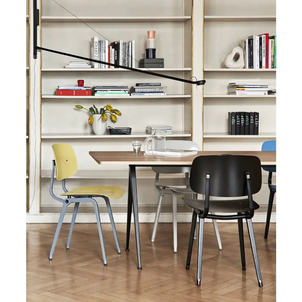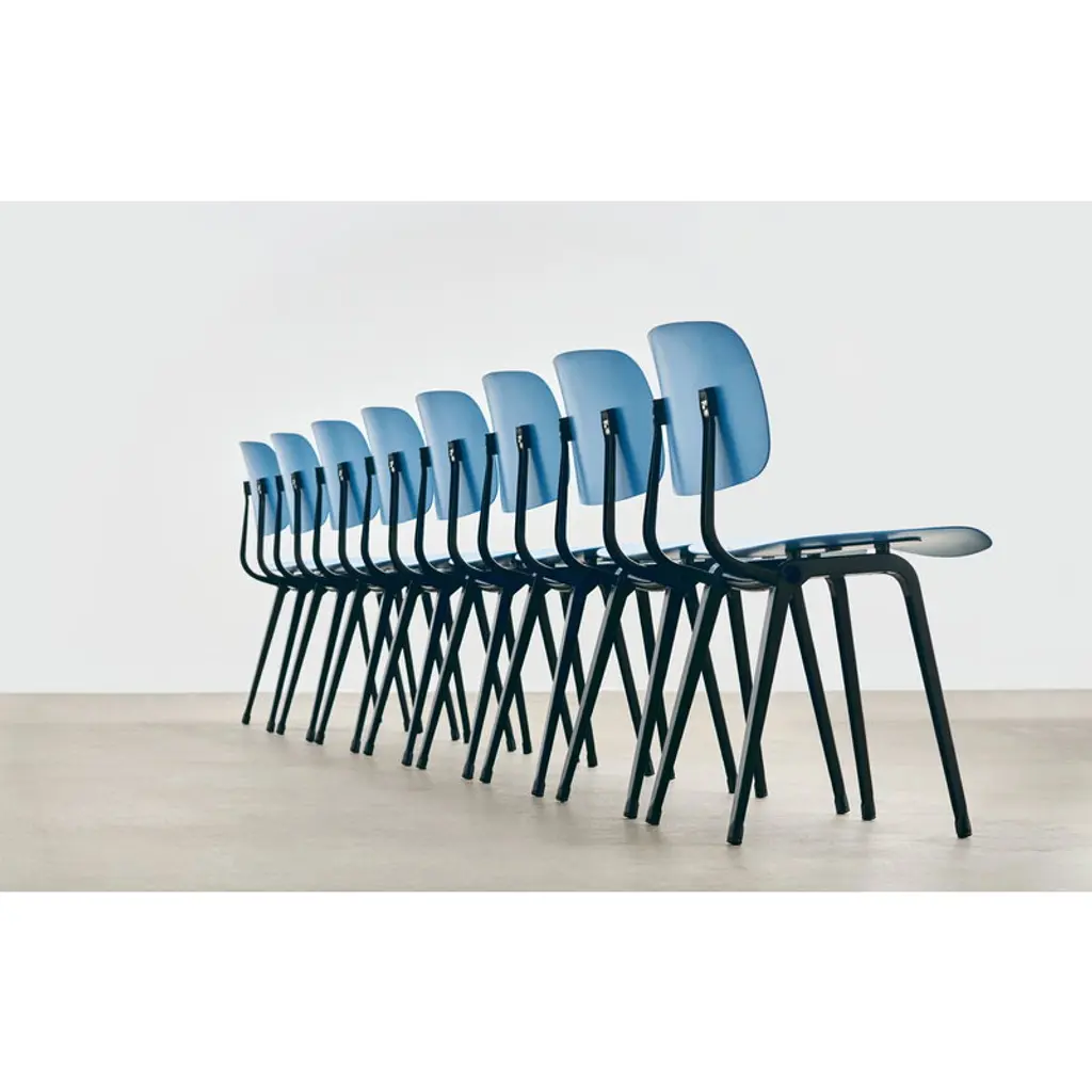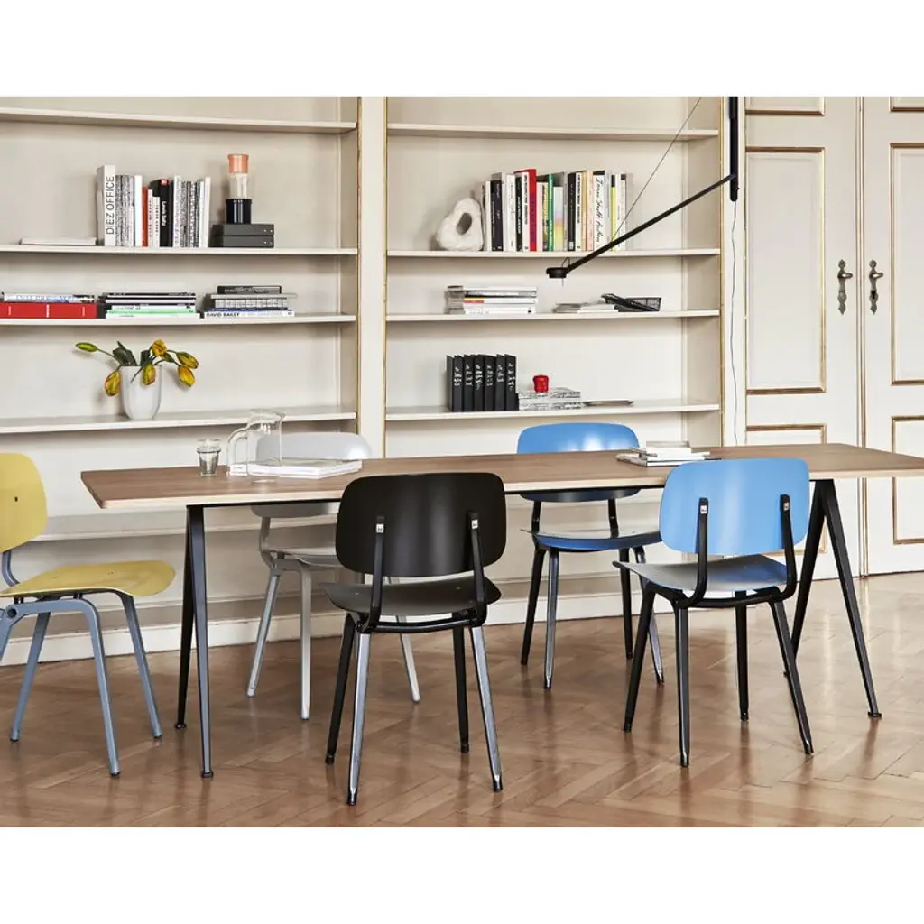 HAY's Revolt chair is a re-release of a seat designed by Friso Kramer for Ahrend in the 1950s. Over the years, the Revolt chair has become one of Kramer's best-known works, and it is an excellent example of the designer's minimalist style. The gist of the Revolt chair lies in its metal frame, which, a bit unusually, is not made of a metal tube but of a thin, angled steel plate. The unique construction of the frame guarantees not only a distinctive appearance but also an ergonomic and comfortable sitting position – the backrest tilts slightly when you sit on the chair. In HAY's re-launched version, the seat and backrest are made from 100% recycled plastic. Due to its simple and versatile design, the Revolt chair is just as at home around a dining table as it is in an office or meeting room.