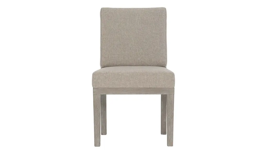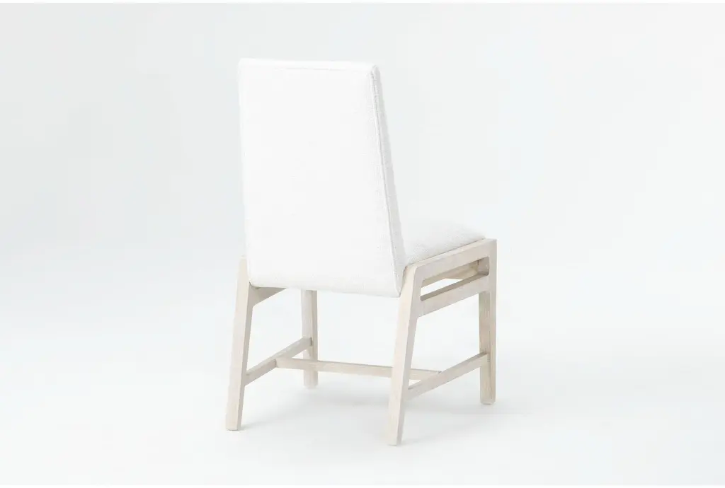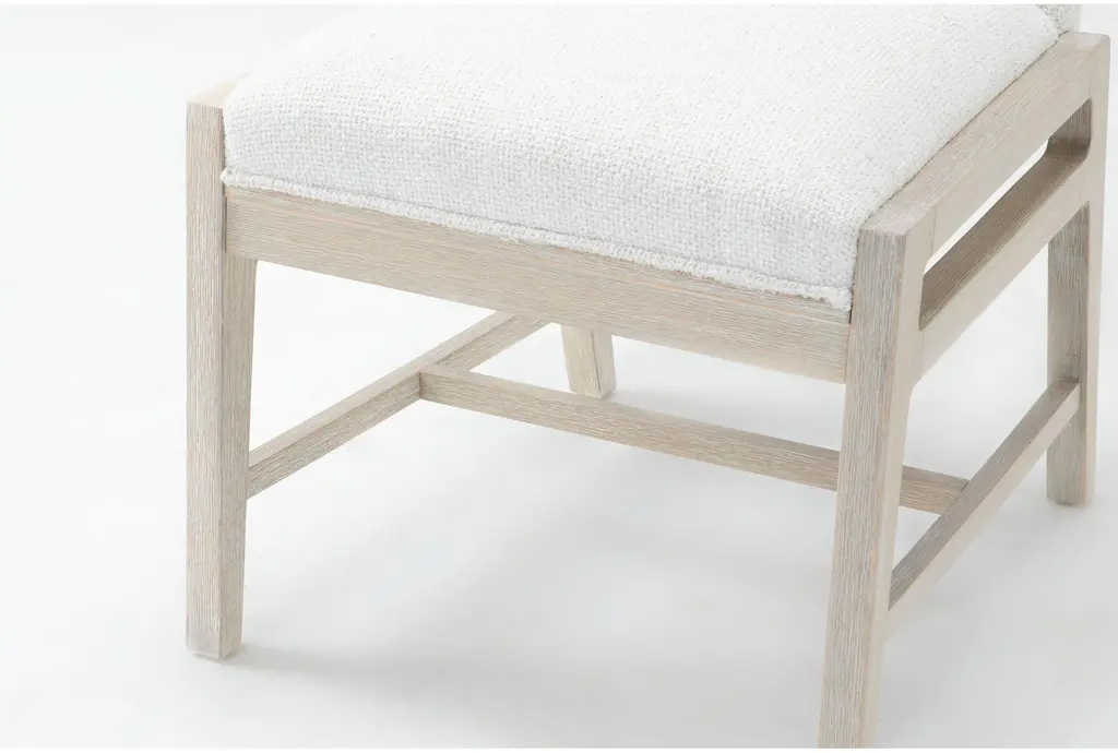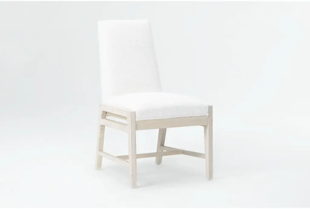 With its light, natural appeal and coastal-inspired style, our Reyes upholstered dining chair instantly freshens up your space. Solid hardwood and flaky oak veneer are decked in a white oak finish for a look that is calm, cool and casual. This piece boasts contemporary design details and durable performance fabric.