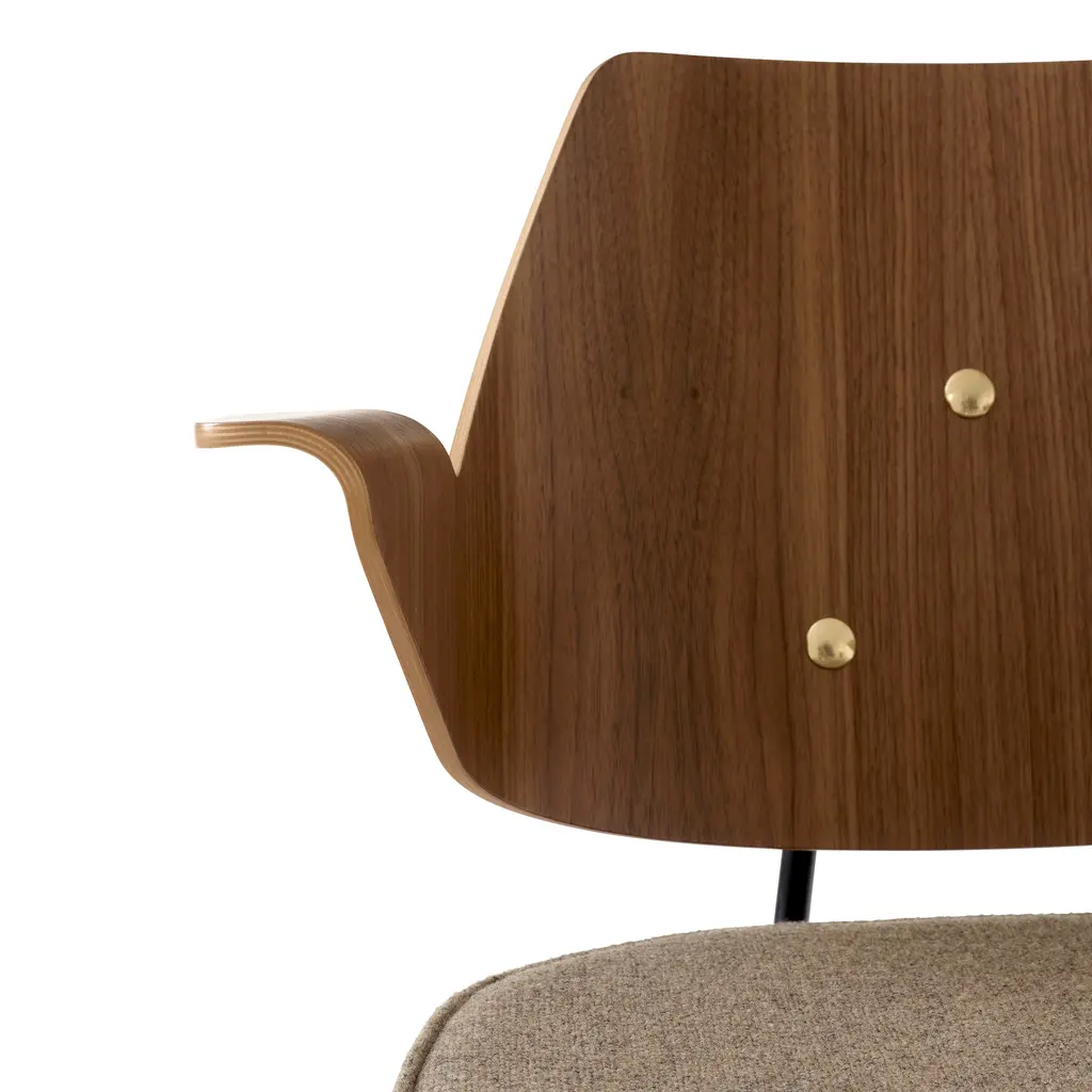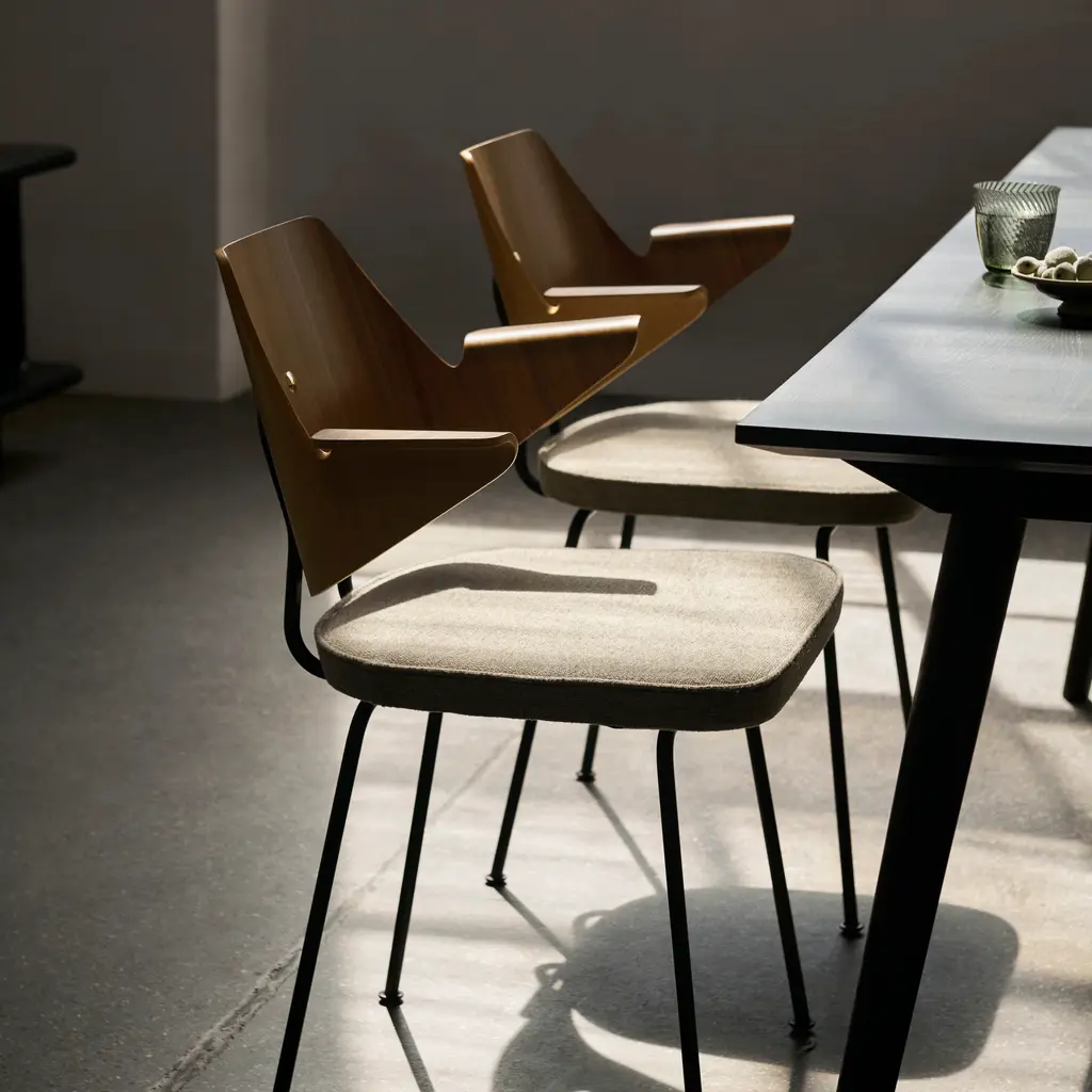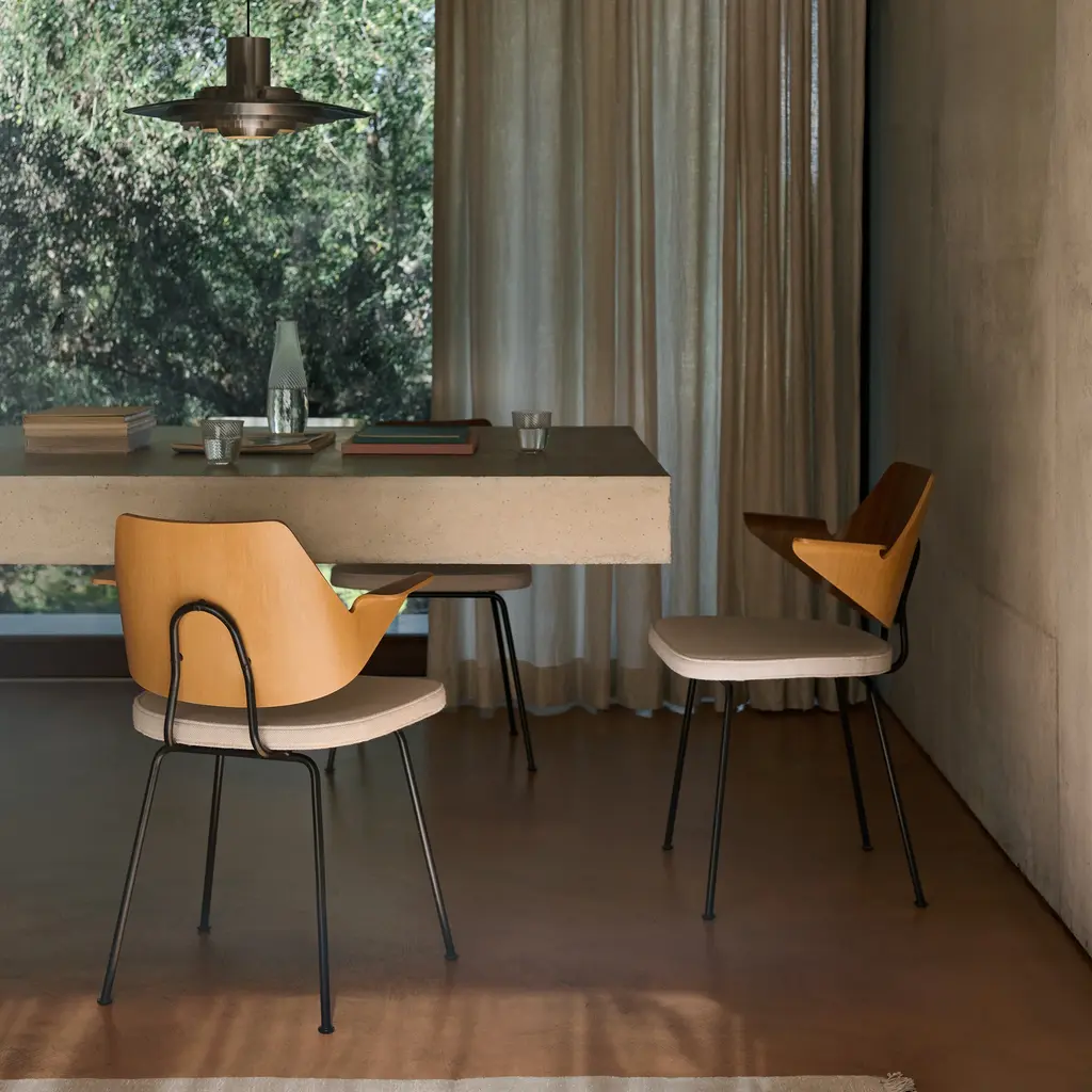 Originally designed for the dining rooms of London’s Royal Festival Hall, the RFH Armchair RD7 features a gently curved backrest and outward-reaching armrests, creating a welcoming, ergonomic silhouette. The chair is crafted from a mix of walnut and beech veneers, expertly shaped through form-press molding to achieve its graceful curves. Its upholstered seat, filled with CMHR foam, is wrapped in high-quality fabric or leather. This reissued Robin Day design preserves its timeless appeal.