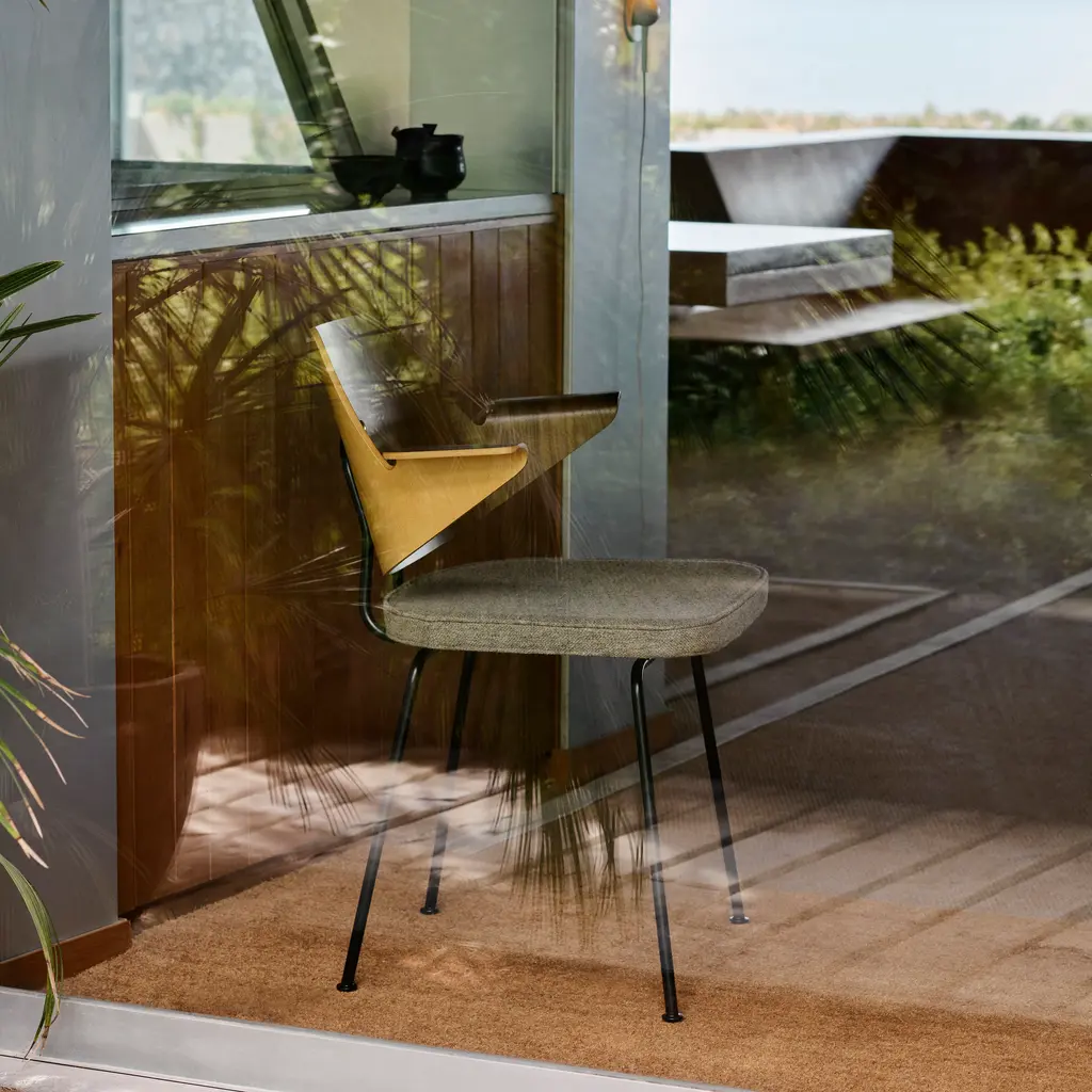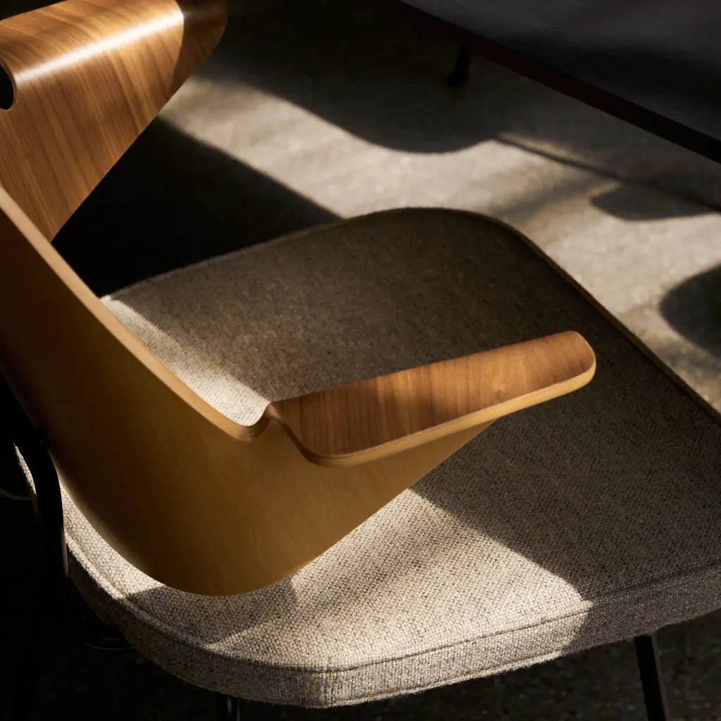 Originally designed for the dining rooms of London’s Royal Festival Hall, the RFH Armchair RD7 features a gently curved backrest and outward-reaching armrests, creating a welcoming, ergonomic silhouette. The chair is crafted from a mix of walnut and beech veneers, expertly shaped through form-press molding to achieve its graceful curves. Its upholstered seat, filled with CMHR foam, is wrapped in high-quality fabric or leather. This reissued Robin Day design preserves its timeless appeal.