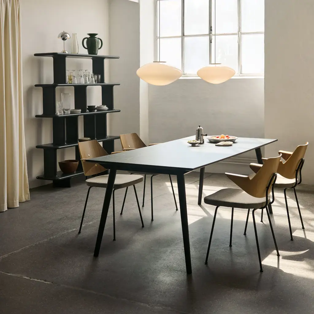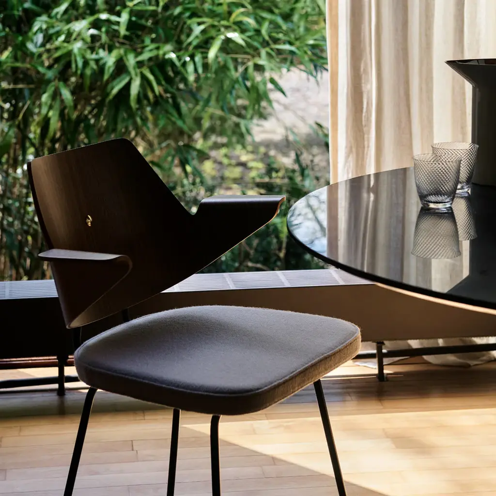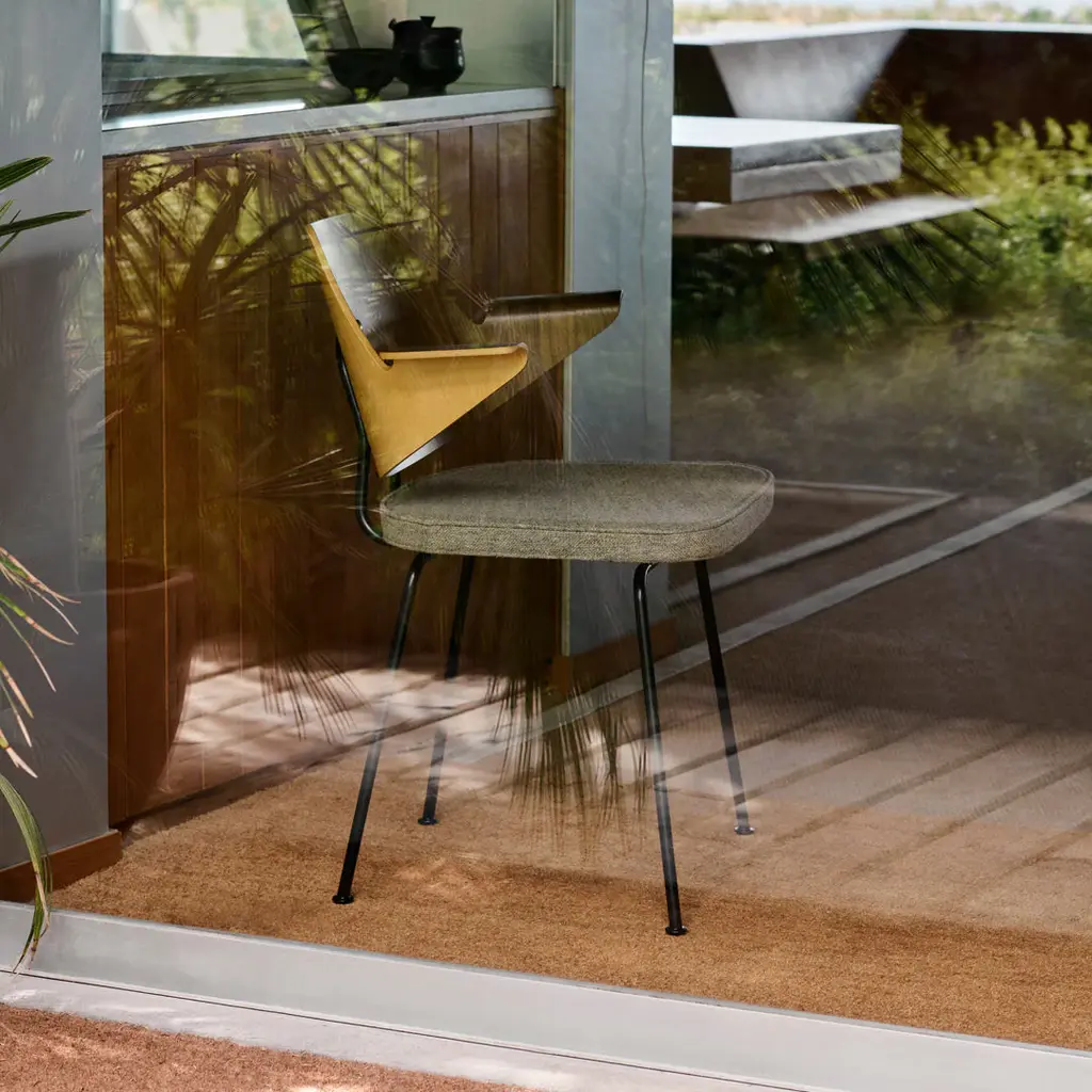 Originally created to seat visitors in the dining rooms of the Royal Festival Hall, the RFH Armchair by Robin Day is characterized by the softly curved backrest and outwardly reaching arms. Rich in materiality, the chair's striking form is achieved through a process of form-press moulding layers of beech and walnut veneer.