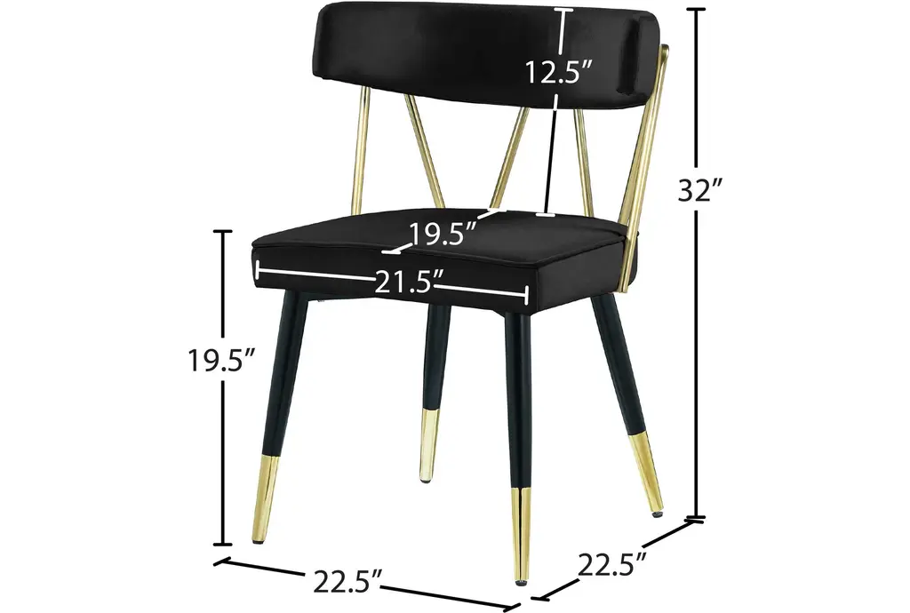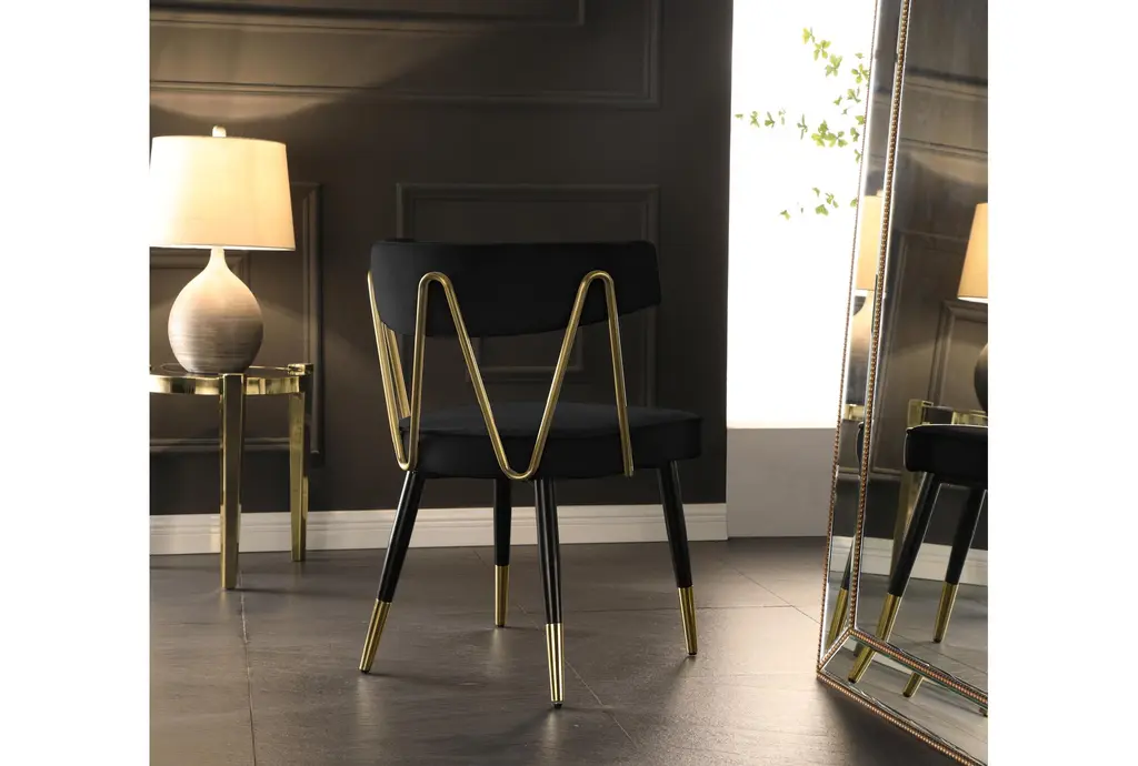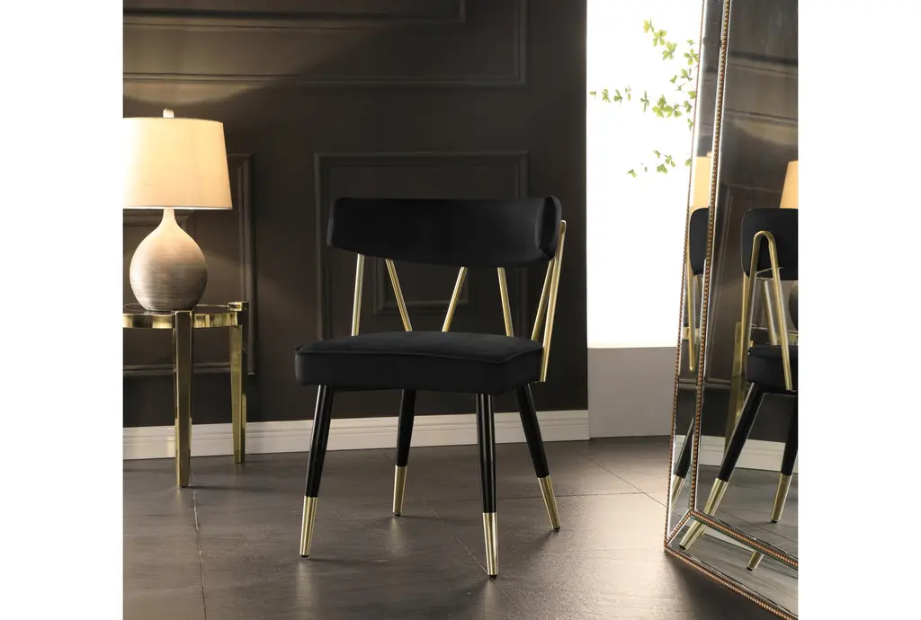 The Rheingold Black Velvet Dining Chair with Matte Black / Gold Finish Set of 2 is a stylish addition to any dining room. These modern chairs are upholstered in soft velvet and supported by sturdy engineered wood and iron frames. The foam cushioning ensures comfort during meals and gatherings.