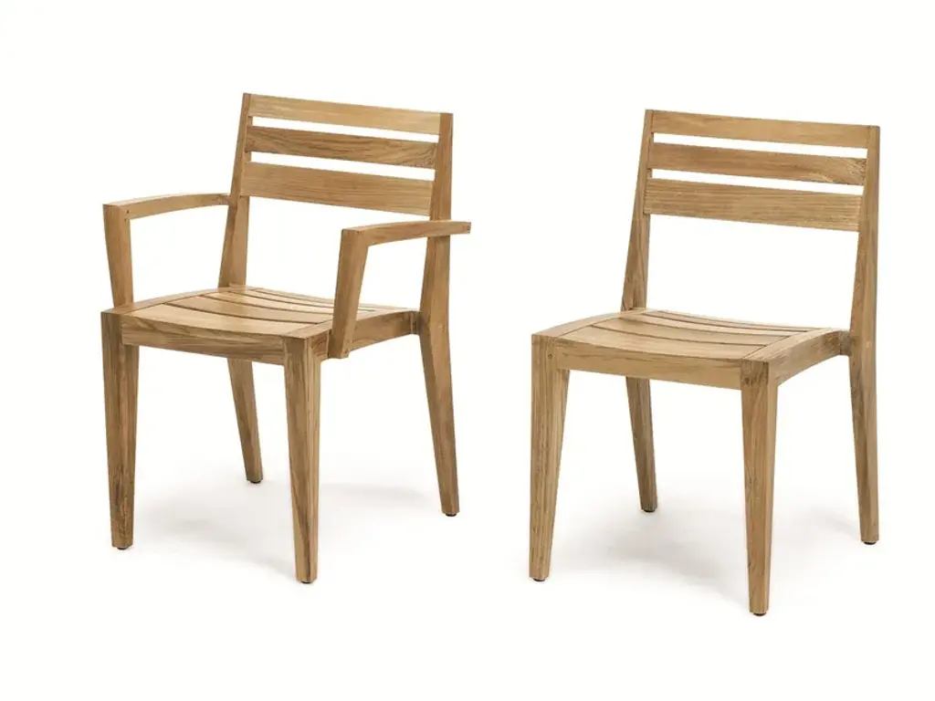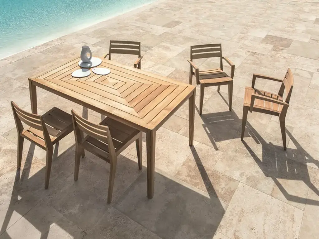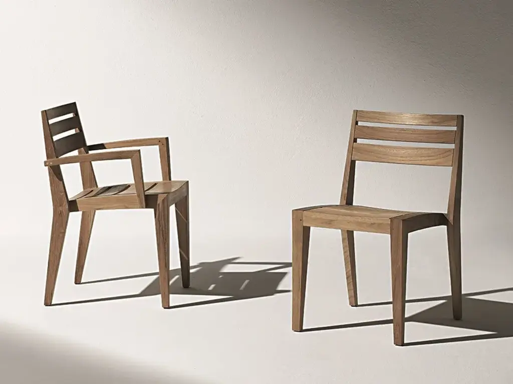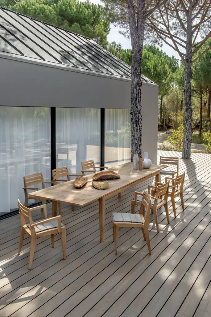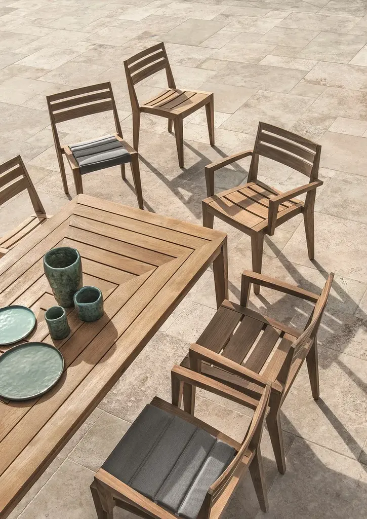 Ribot is the small armchair, designed by Marc Sadler, made entirely of teak with refined and decisive lines, which furnishes the outdoors with style and personality.The Ribot family was created to offer the private and contract world a choice of multi-purpose, durable teak chairs specific for outdoor use. The Ribot range is extended with the armchair designed for lounge situations enriched with a removable footrest that transforms the seat into a relaxing chaise longue. The design of the dining and lounge seating is completed with a cushion that becomes an integral part of the structure and which, with the new red Navajo, yellow and espresso, enhances the warm and blonde tonality of natural teak. The elegant and minimal design of the collection reveals the constant attention of Ethimo to the details and trends of contemporary outdoor living.