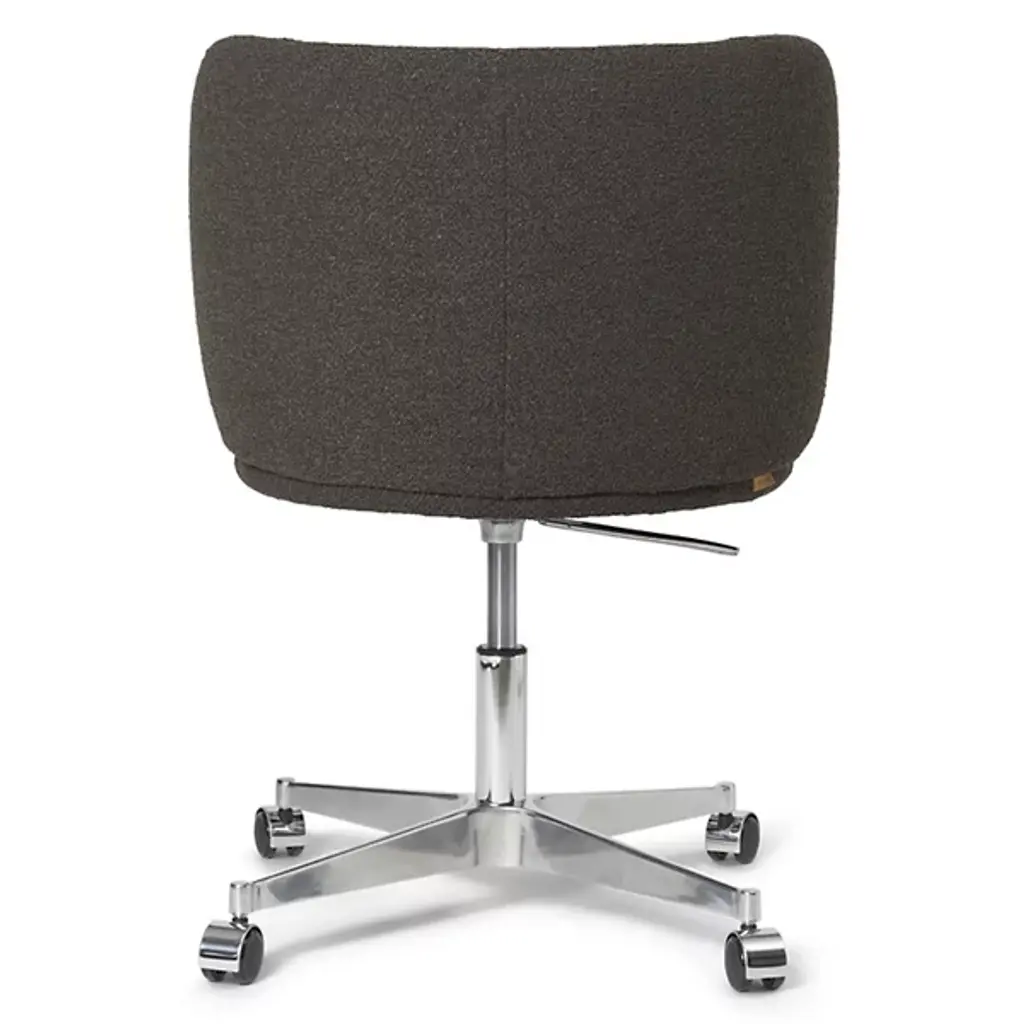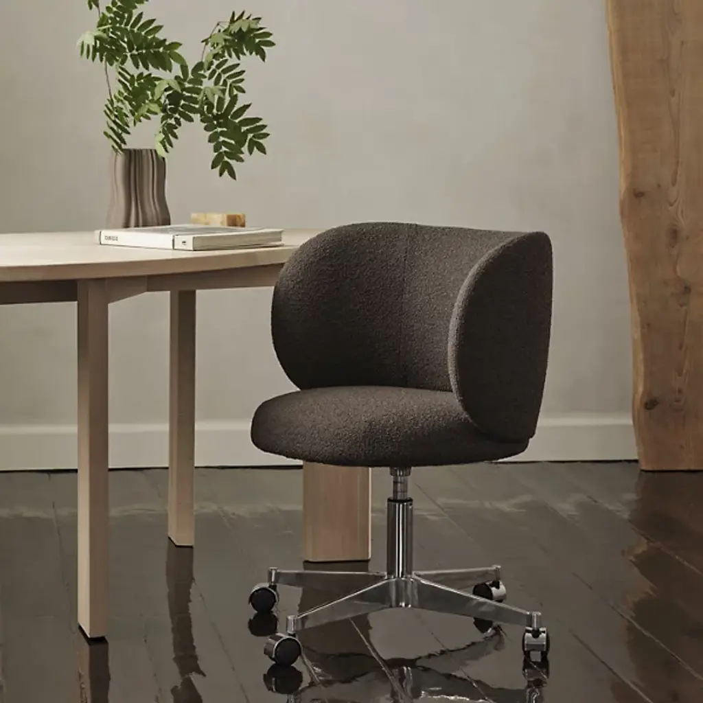 The Rico Dining Chair with Castors - Soft Boucle from Ferm Living introduces soft curves and voluminous shapes to classic design, creating a warm, embracing expression. This chair combines the sleek refinement of chrome with the timeless comfort of plush bouclé upholstery. It is designed for versatility and features castor wheels for easy mobility and an integrated pump for effortless height adjustment. The understated backrest enhances its minimalist appeal, making this chair a refined yet cozy addition to any workspace or living area.