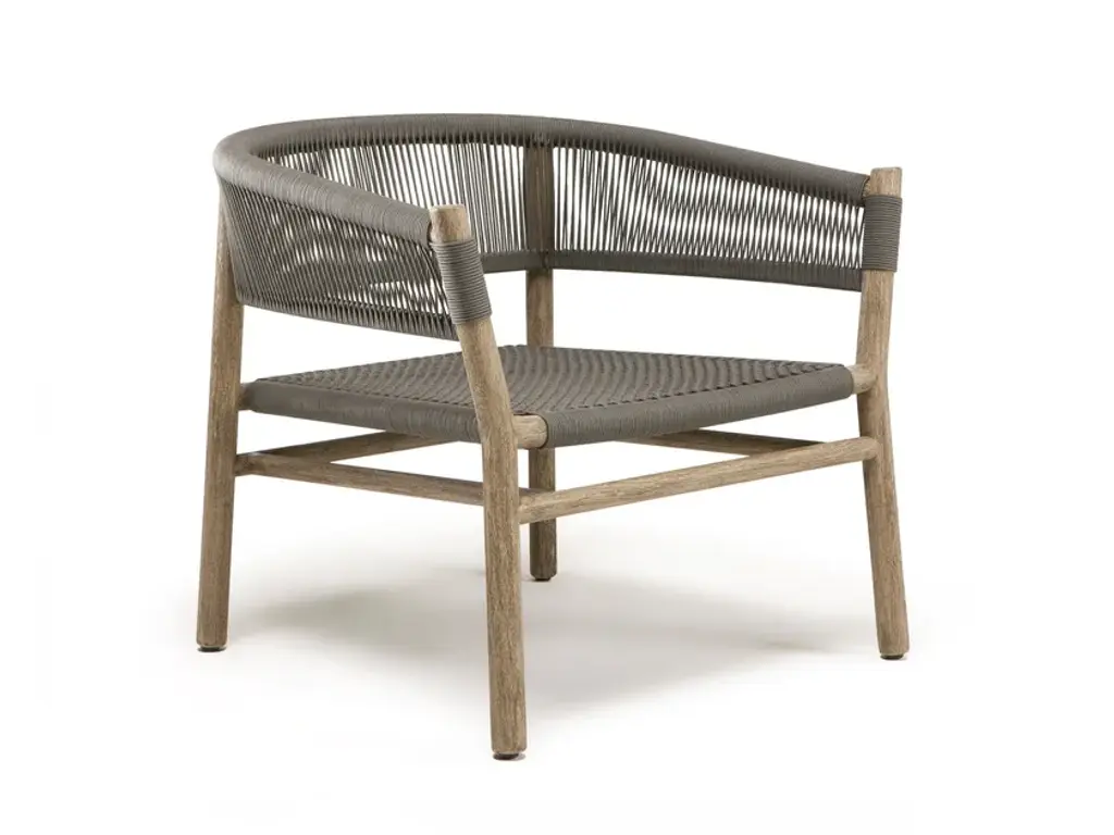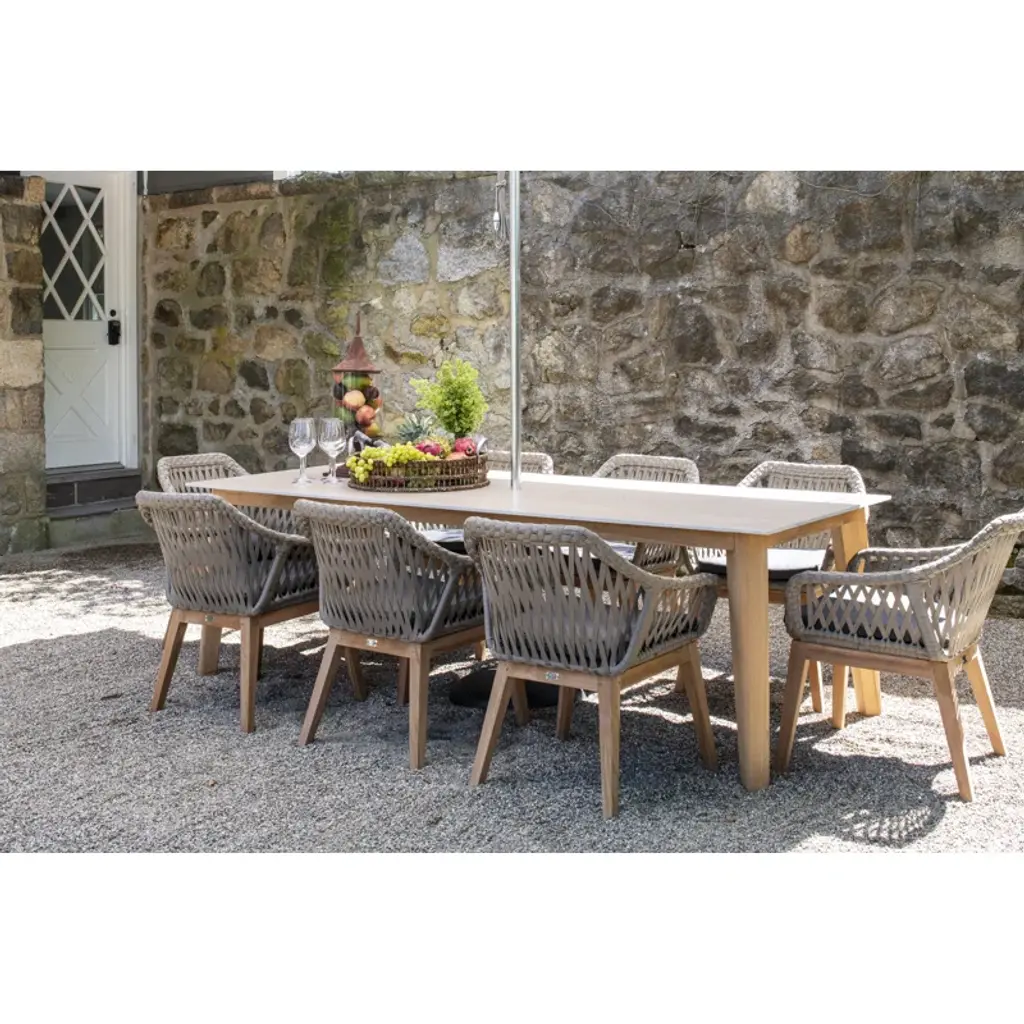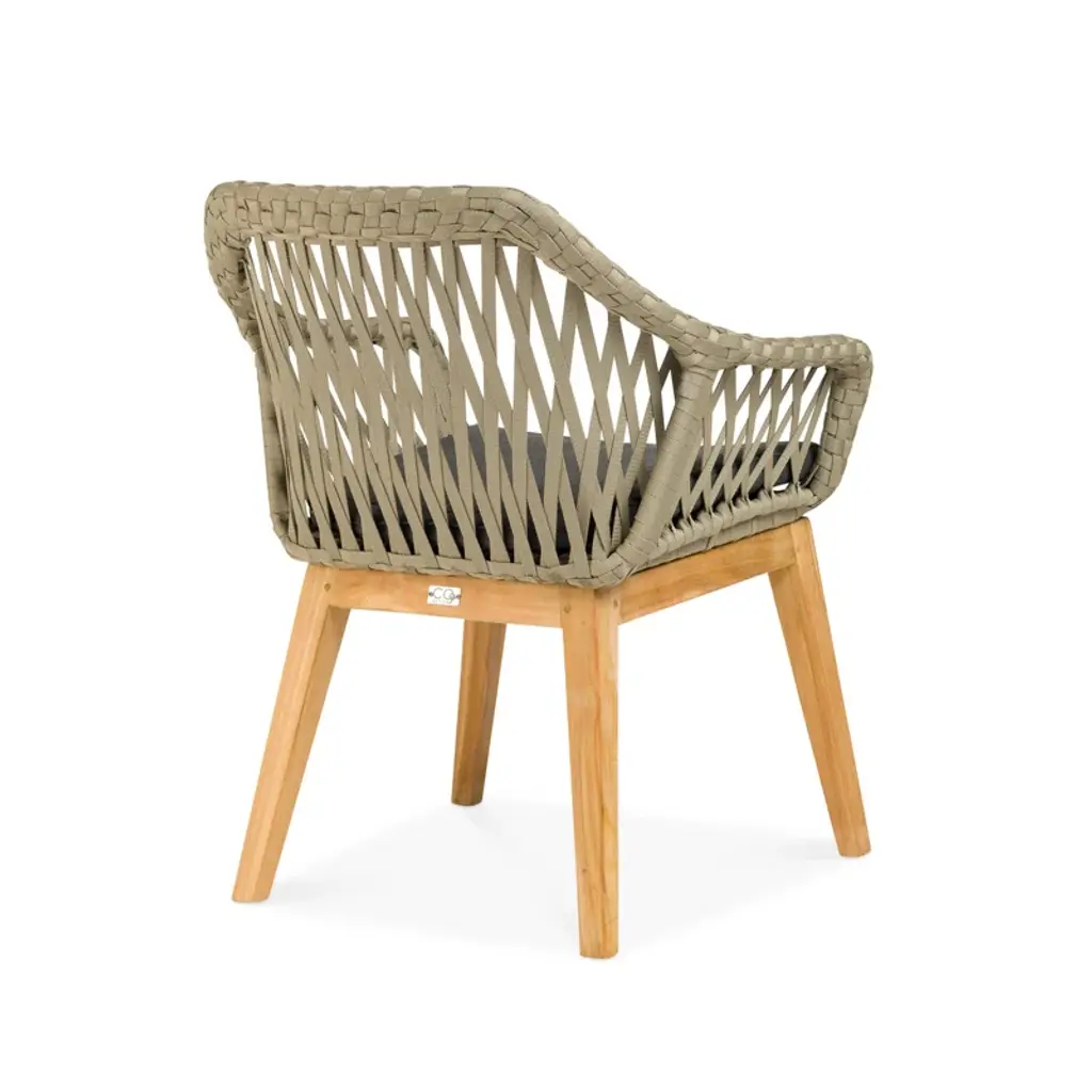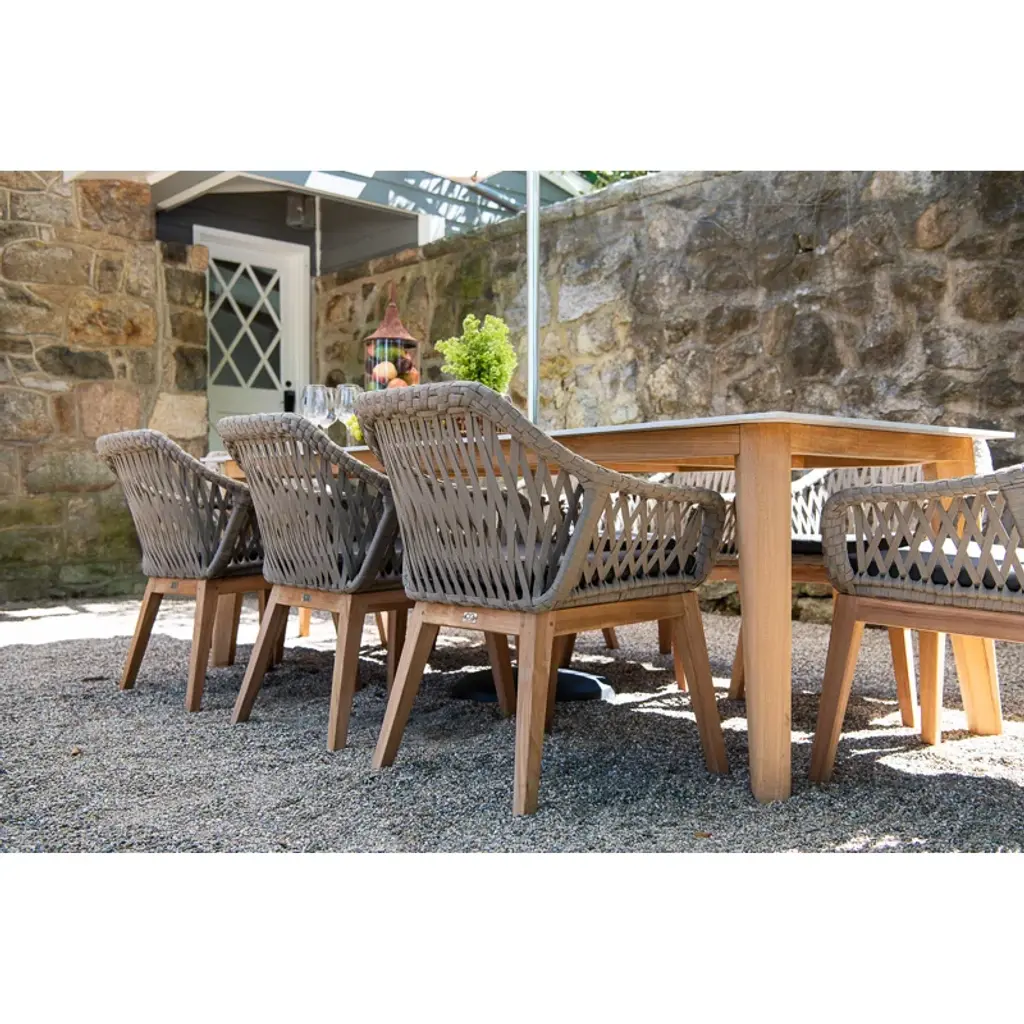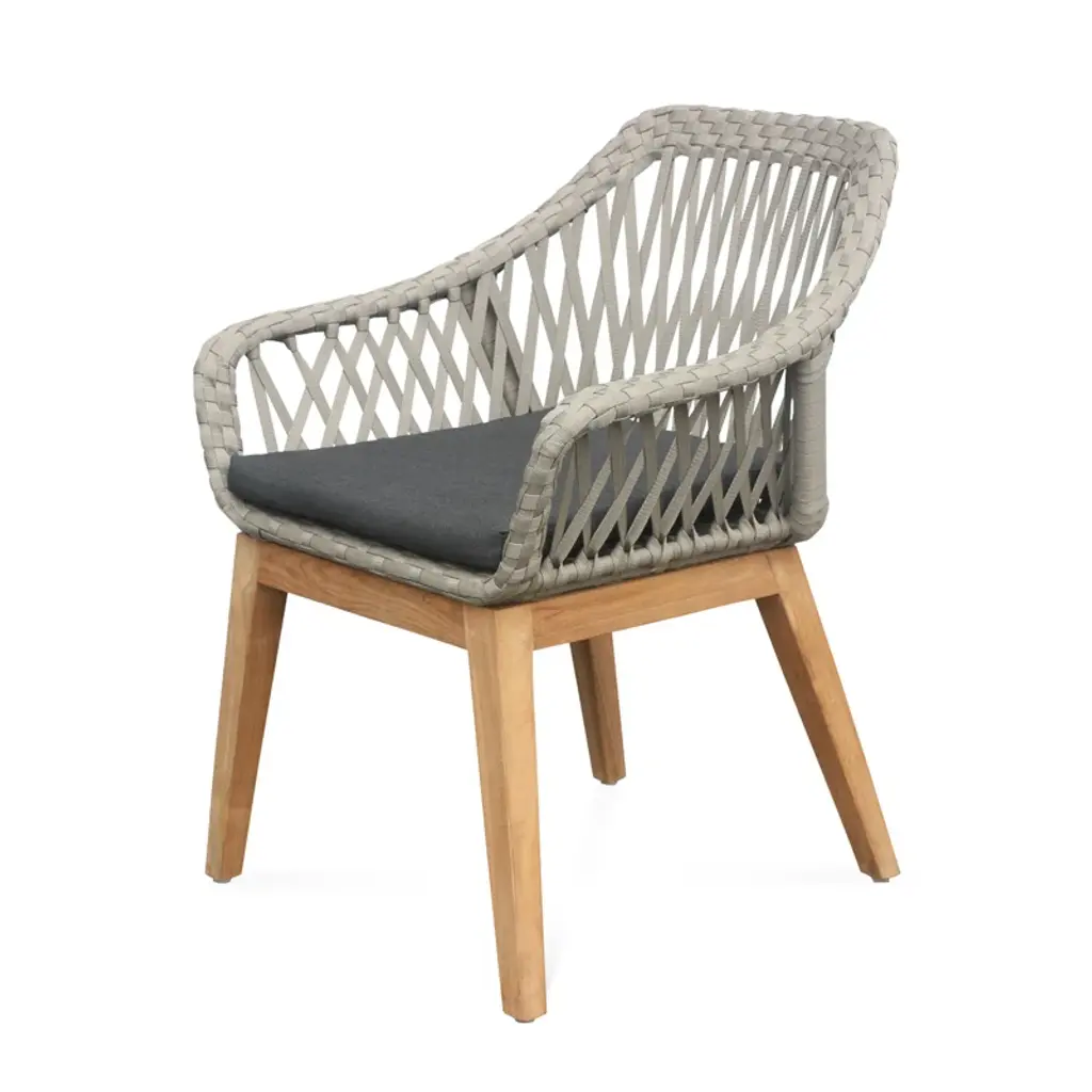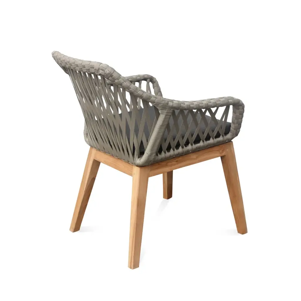 This Ty Teak Patio Dining Armchair with Cushion with its wide lacing in soft gray highlights the skilled craft of individual artisans utilizing generational techniques to create the perfect blend of natural wicker and refined teak legs.